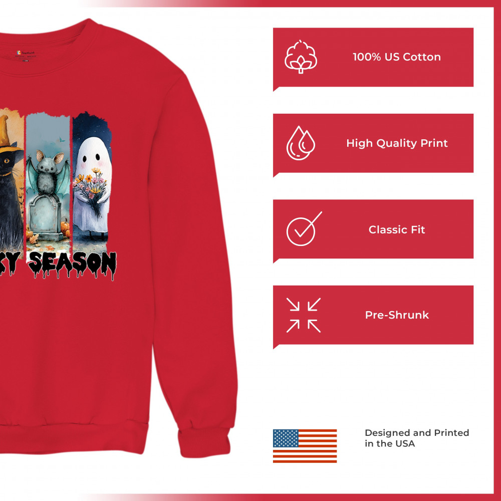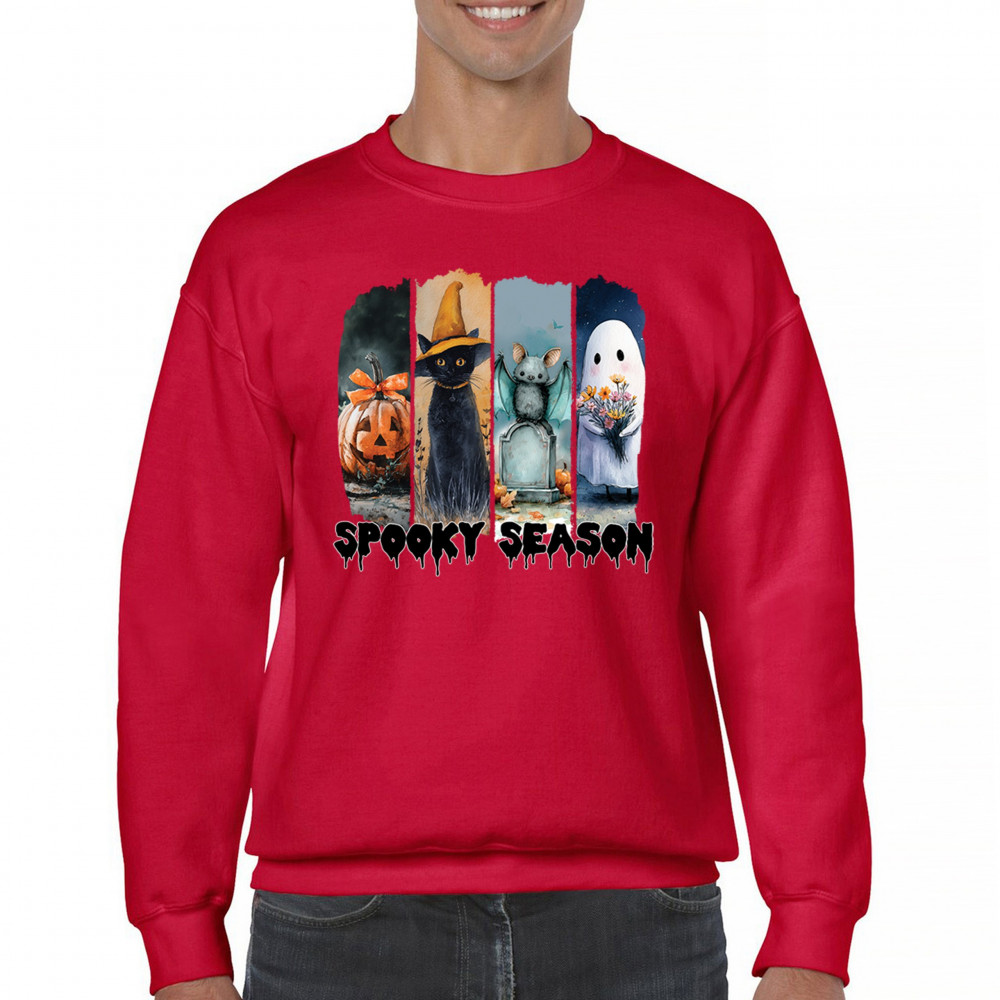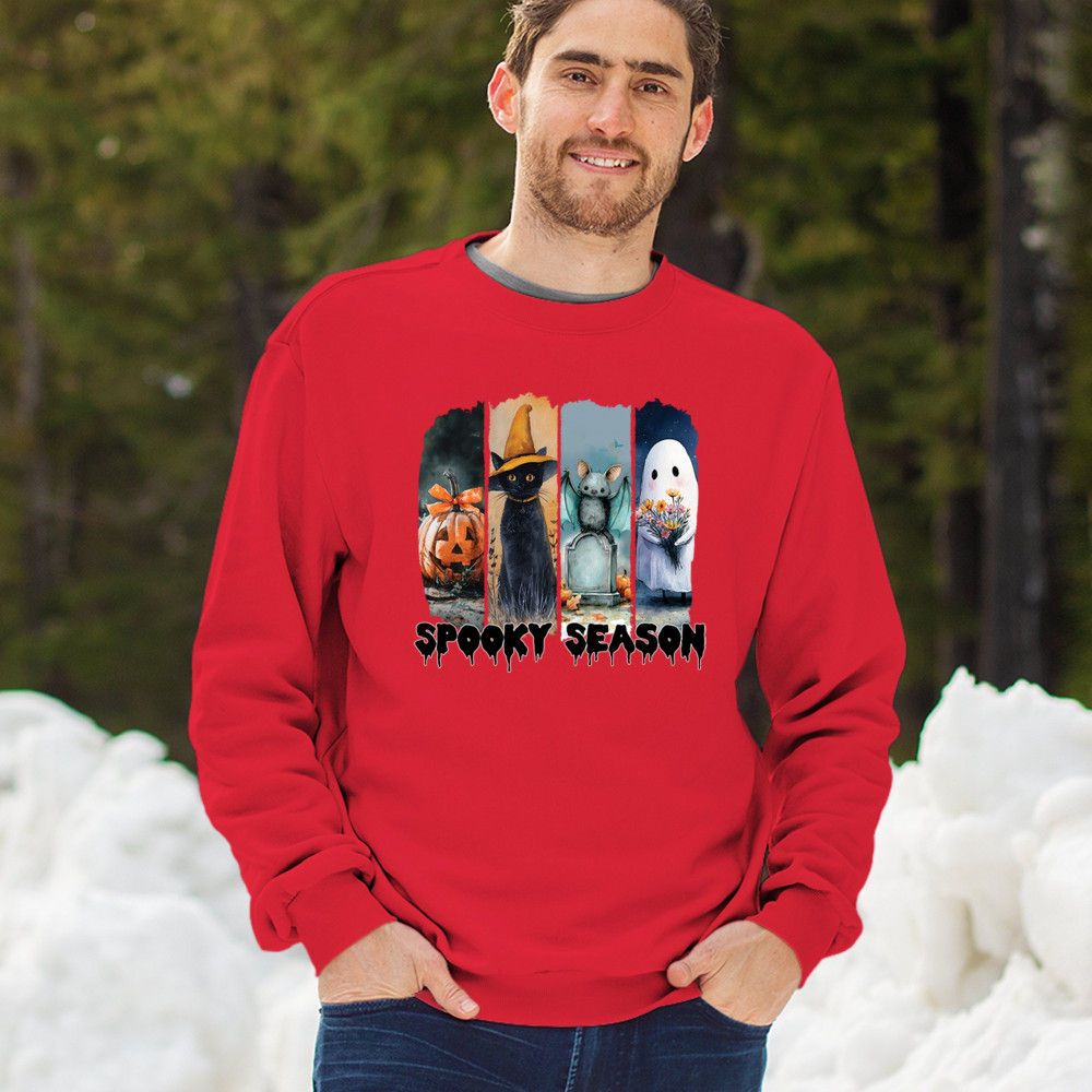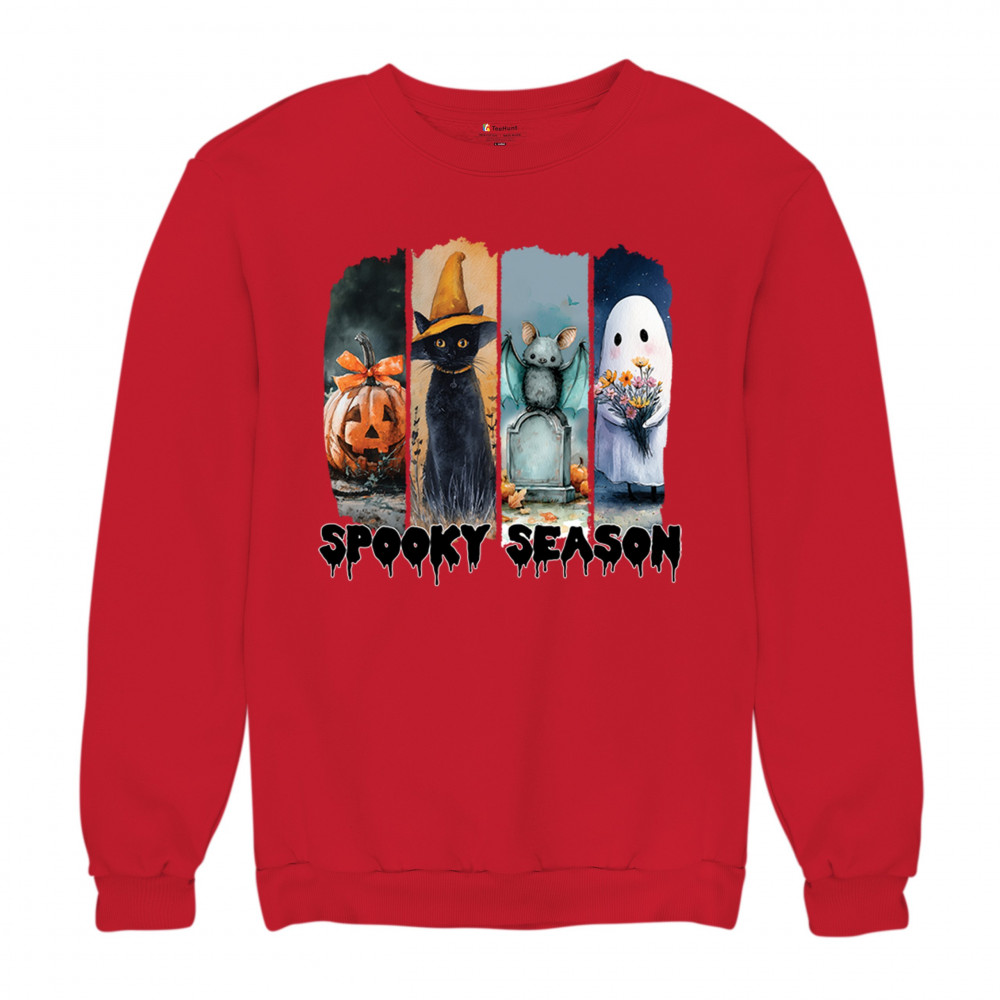 Spooky Season design with scary black cat, jack o lantern, haunted ghost house, and cute ghost. Perfect for October 31, trick or treat, and fall fun.