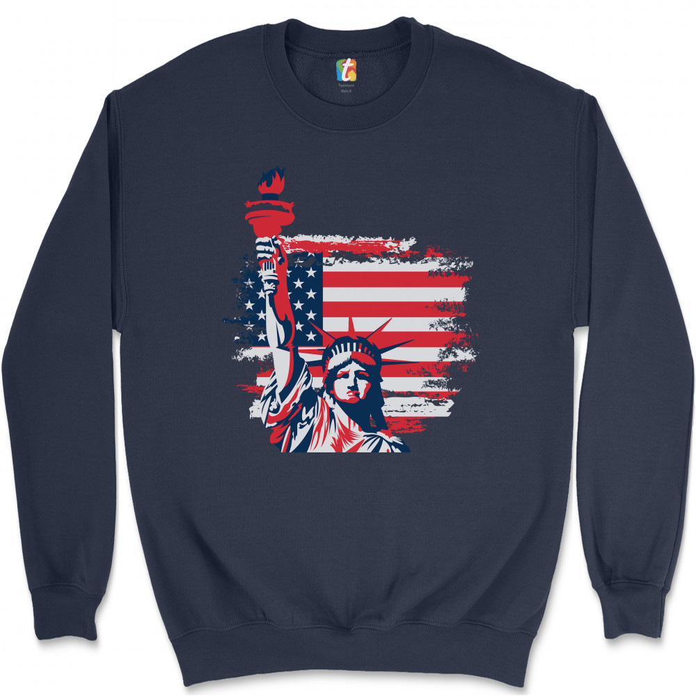 A patriotic print featuring a dripping silhouette of a bald eagle. The body is painted blue with lots of stars on it and the feathers of the wings, painted red, resemble the stripes of the American Flag. Over the wings there is a text written: "Land of the free home of the brave". Great choice to wear on Independence Day or any other patriotic holiday.