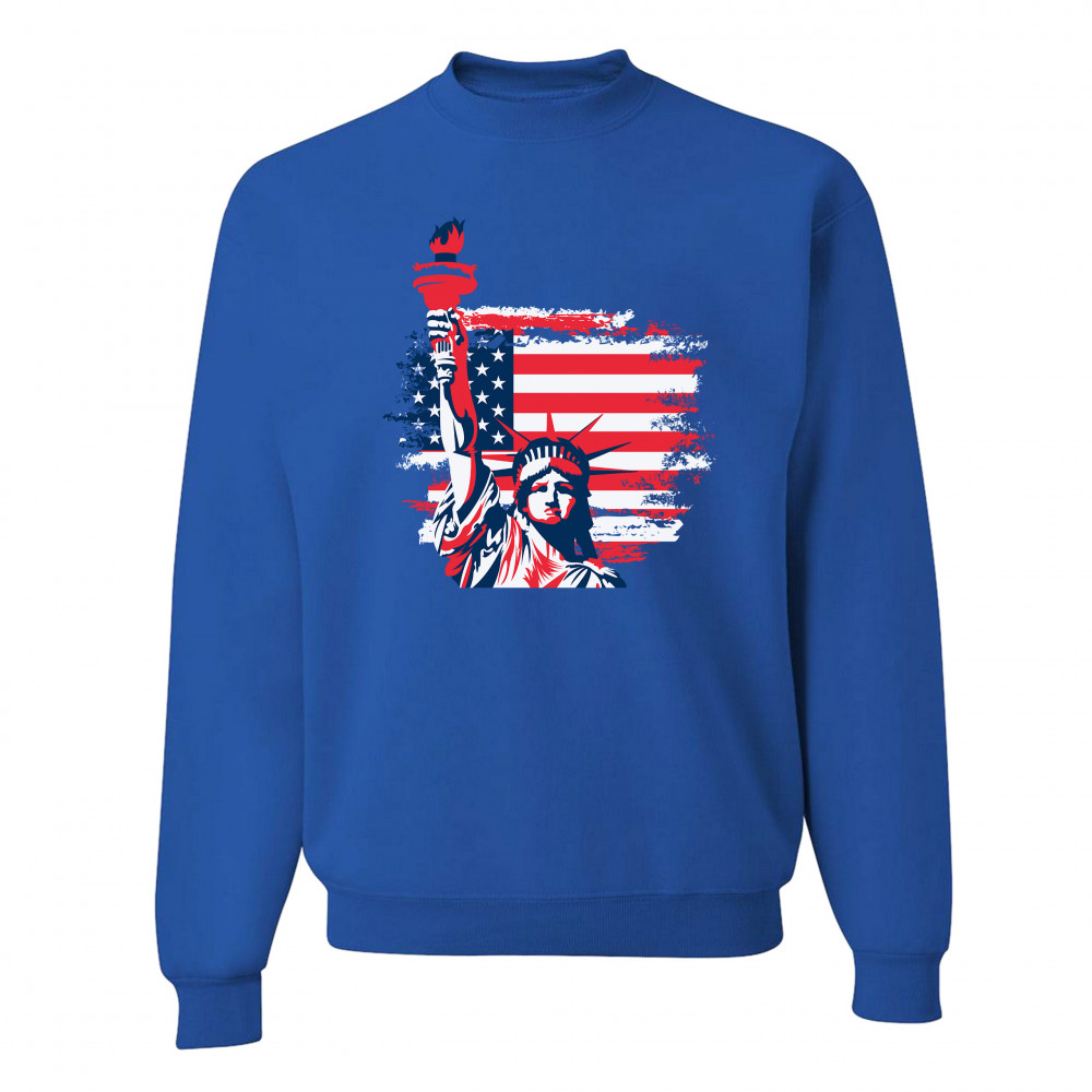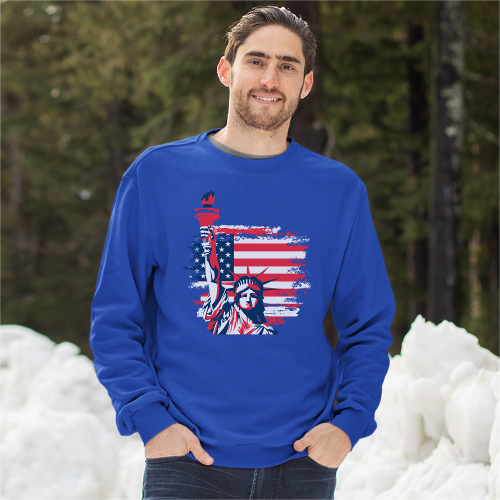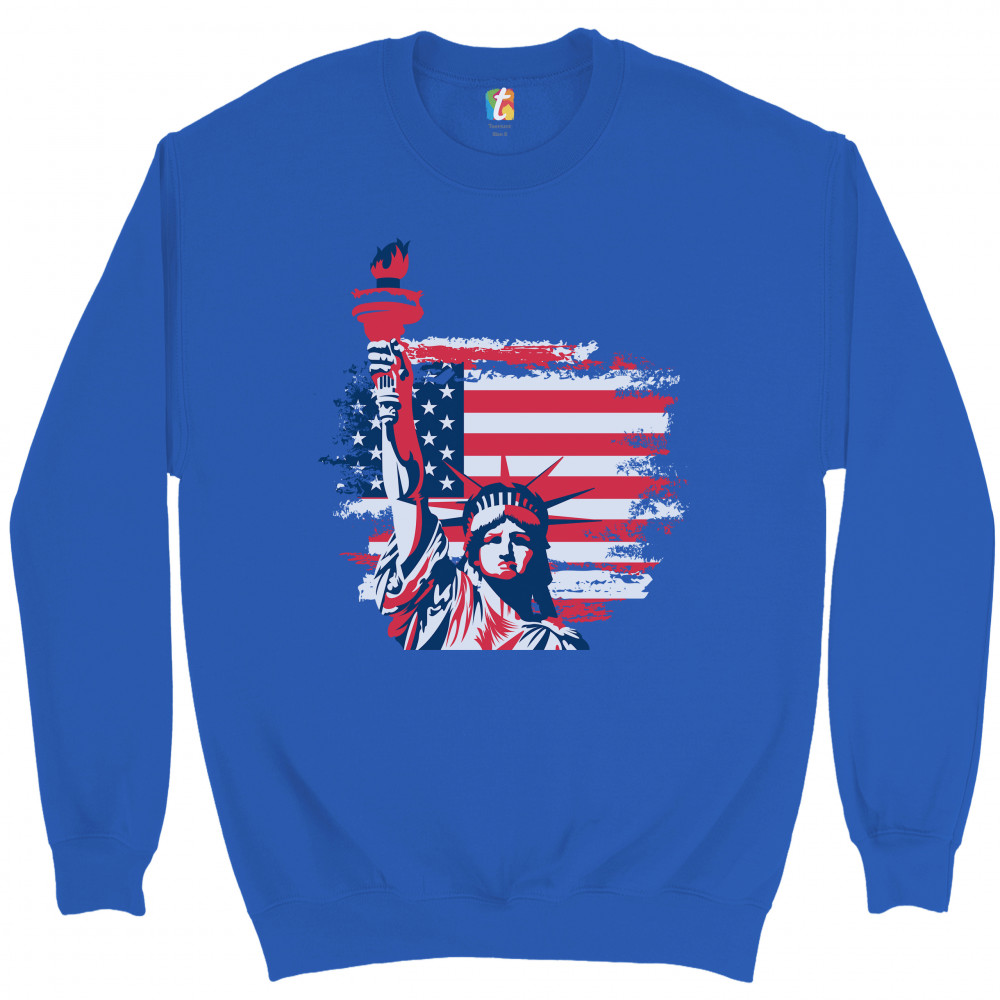 A patriotic print featuring a dripping silhouette of a bald eagle. The body is painted blue with lots of stars on it and the feathers of the wings, painted red, resemble the stripes of the American Flag. Over the wings there is a text written: "Land of the free home of the brave". Great choice to wear on Independence Day or any other patriotic holiday.