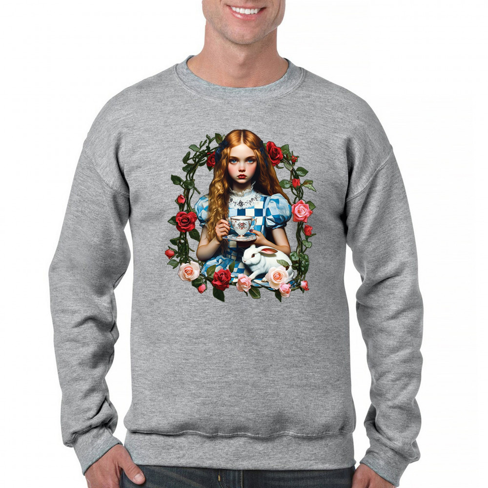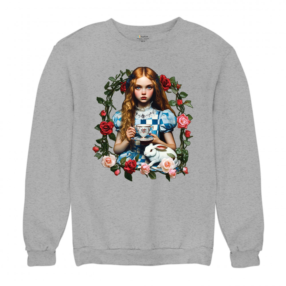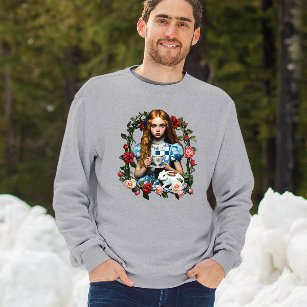 Step into a storybook dream with this Wonderland-inspired design featuring a young girl at a tea party with her white rabbit companion. Framed by roses, it evokes vintage charm, fantasy, and magical nostalgia. Ideal for bookworms, collectors, and lovers of fairytales, it blends whimsical elegance with timeless childhood wonder.
