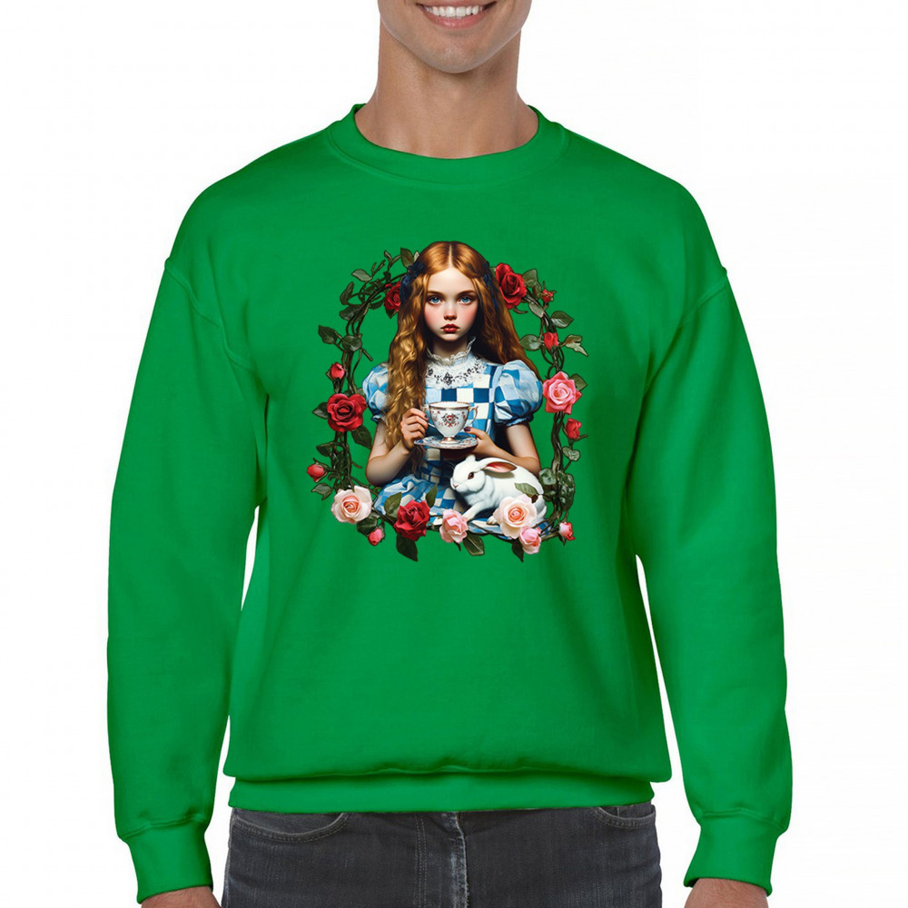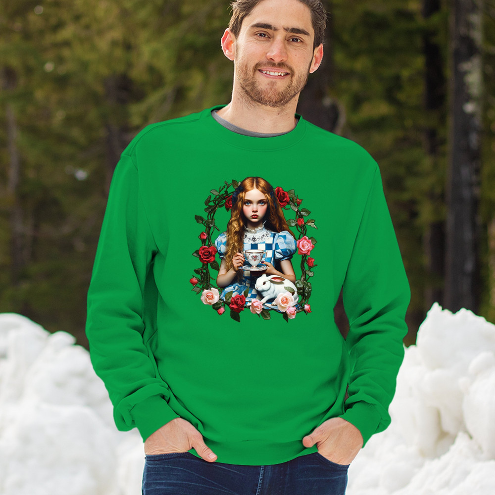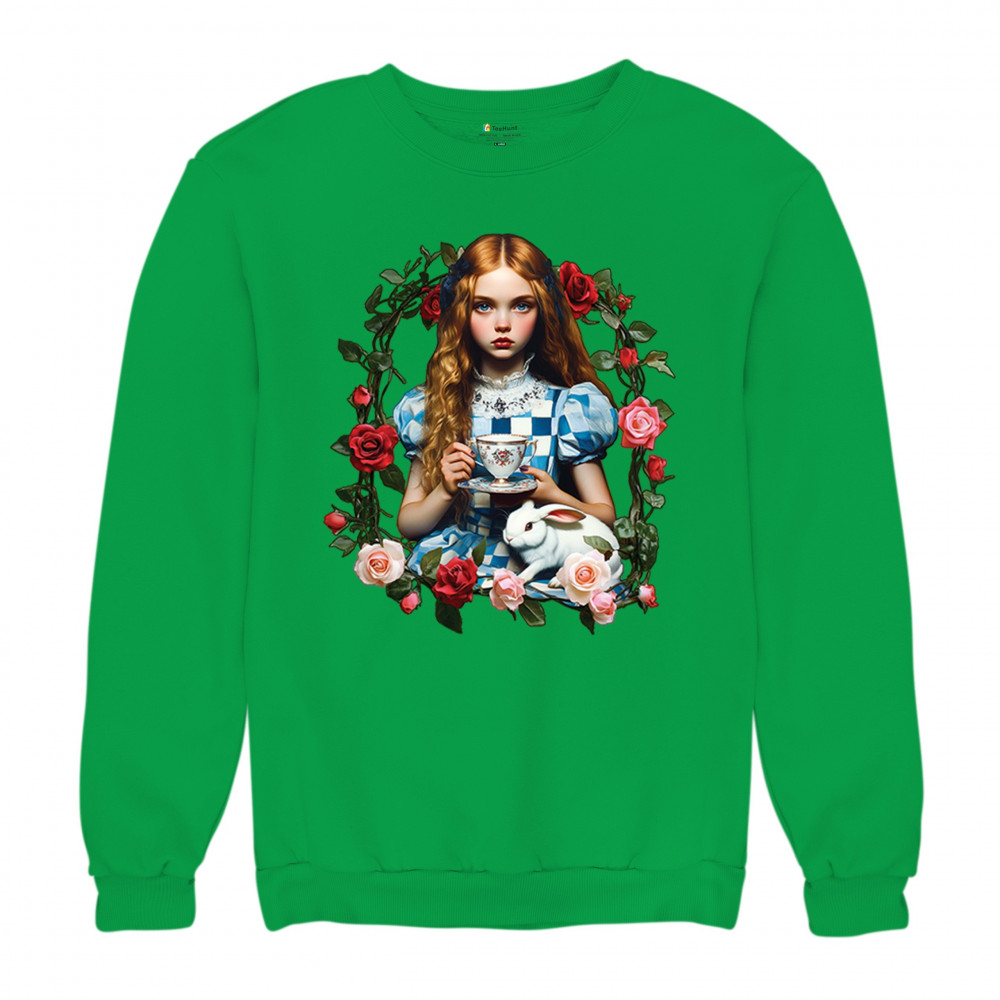 Step into a storybook dream with this Wonderland-inspired design featuring a young girl at a tea party with her white rabbit companion. Framed by roses, it evokes vintage charm, fantasy, and magical nostalgia. Ideal for bookworms, collectors, and lovers of fairytales, it blends whimsical elegance with timeless childhood wonder.