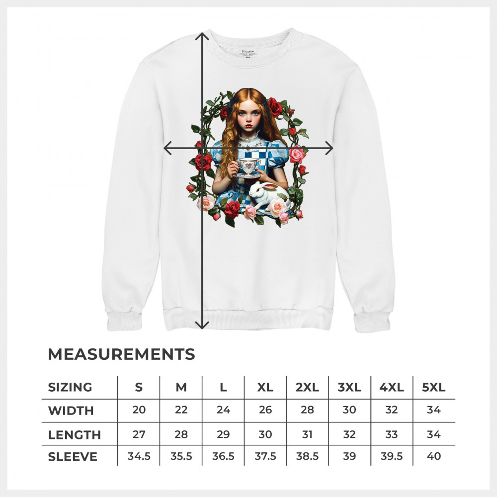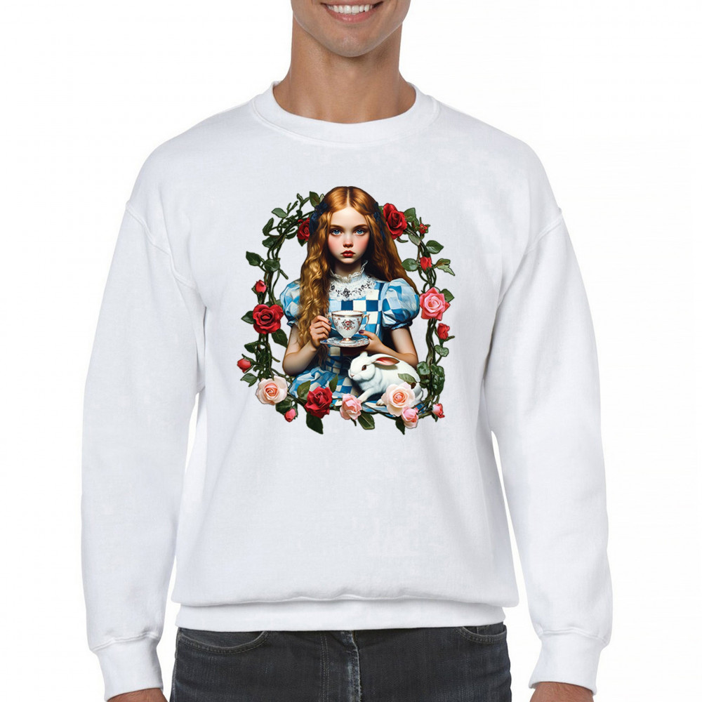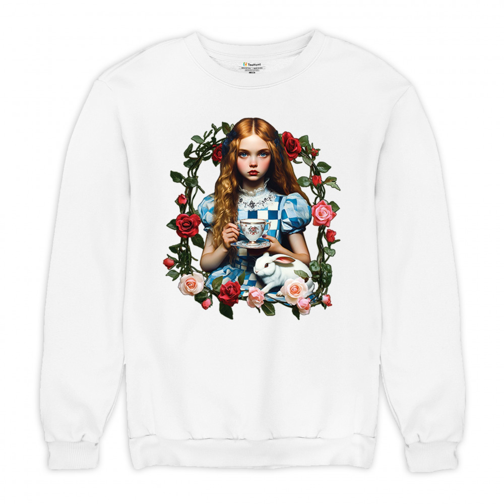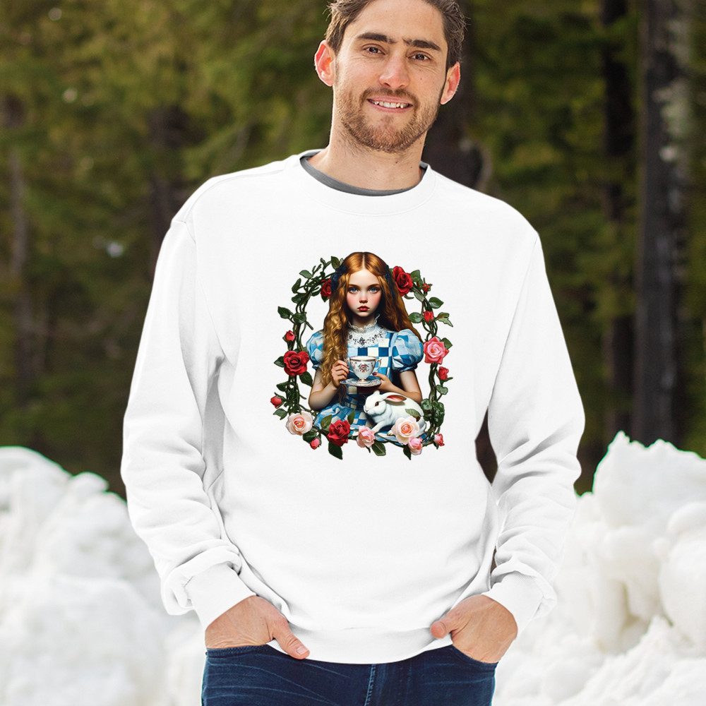 Step into a storybook dream with this Wonderland-inspired design featuring a young girl at a tea party with her white rabbit companion. Framed by roses, it evokes vintage charm, fantasy, and magical nostalgia. Ideal for bookworms, collectors, and lovers of fairytales, it blends whimsical elegance with timeless childhood wonder.