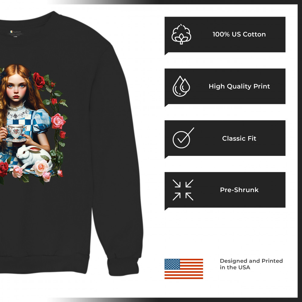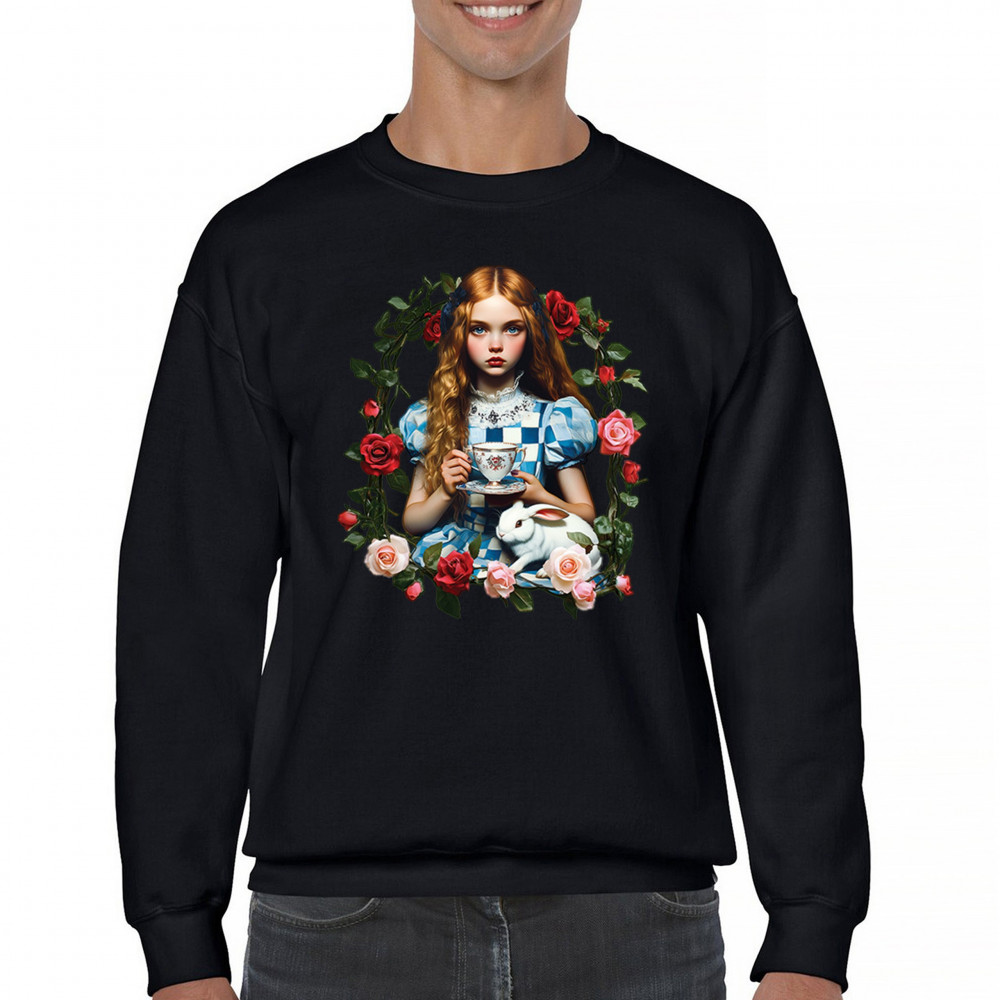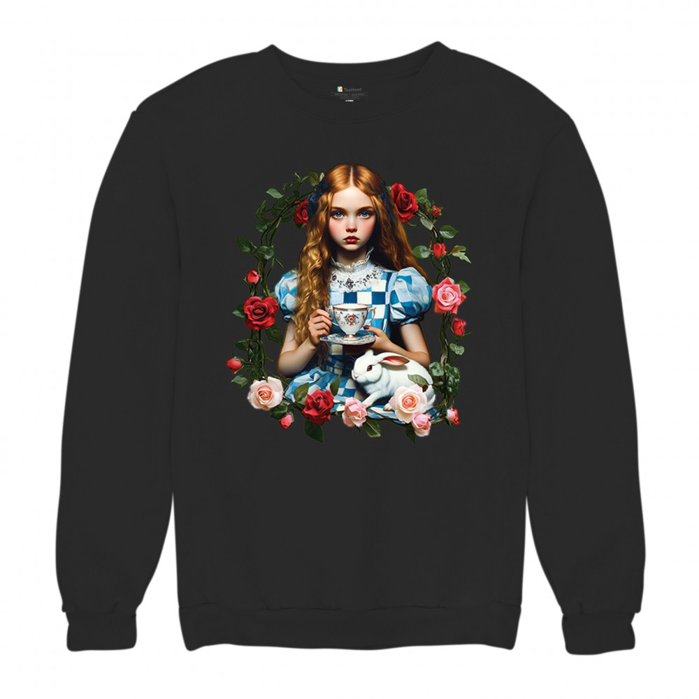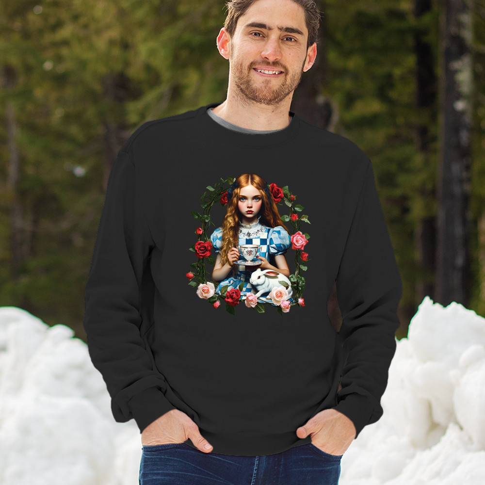 Step into a storybook dream with this Wonderland-inspired design featuring a young girl at a tea party with her white rabbit companion. Framed by roses, it evokes vintage charm, fantasy, and magical nostalgia. Ideal for bookworms, collectors, and lovers of fairytales, it blends whimsical elegance with timeless childhood wonder.