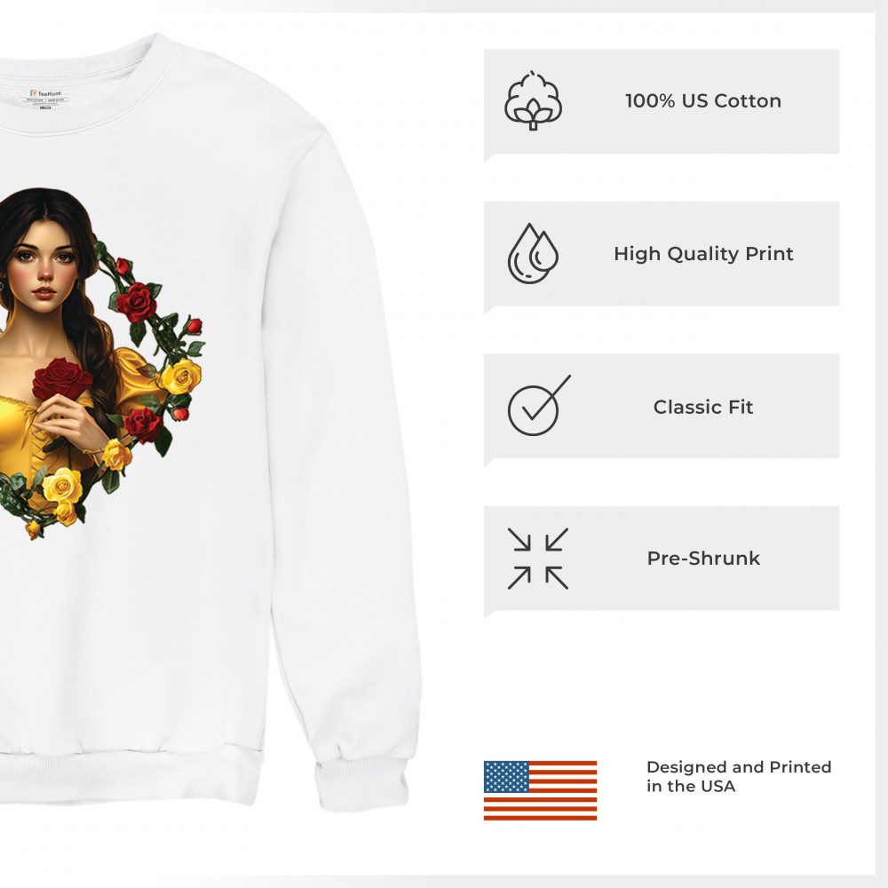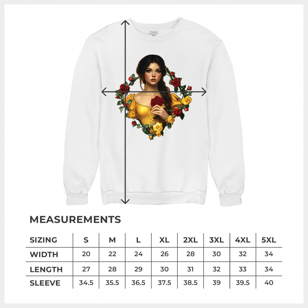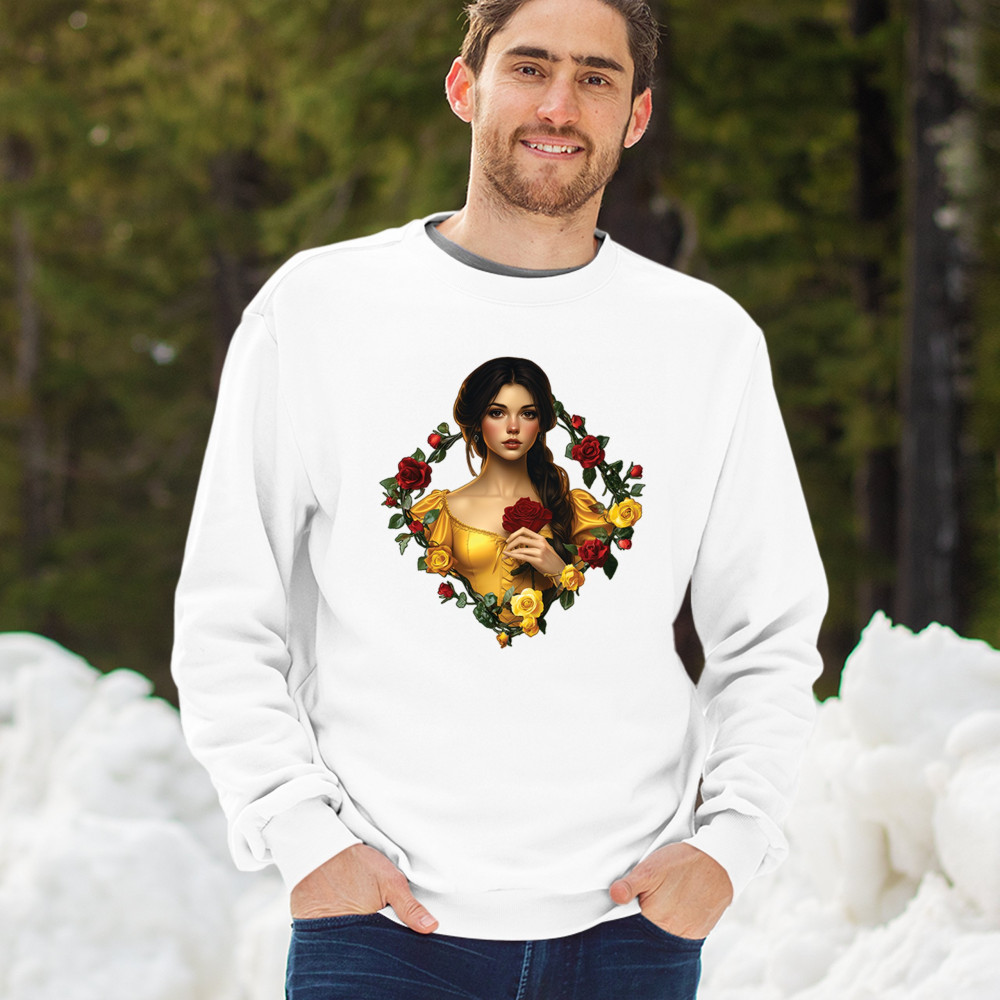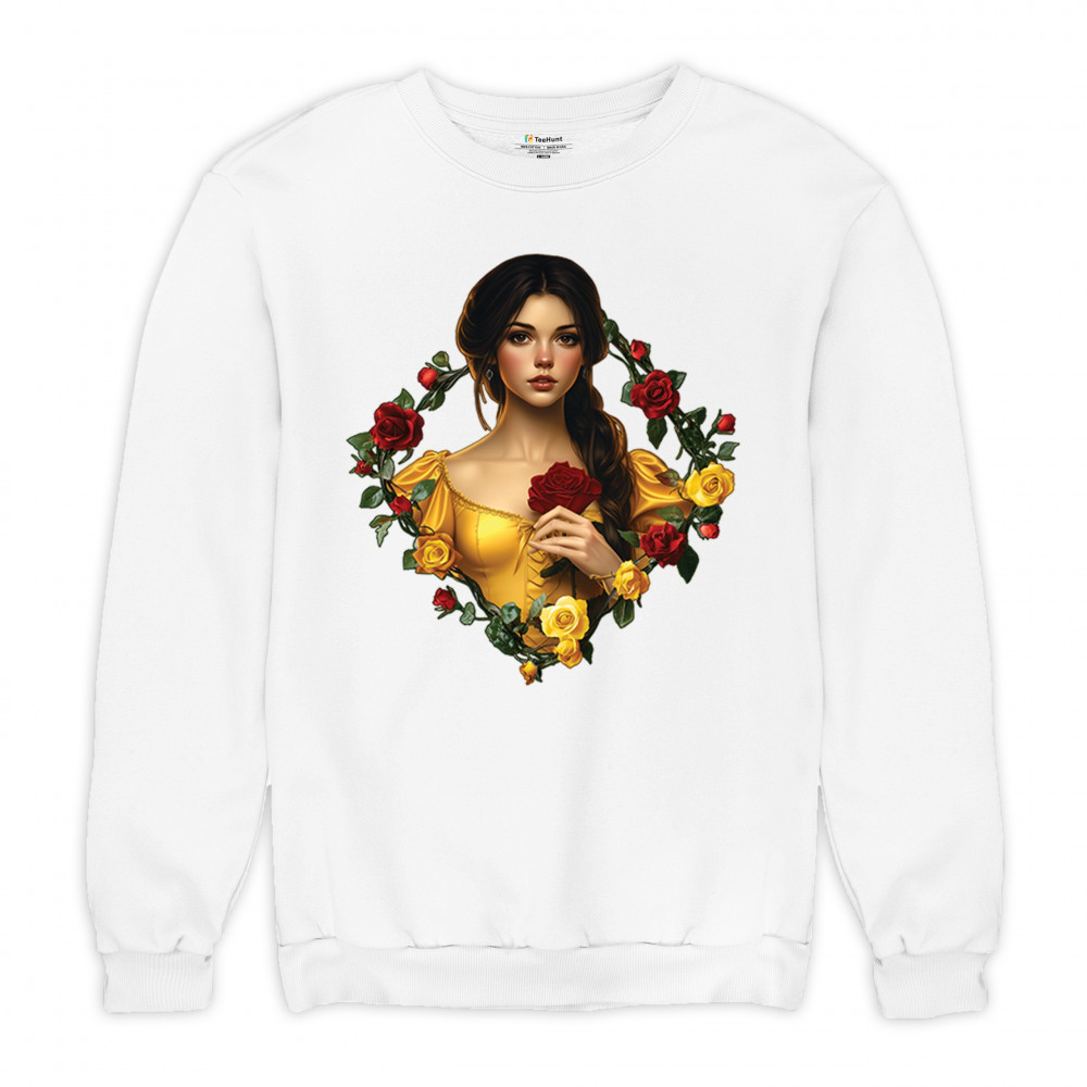 Inspired by classic fairytales, this design features a girl in a yellow gown holding a red rose, framed by rich red and yellow roses. A tribute to Beauty and the Beast, it radiates warmth, romance, and timeless fantasy. Perfect for storybook lovers, enchanted art collectors, or those drawn to magical, symbolic imagery filled with beauty and grace.