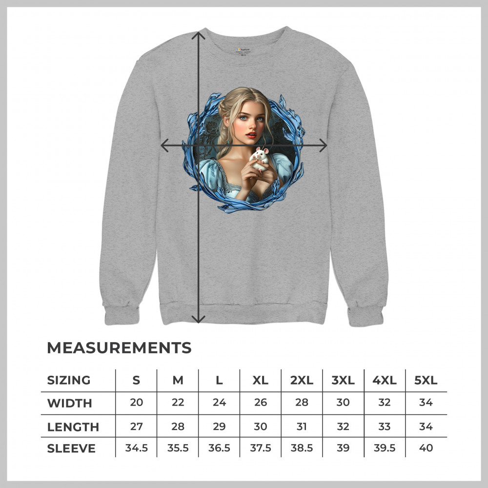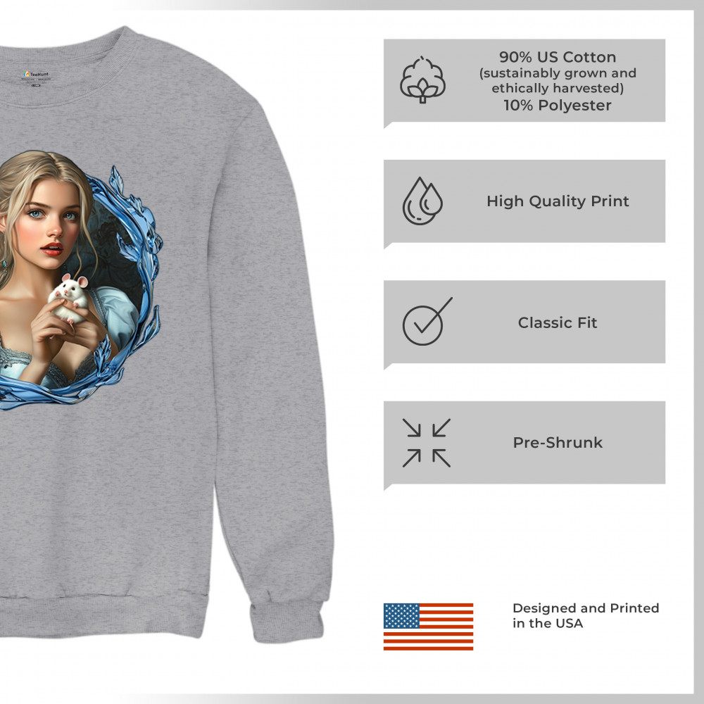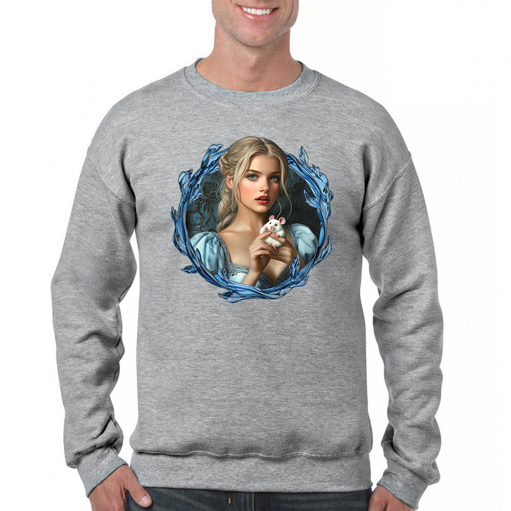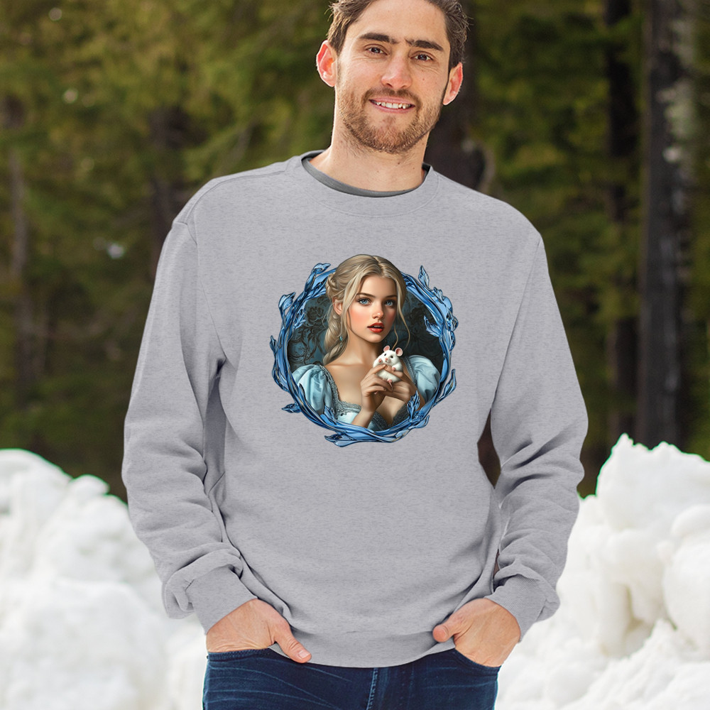 A whimsical design inspired by fairytales and Cinderella magic, featuring a blonde girl in a blue dress holding a white mouse. The icy blue leaf frame evokes enchantment and transformation. With soft, vintage tones and a dreamy feel, it’s a charming tribute to kindness, fantasy, animal companionship, and gentle storytelling magic.
