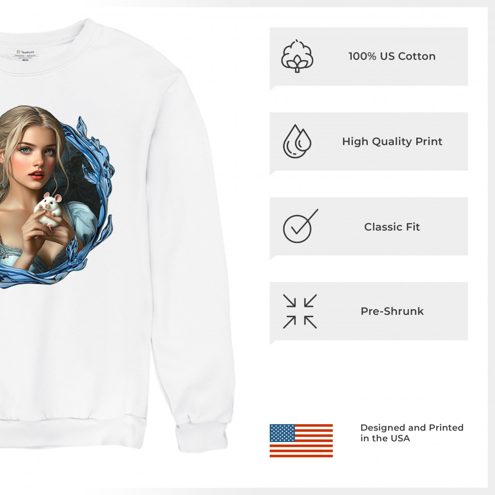 A whimsical design inspired by fairytales and Cinderella magic, featuring a blonde girl in a blue dress holding a white mouse. The icy blue leaf frame evokes enchantment and transformation. With soft, vintage tones and a dreamy feel, it’s a charming tribute to kindness, fantasy, animal companionship, and gentle storytelling magic.