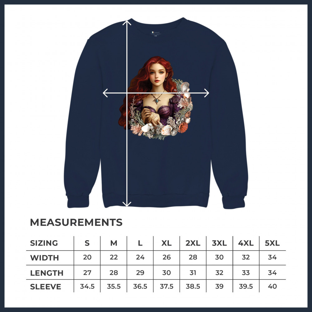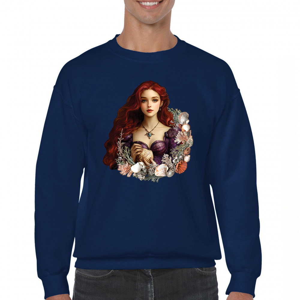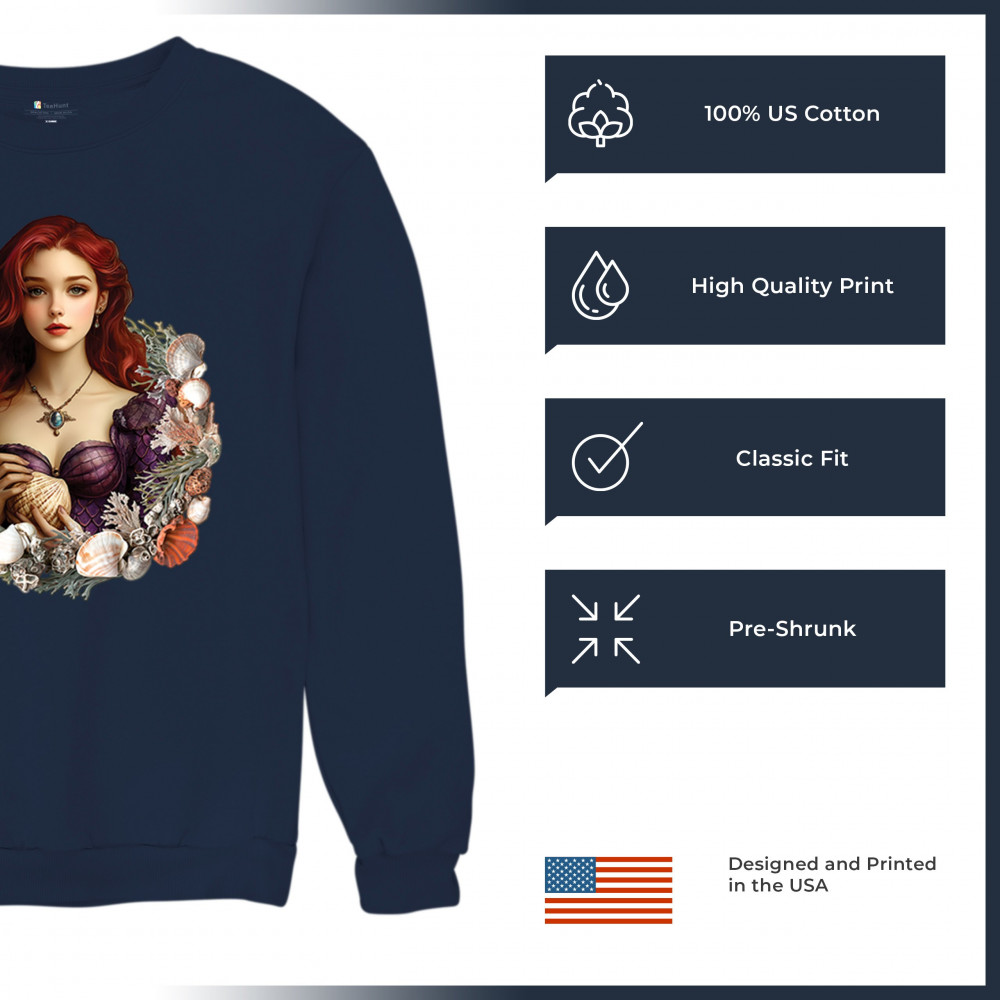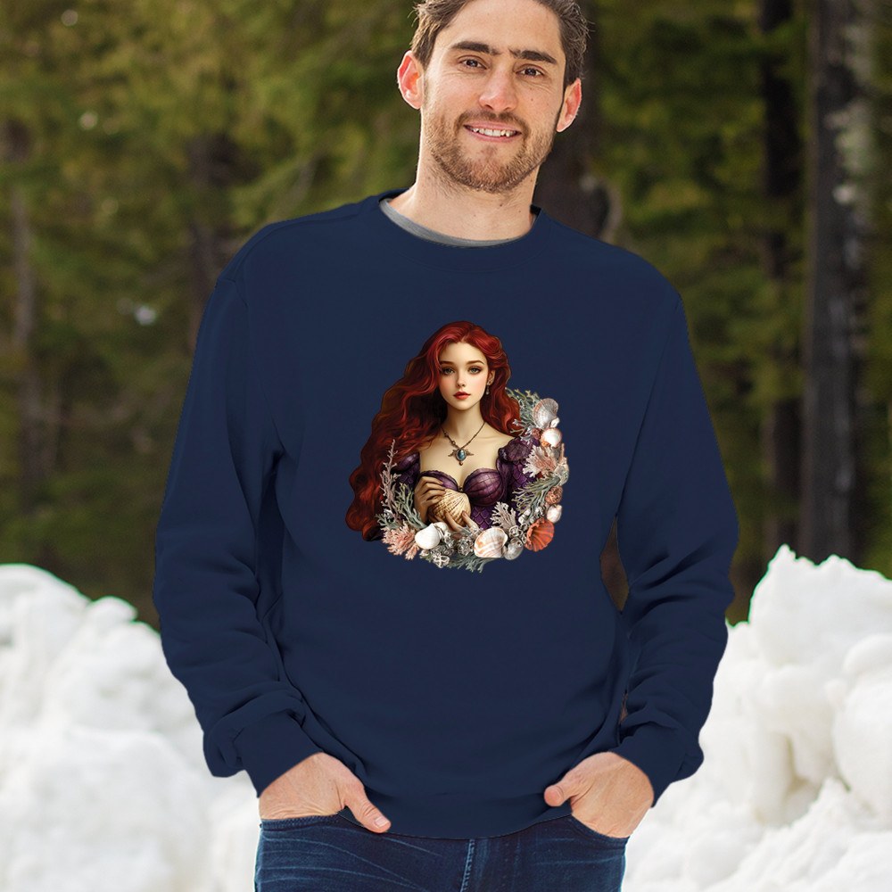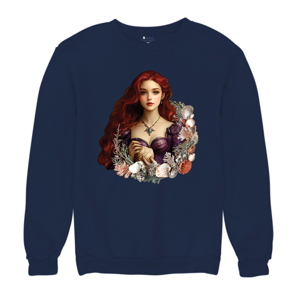 Inspired by mystical ocean themes, this design features a fantasy red-haired girl in a seashell dress, cradling a large shell. She is framed by coral, seaweed, and a shimmering array of ocean shells. With nods to classic mermaid lore and fairytale storytelling, it's perfect for fans of fantasy creatures, marine magic, and romantic ocean legends.