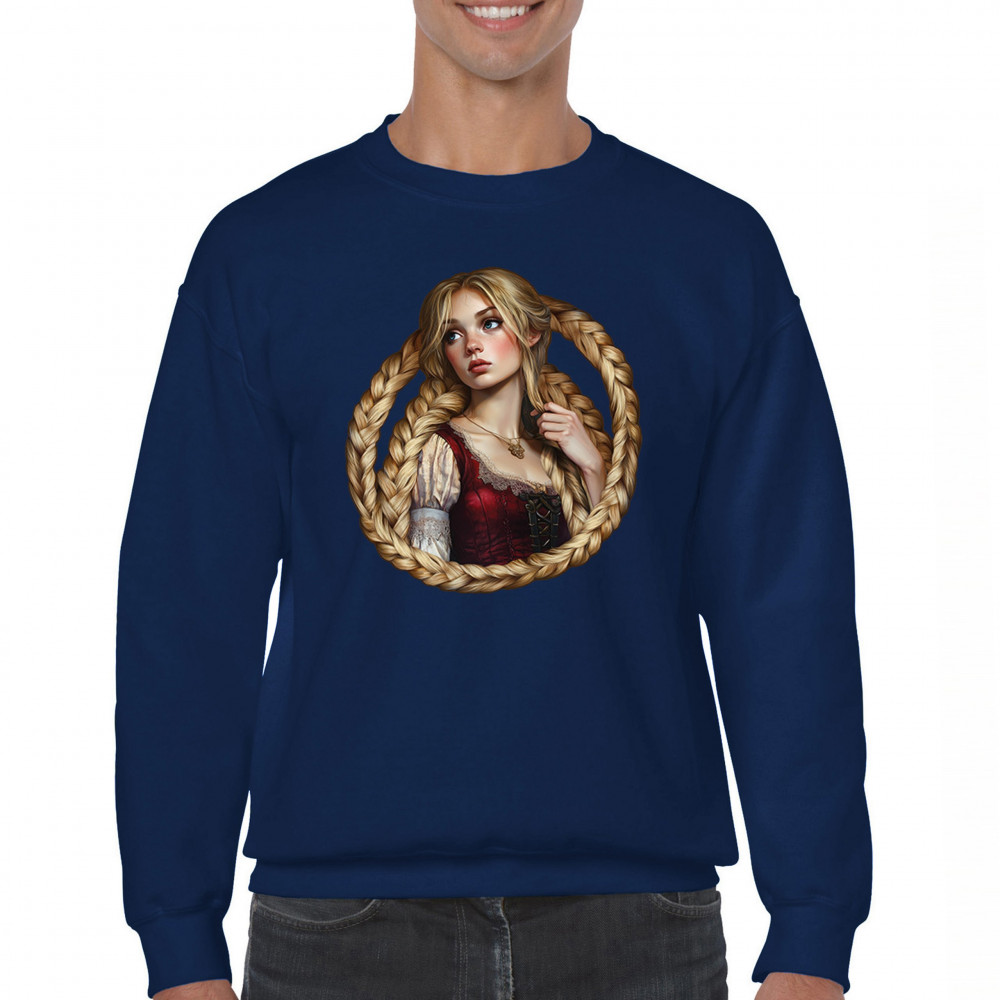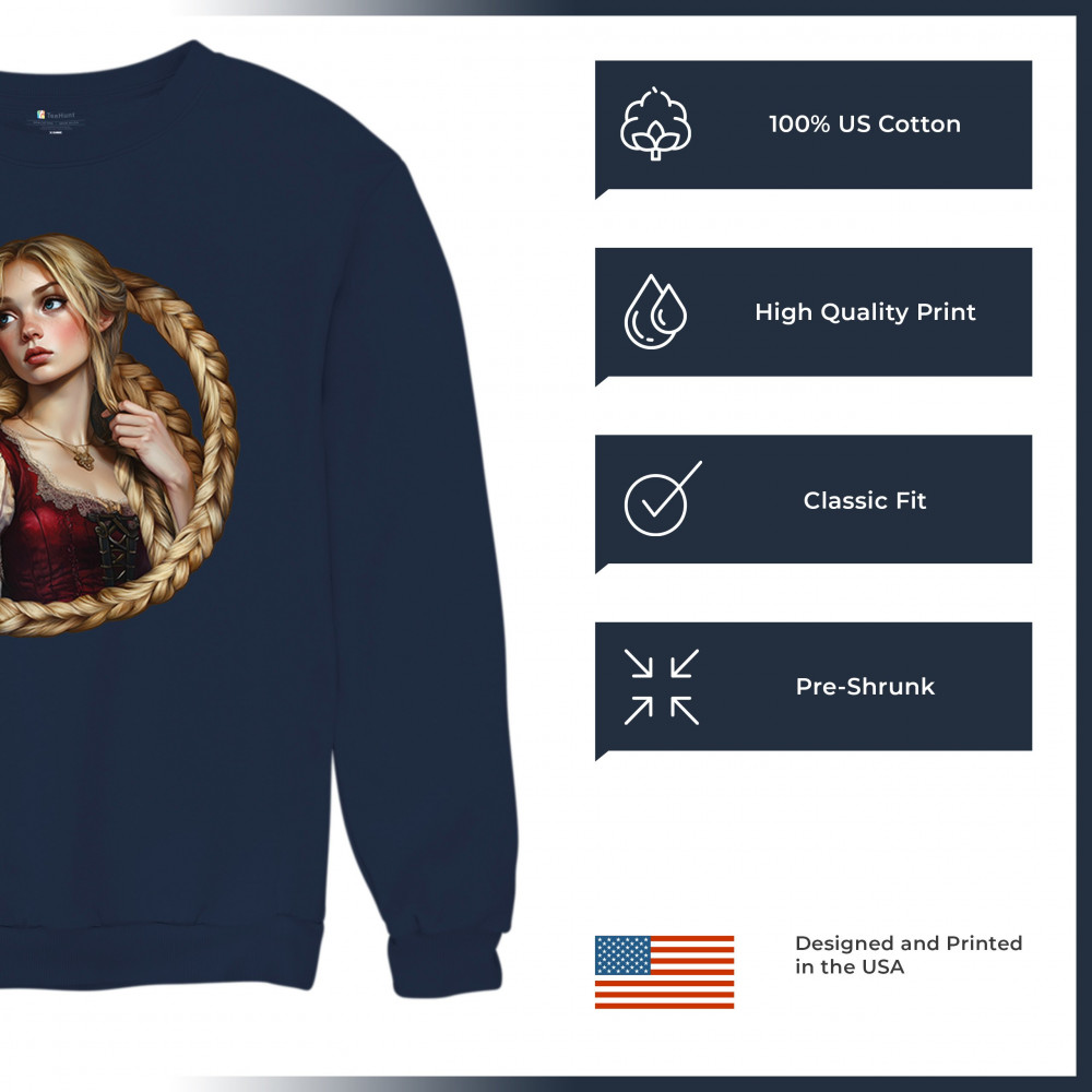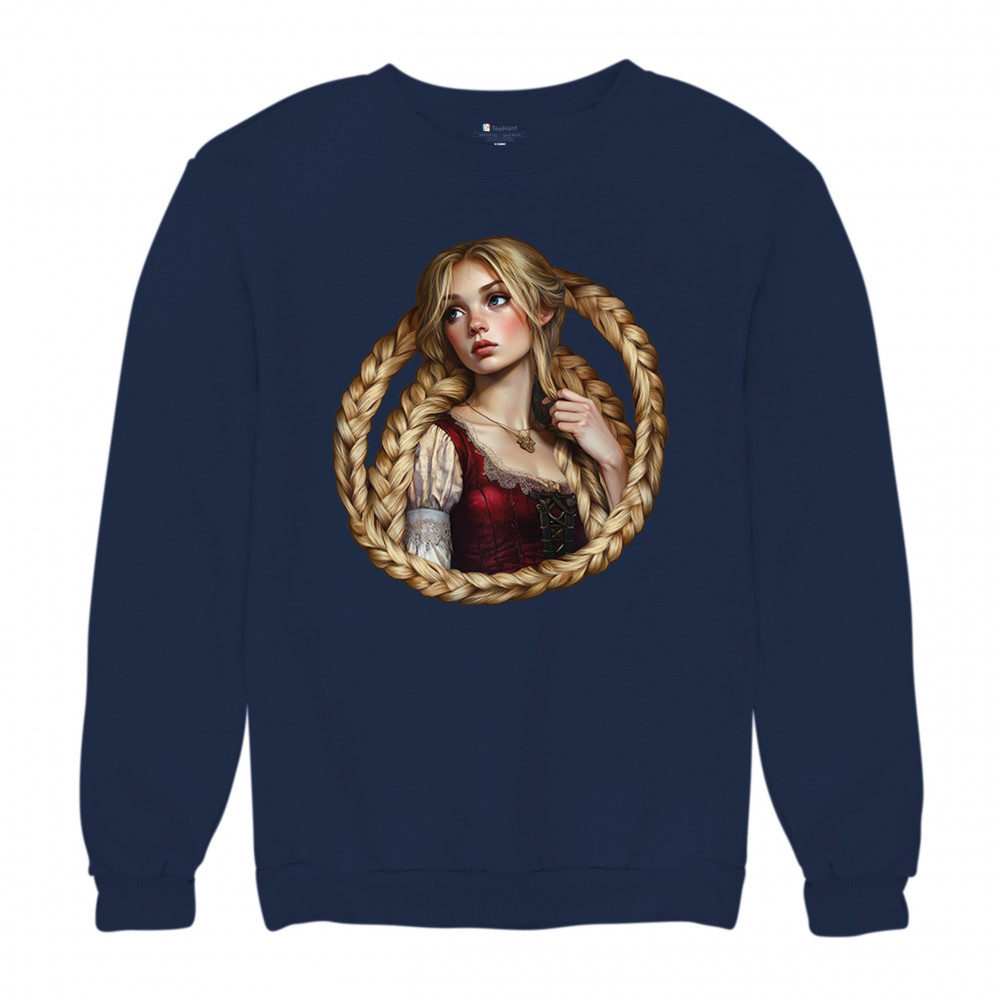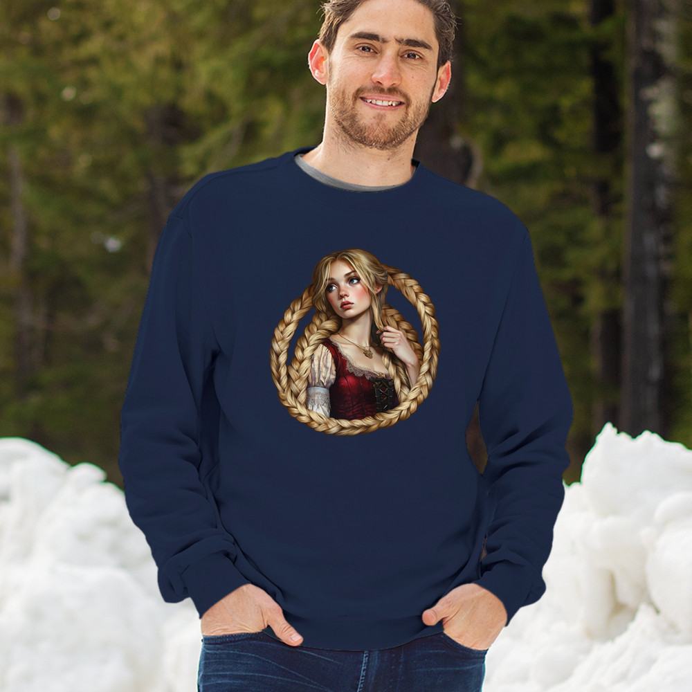 A dreamy design featuring a blonde girl with long braided hair encircling her like a frame. With vintage dress details and a wistful look, this artwork channels the essence of fairytales, romantic legends, and gentle feminine power. Ideal for fantasy lovers, folklore fans, and collectors of magical storybook themes.