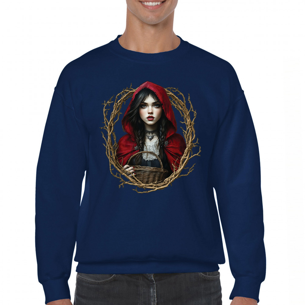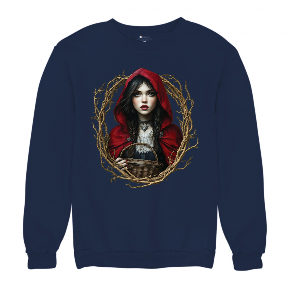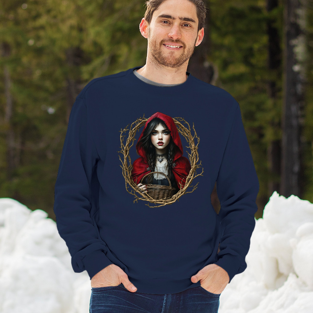 Step into a shadowy fairytale with this gothic design featuring a red-cloaked girl and twisted forest branches. Evoking themes from Red Riding Hood and folklore magic, it’s rich in fantasy, mystery, and dark aesthetic. Perfect for fantasy lovers, dark romantics, and storybook dreamers drawn to enchanted paths and eerie tales.