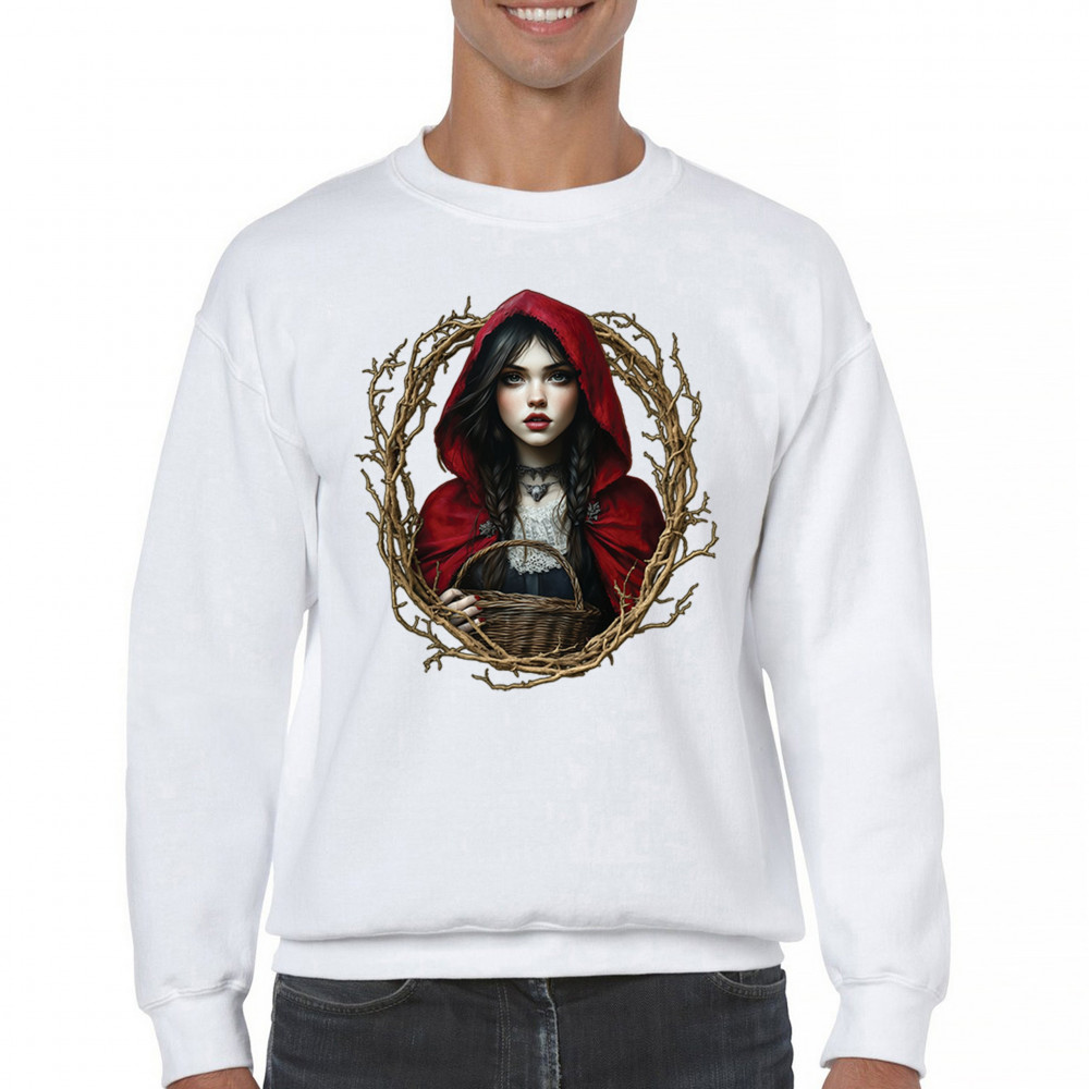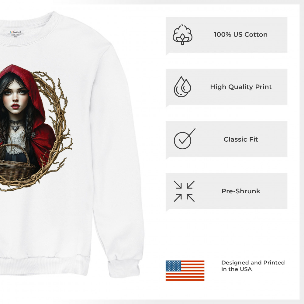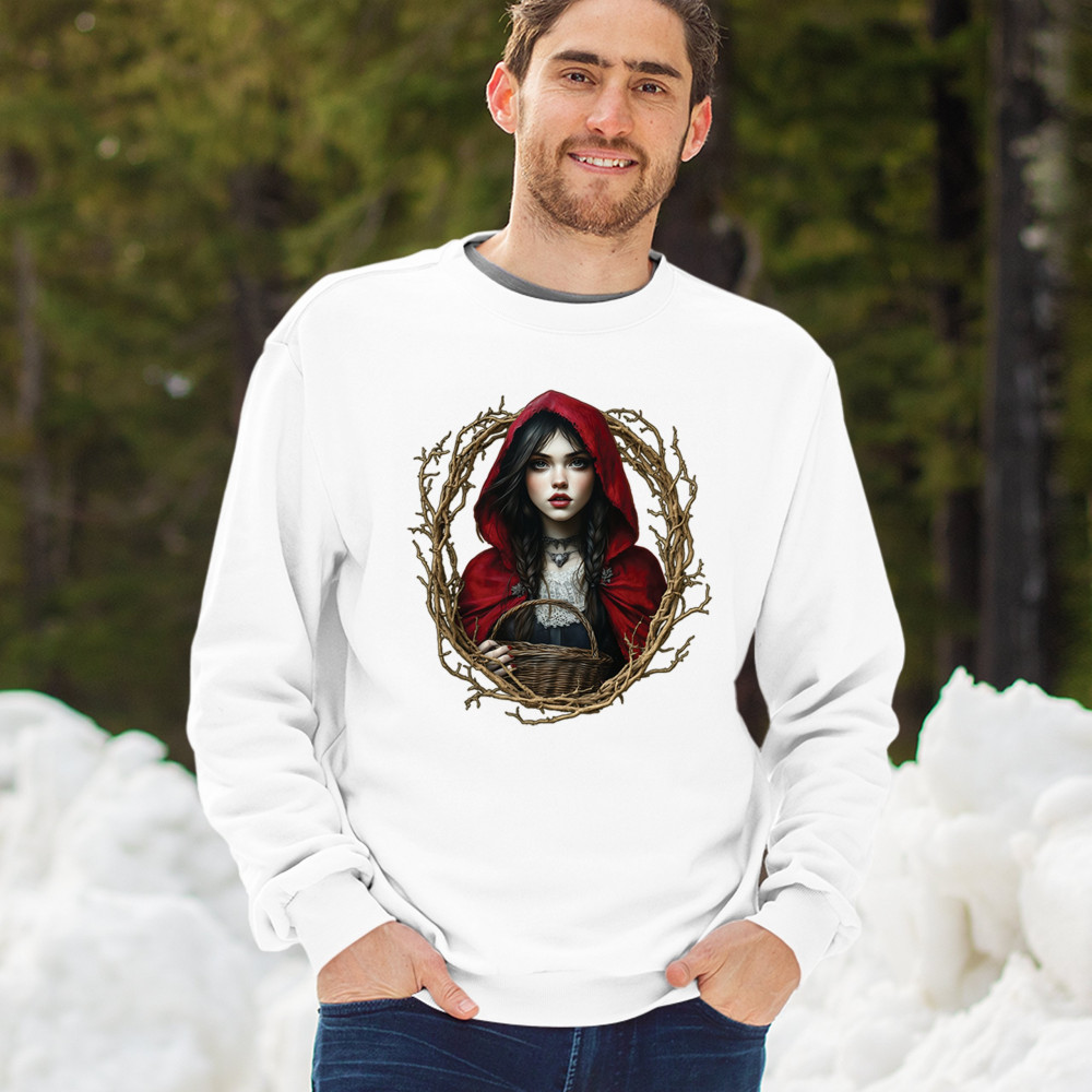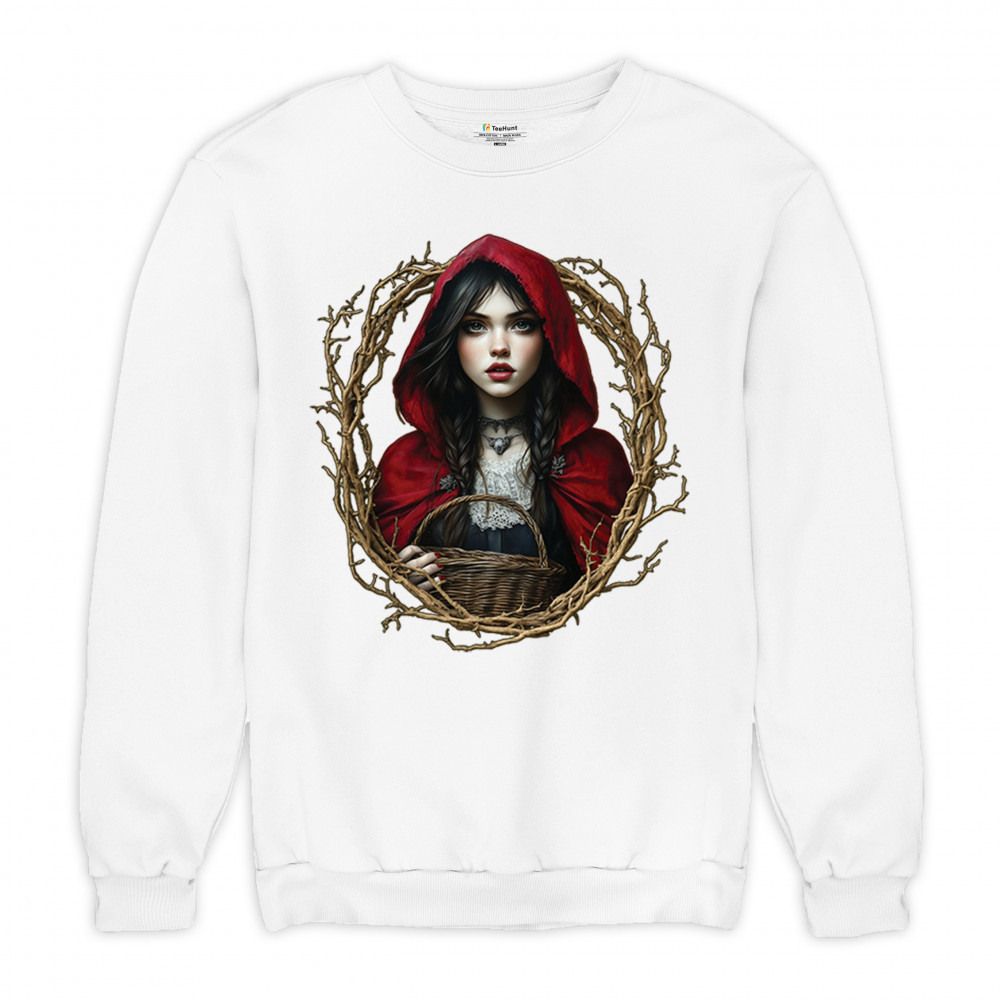 Step into a shadowy fairytale with this gothic design featuring a red-cloaked girl and twisted forest branches. Evoking themes from Red Riding Hood and folklore magic, it’s rich in fantasy, mystery, and dark aesthetic. Perfect for fantasy lovers, dark romantics, and storybook dreamers drawn to enchanted paths and eerie tales.