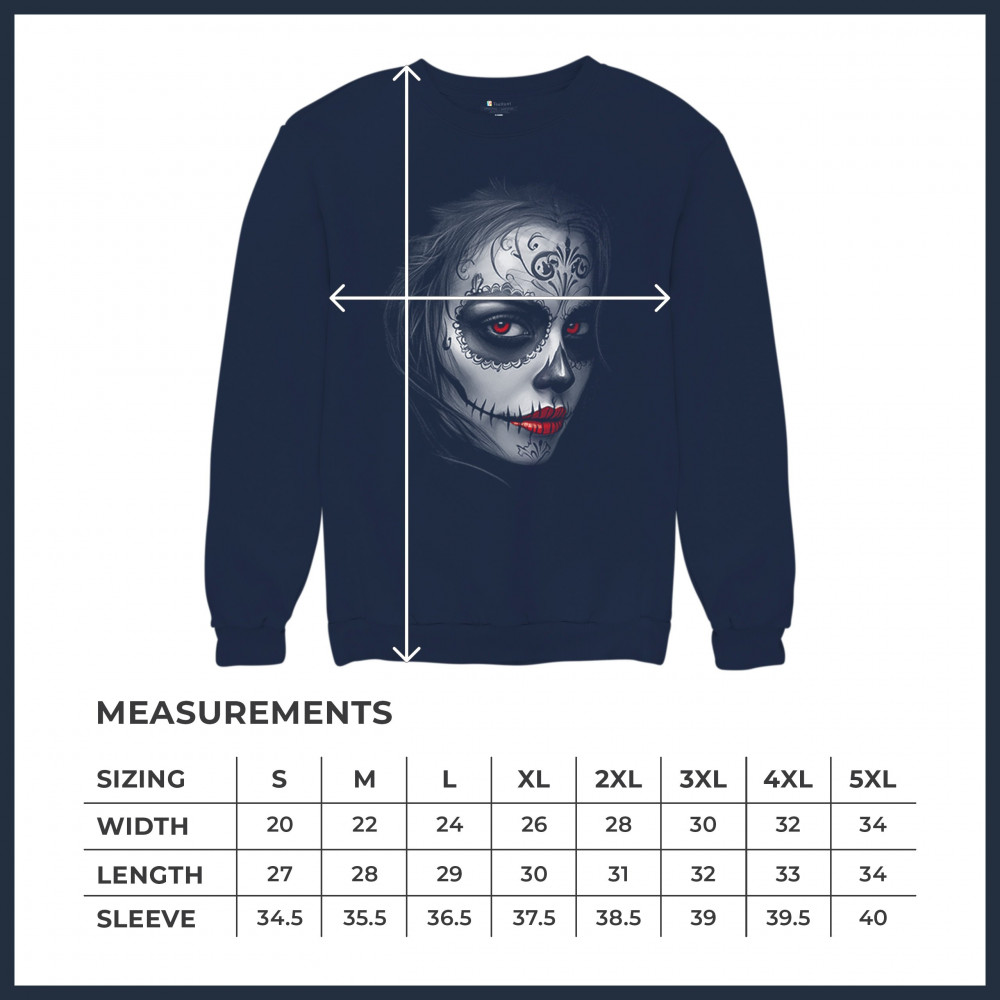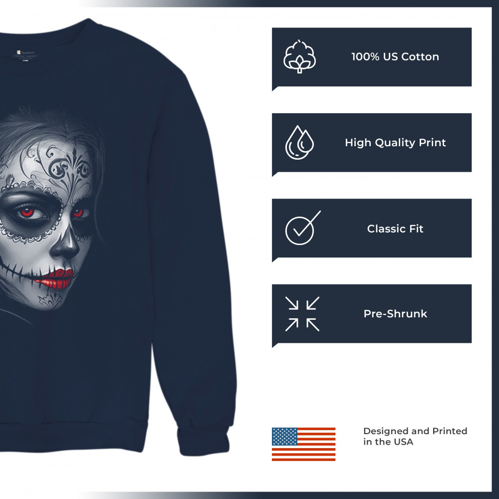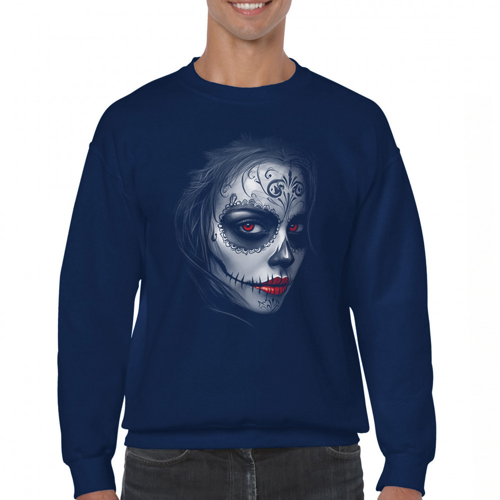 Bold sugar skull design with red eyes, red lips, and gothic makeup. Perfect for Day of the Dead, Halloween, or dark fashion vibes.
