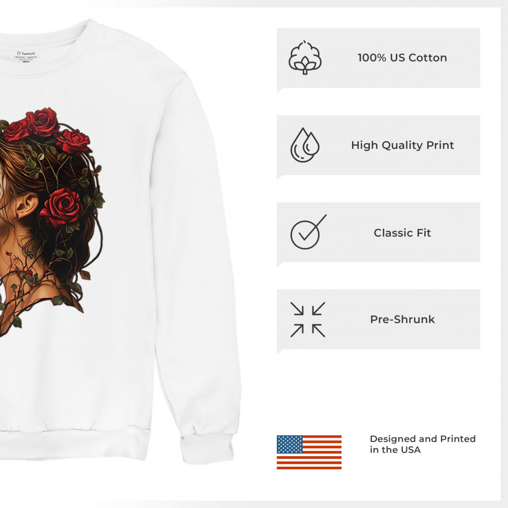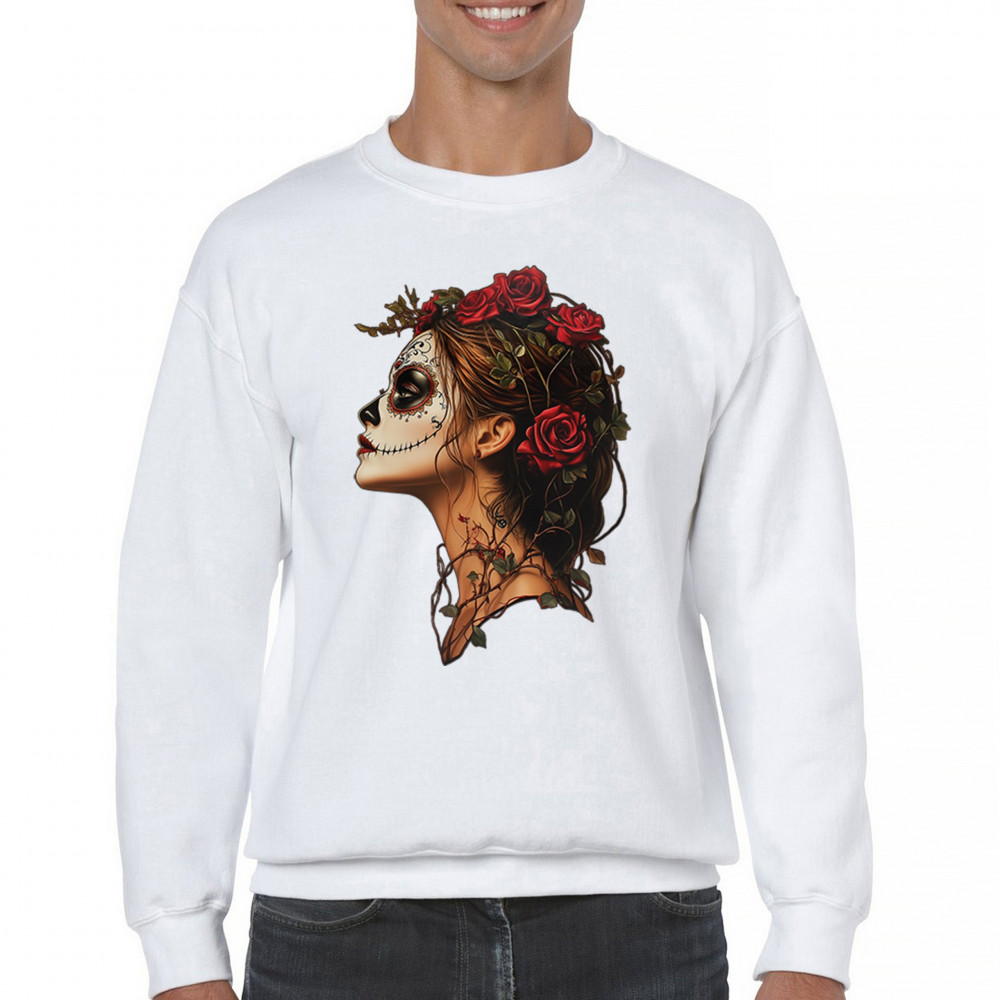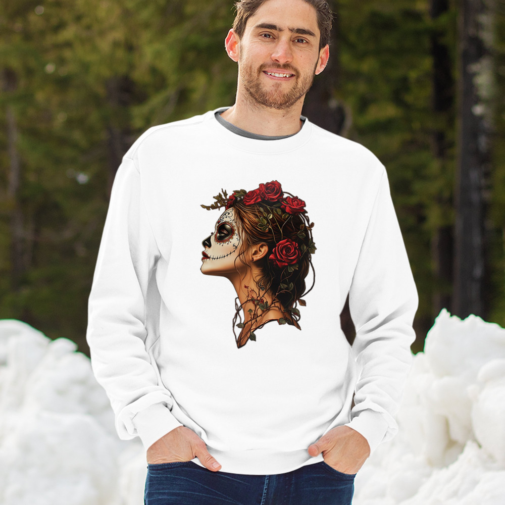 Celebrate feminine power and gothic elegance with this captivating DÃa de los Muertos design. Featuring a woman in profile with sugar skull makeup, blooming red roses, natural vines, dark hair, and symbolic floral skull art, this bold tribute captures beauty, death, and strength in one romantic, detailed visual.