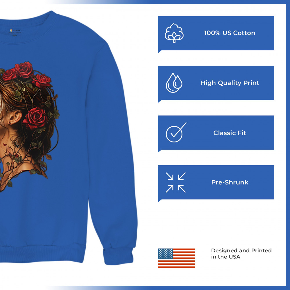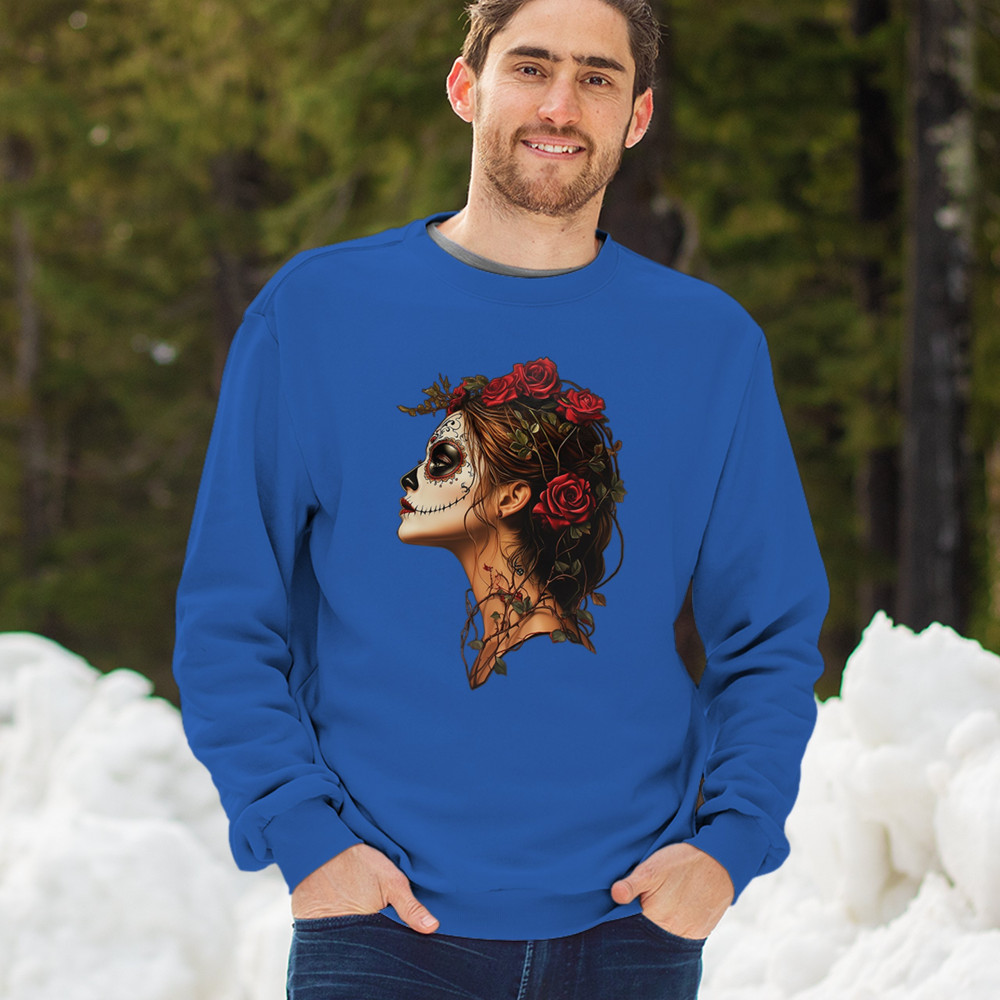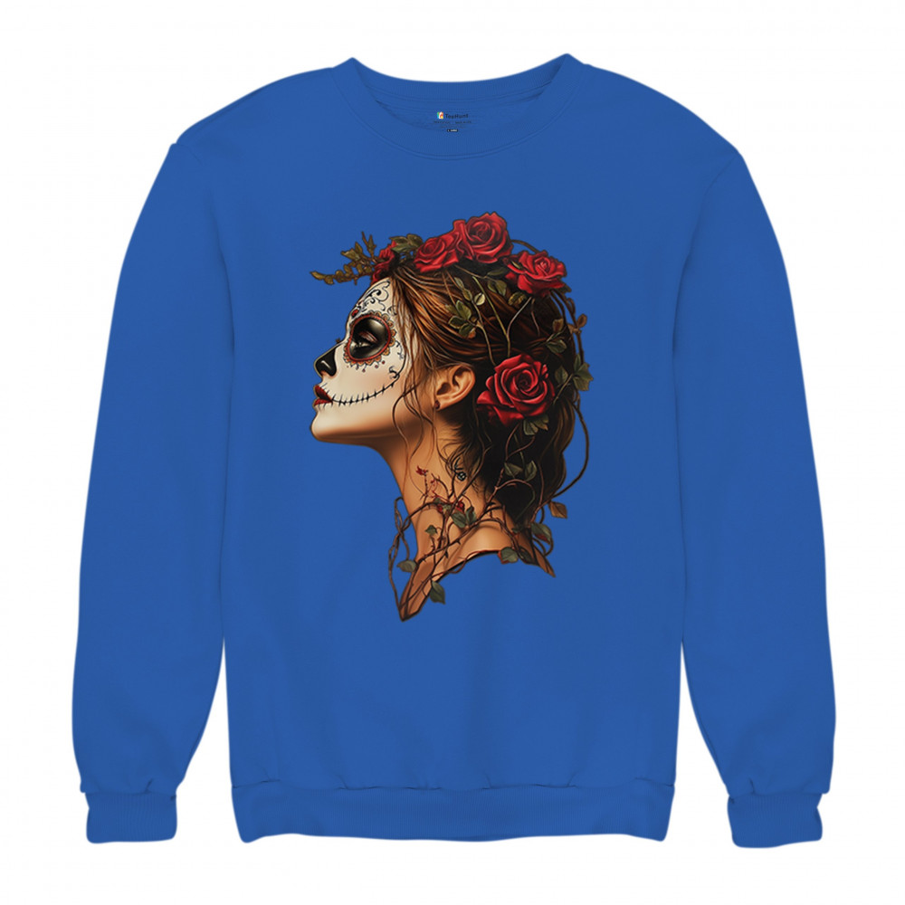 Celebrate feminine power and gothic elegance with this captivating DÃa de los Muertos design. Featuring a woman in profile with sugar skull makeup, blooming red roses, natural vines, dark hair, and symbolic floral skull art, this bold tribute captures beauty, death, and strength in one romantic, detailed visual.