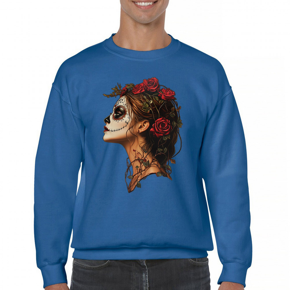 Bold floral skull art with sugar skull makeup, red roses, vines, and gothic elegance - perfect for DÃa de los Muertos and symbolic beauty fans.