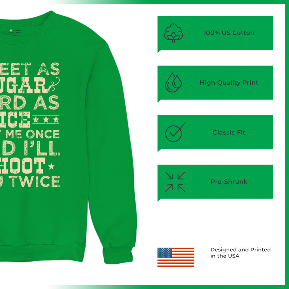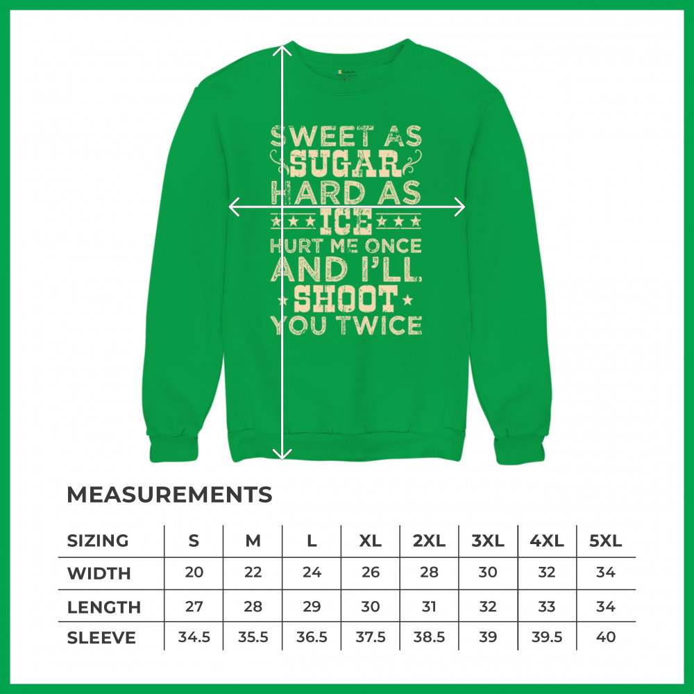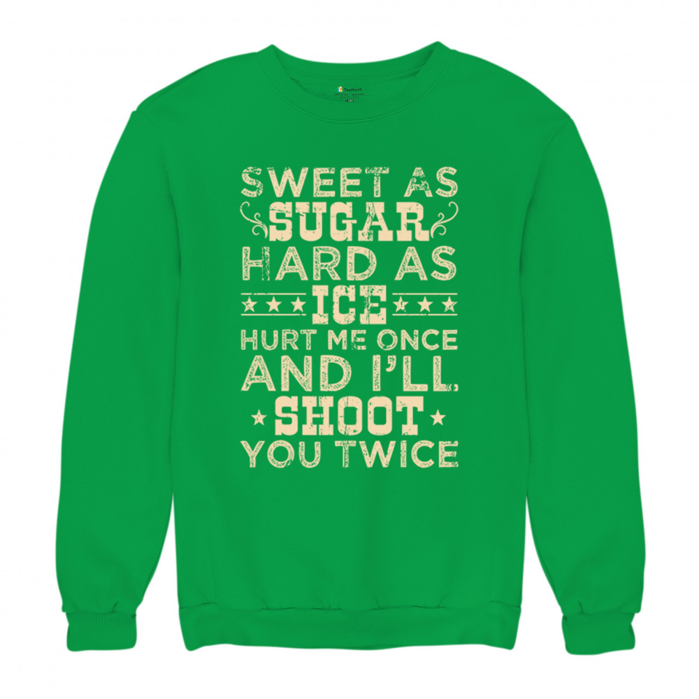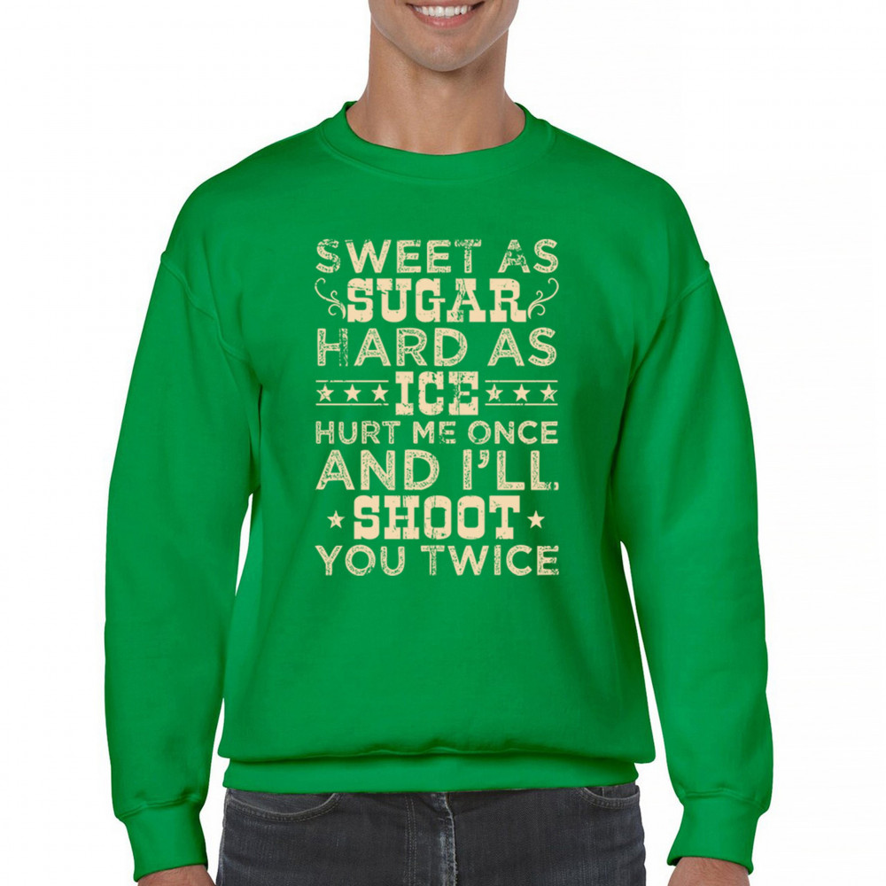 Declare your stance with this bold pro-gun design featuring the quote "Sweet as Sugar, Hard as Ice, Hurt Me Once, I’ll Shoot You Twice." Made for patriots, firearm enthusiasts, military supporters, and defenders of the Constitution. The design blends American pride, 2nd Amendment power, and personal grit in one fierce statement of freedom and justice.
