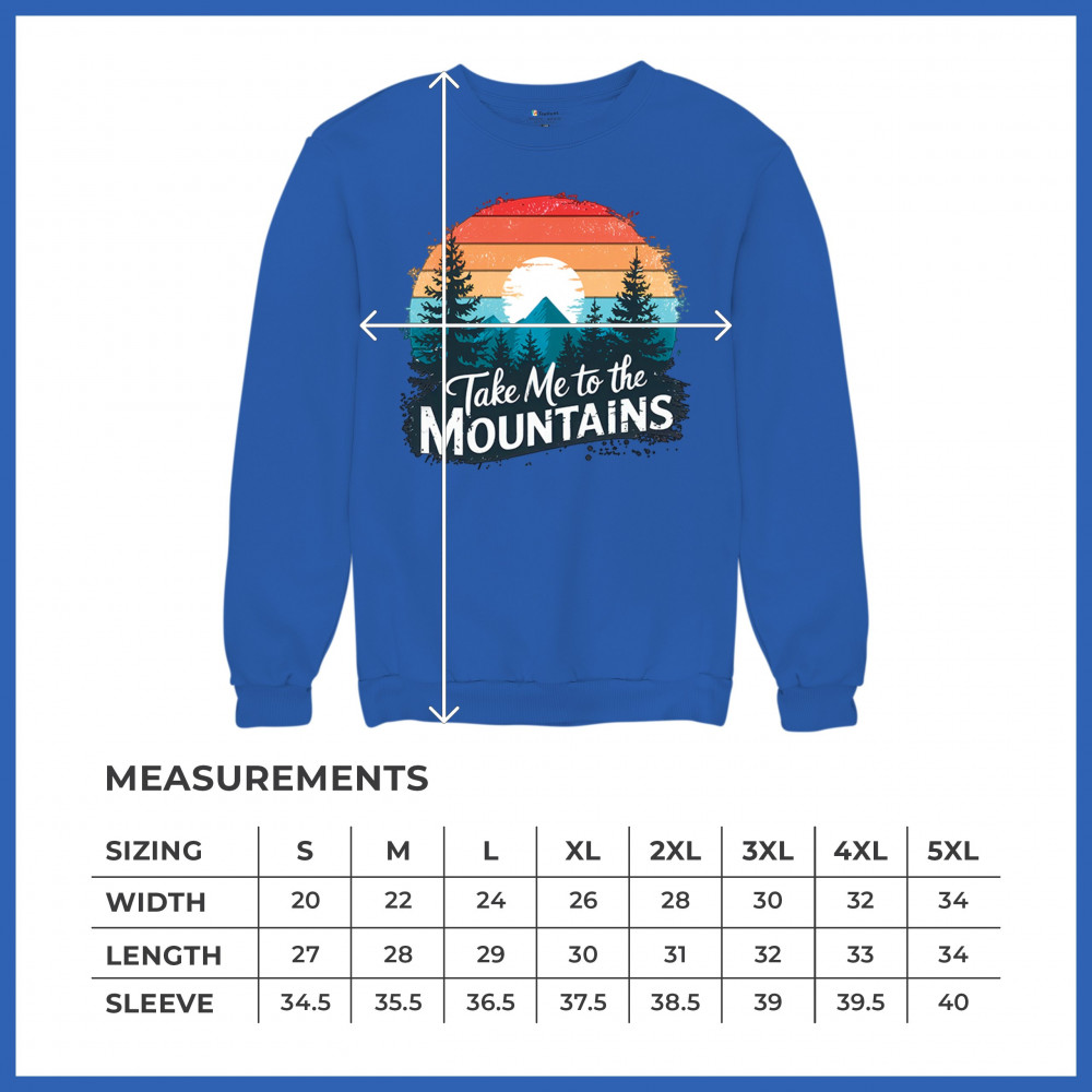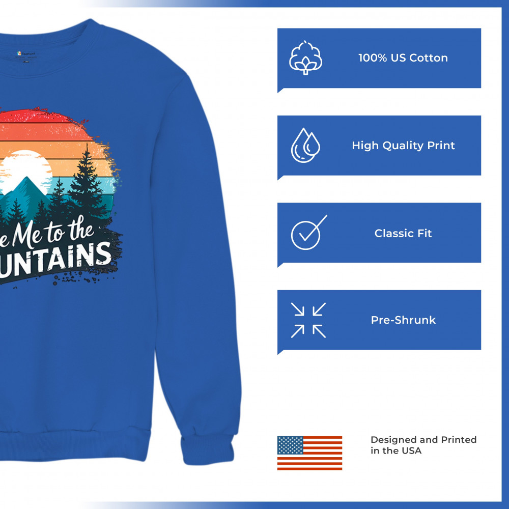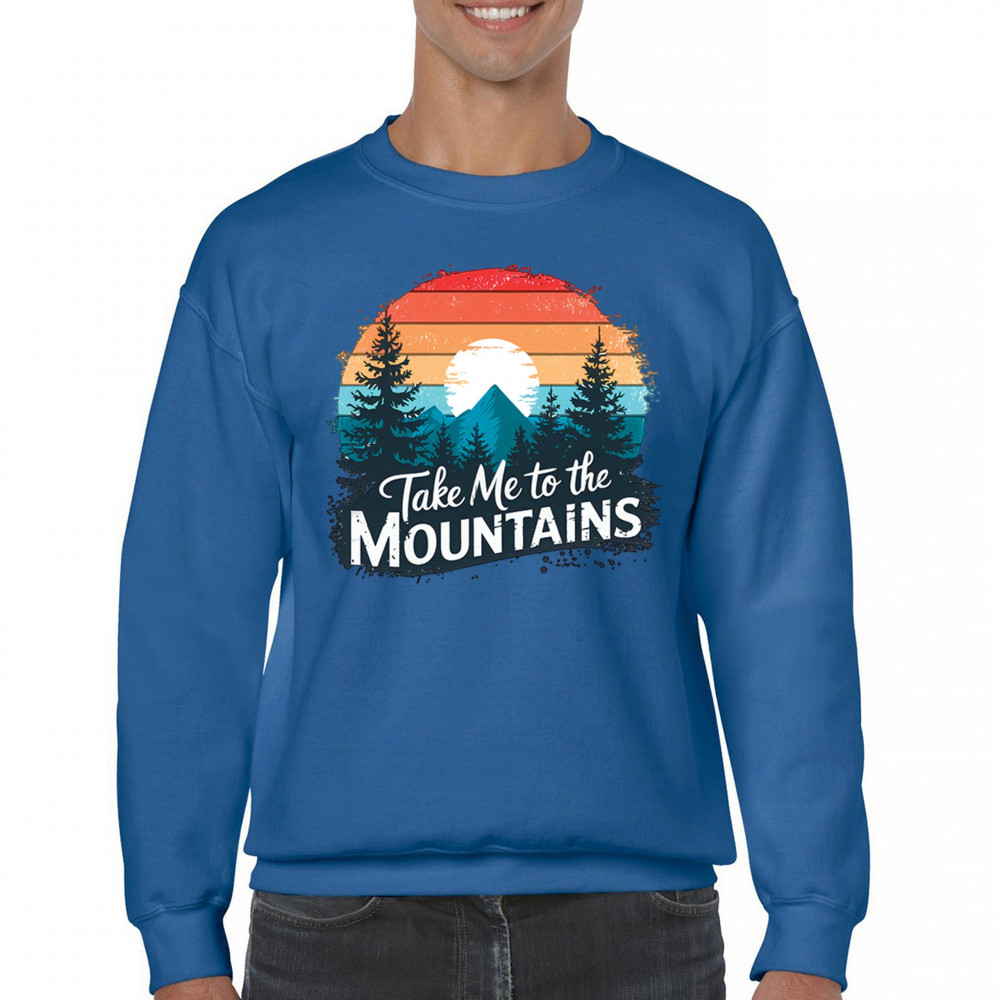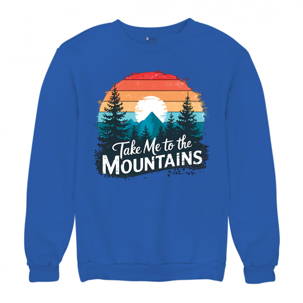 TAKE ME TO THE MOUNTAINS crewneck sweatshirt outdoors trail hiking camping royal blue