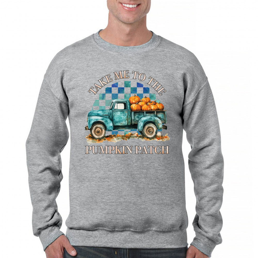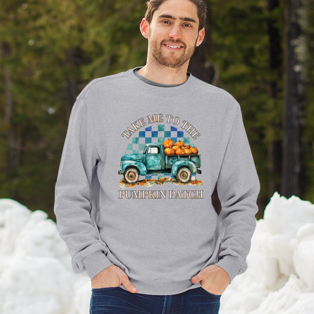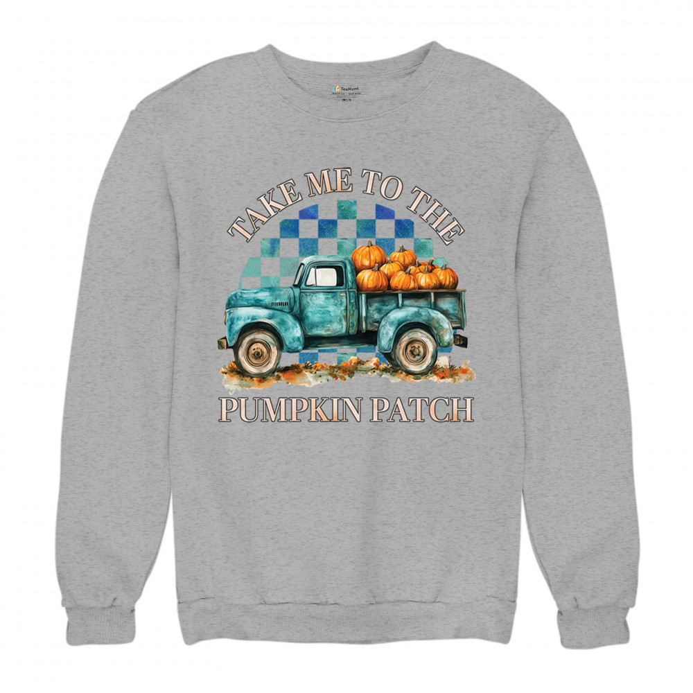 Celebrate autumn in style with the "Take Me to the Pumpkin Patch" design, featuring a vintage truck and festive pumpkins—perfect for fall lovers!