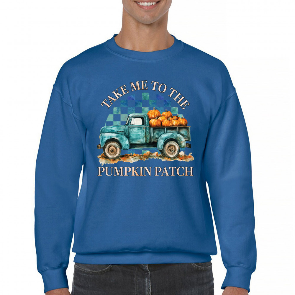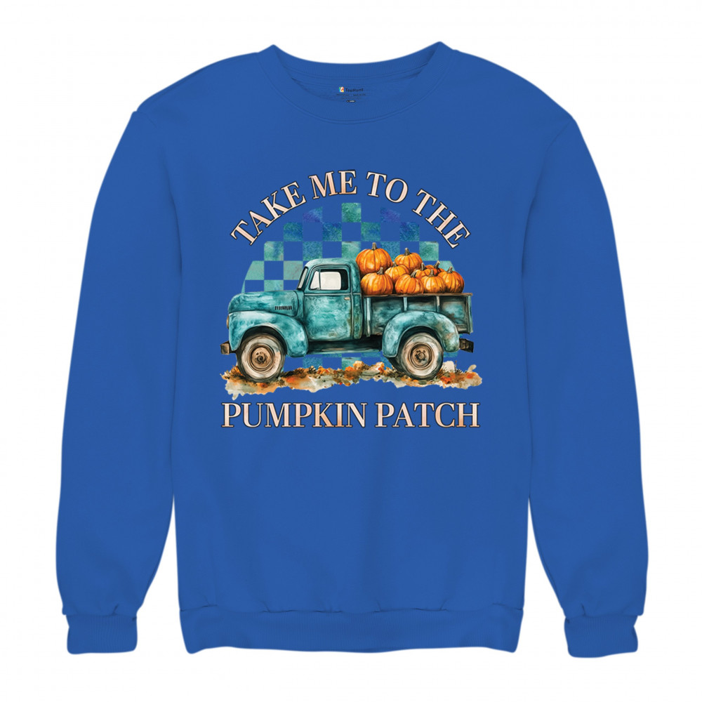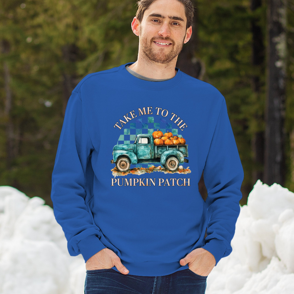 Celebrate autumn in style with the "Take Me to the Pumpkin Patch" design, featuring a vintage truck and festive pumpkins—perfect for fall lovers!