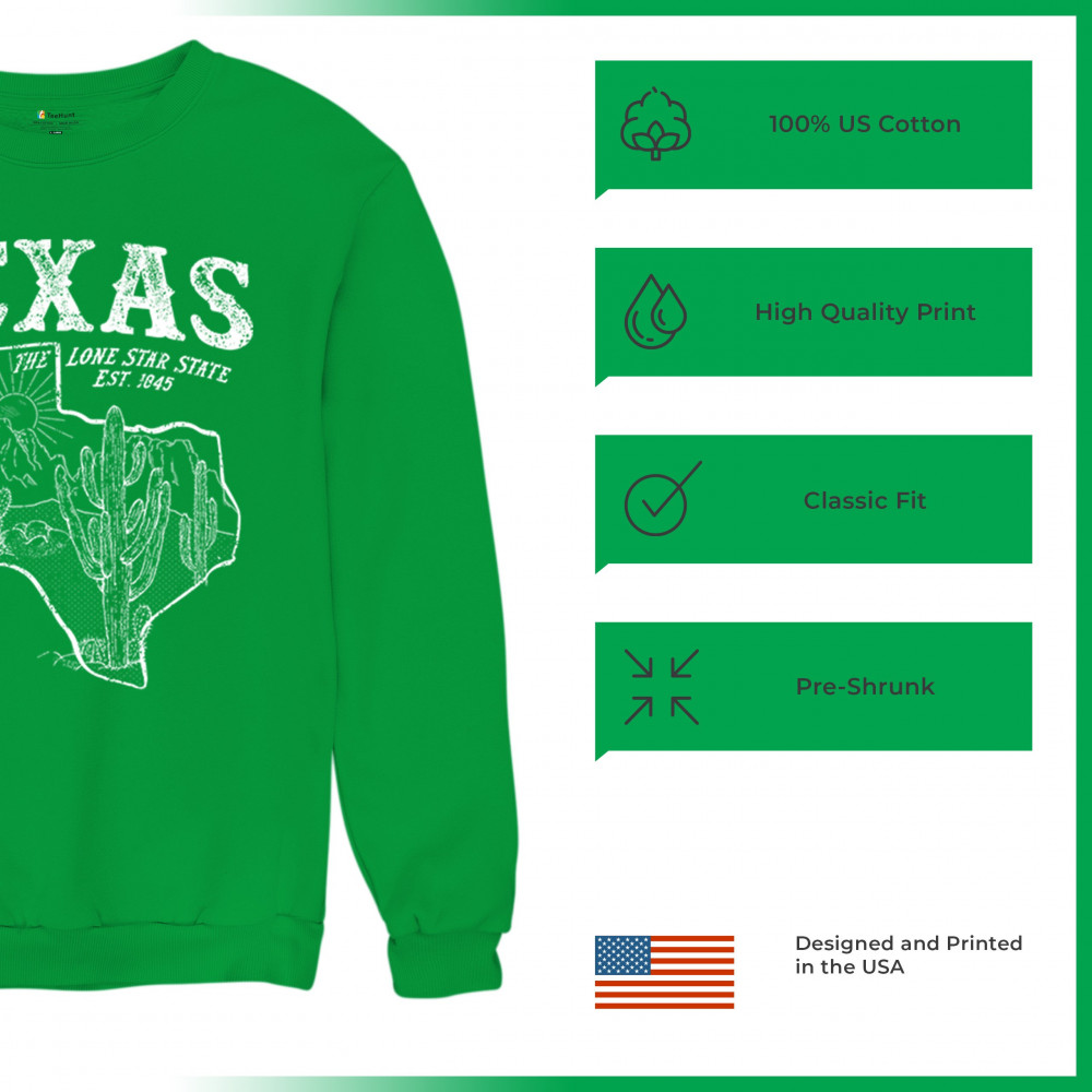 Vintage Texas pride design with cactus, mountains, Lone Star symbol, and 1845 tribute—perfect for rodeos and western events.