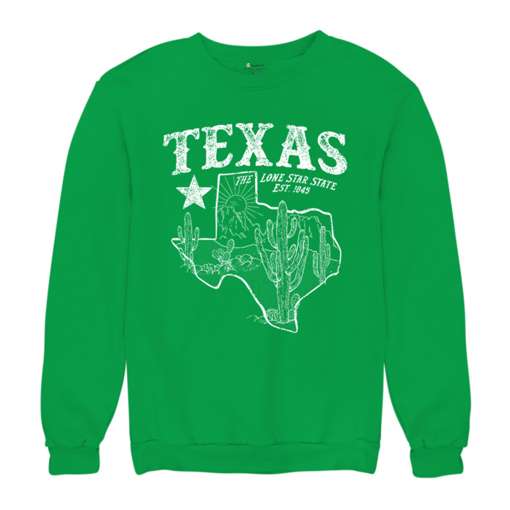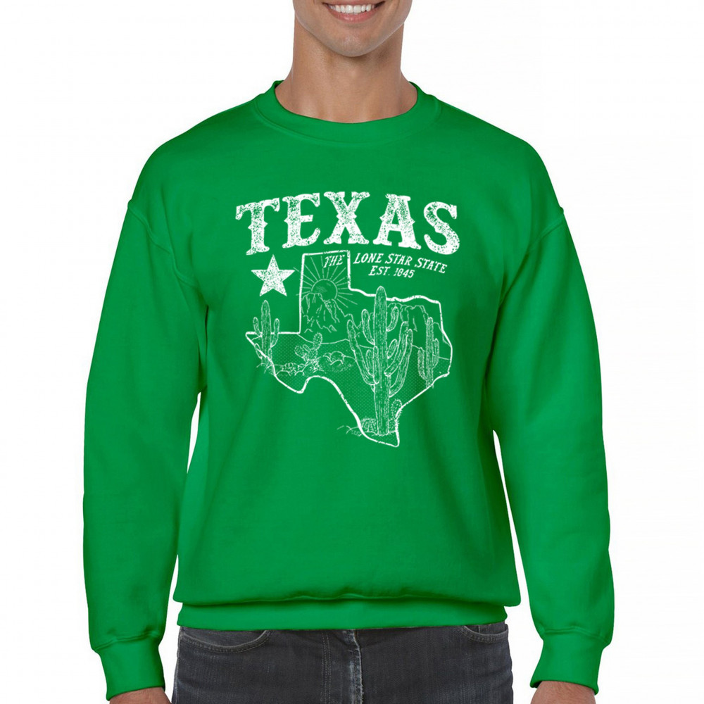 Celebrate the Lone Star State with this rugged Texas map design featuring cactus, mountains, and bold state pride text. A rustic southwestern tribute to the state’s heritage, established in 1845, it’s the perfect look for rodeos, country festivals, and lovers of the Texas desert lifestyle and scenery.