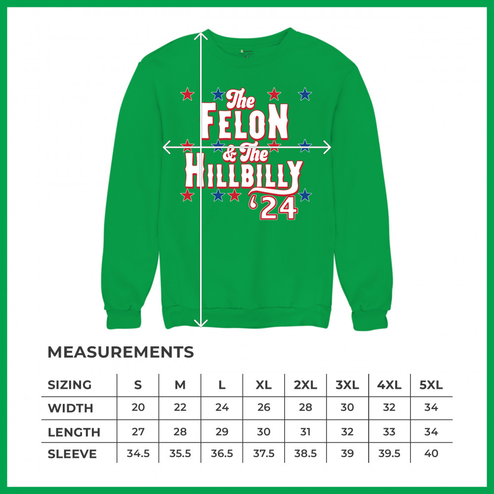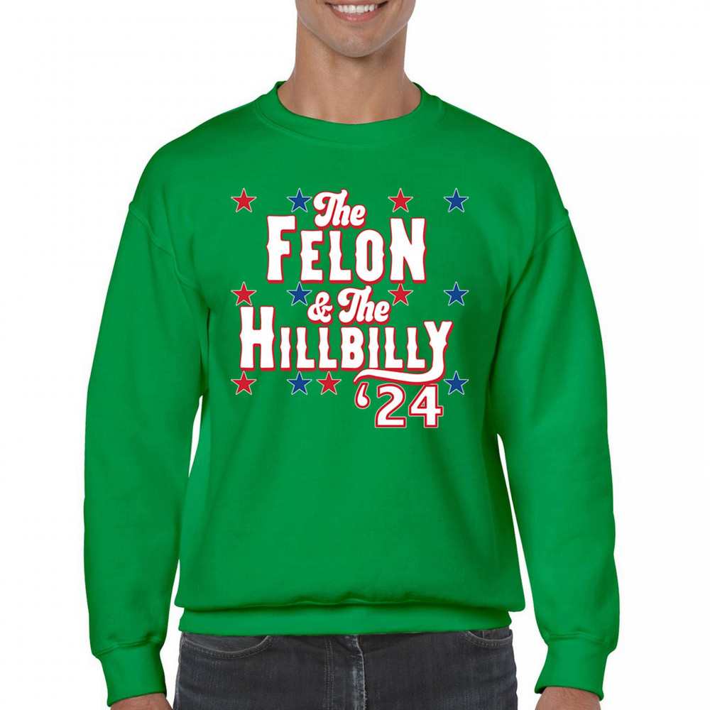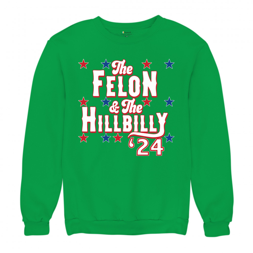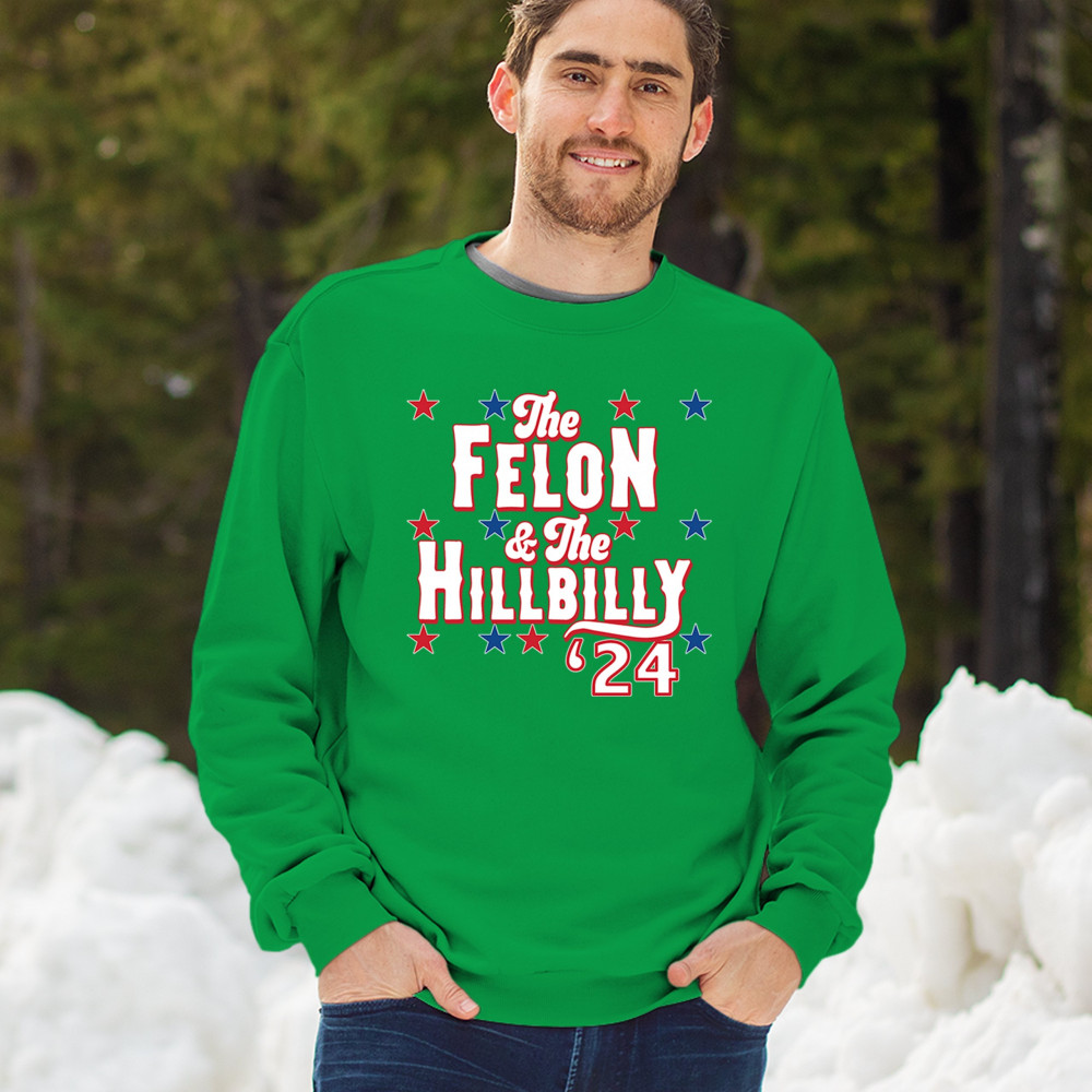 Humorous pro-Trump and Vance design for the 2024 election. "The Felon & The Hillbilly '24" captures conservative pride and humor in one bold statement.