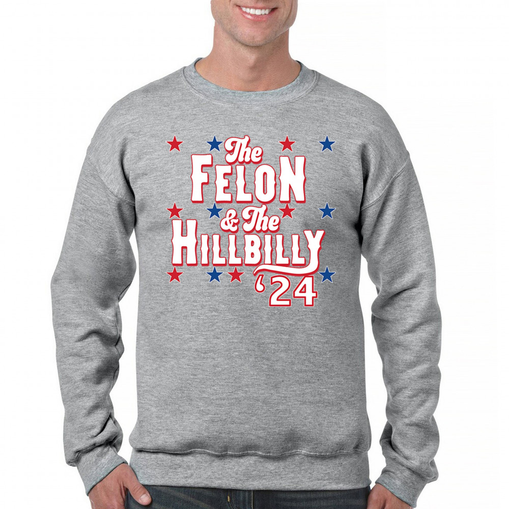 Humorous pro-Trump and Vance design for the 2024 election. "The Felon & The Hillbilly '24" captures conservative pride and humor in one bold statement.