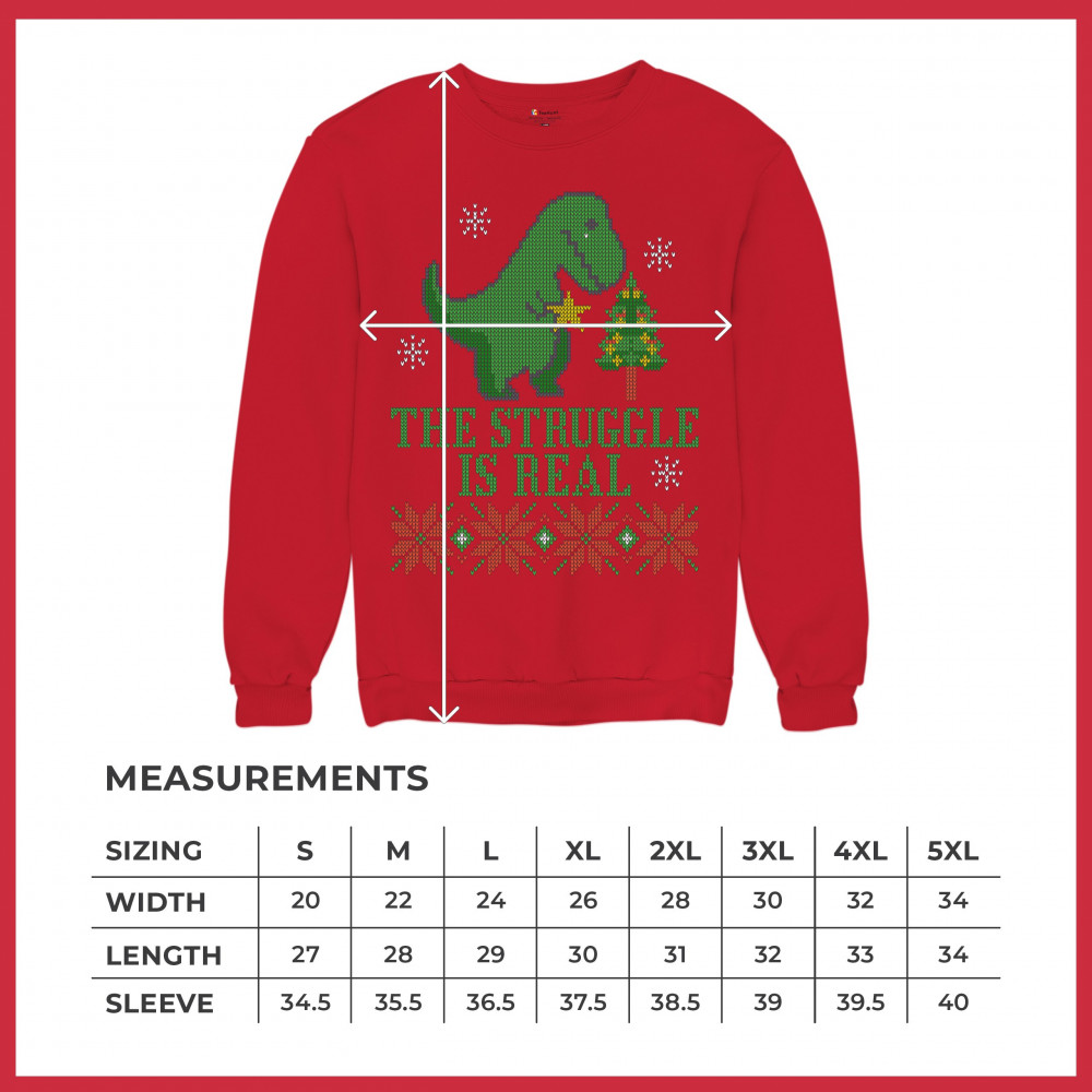 A funny print saying: "The Struggle Is Real" and featuring a sad tyrannosaurus rex holding a toy star in it's short hands standing by a Christmas tree. The print is decorated as an ugly sweater. Amazing choice to make people smile and spread positive vibe