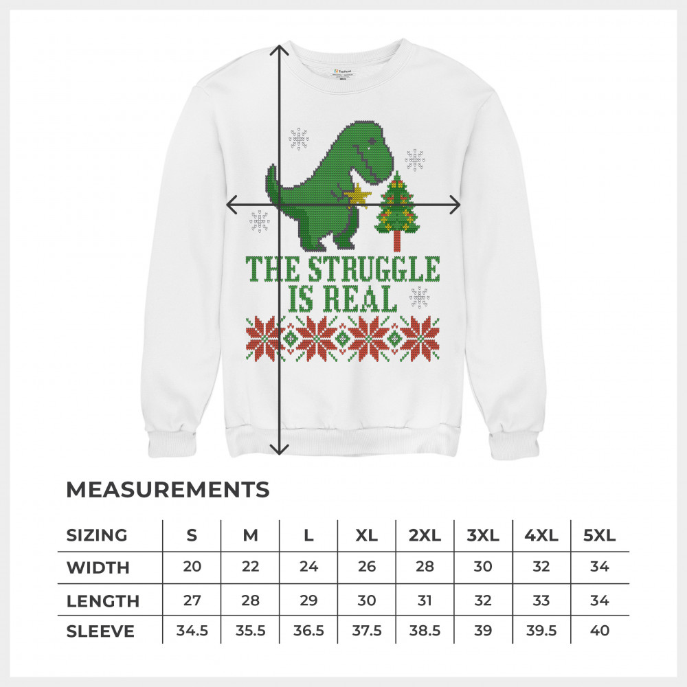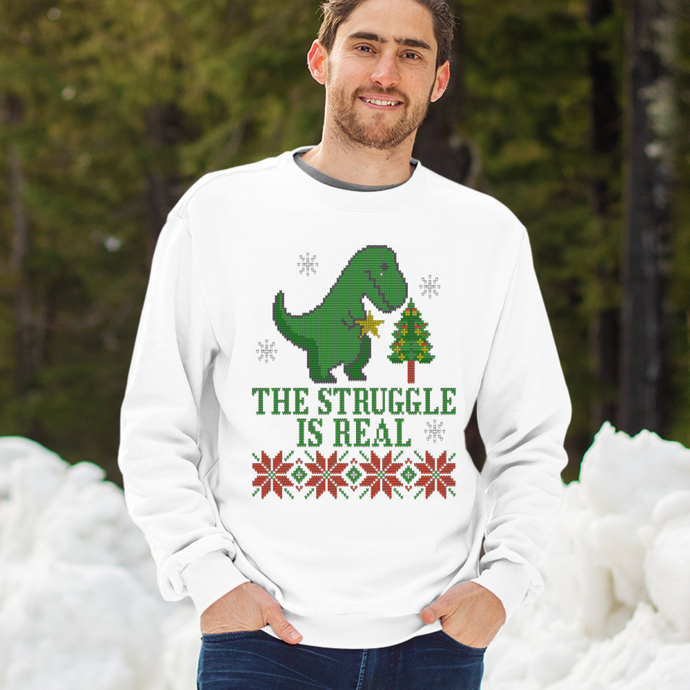 A funny print saying: "The Struggle Is Real" and featuring a sad tyrannosaurus rex holding a toy star in it's short hands standing by a Christmas tree. The print is decorated as an ugly sweater. Amazing choice to make people smile and spread positive vibe