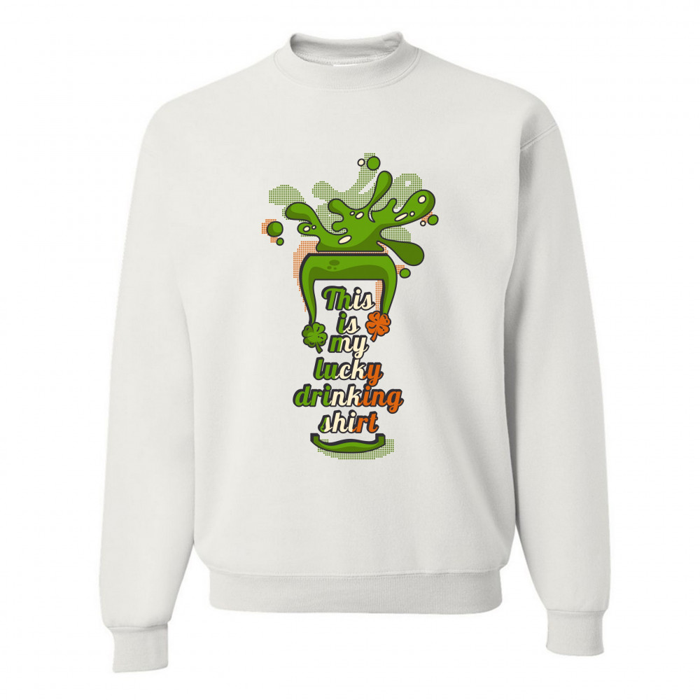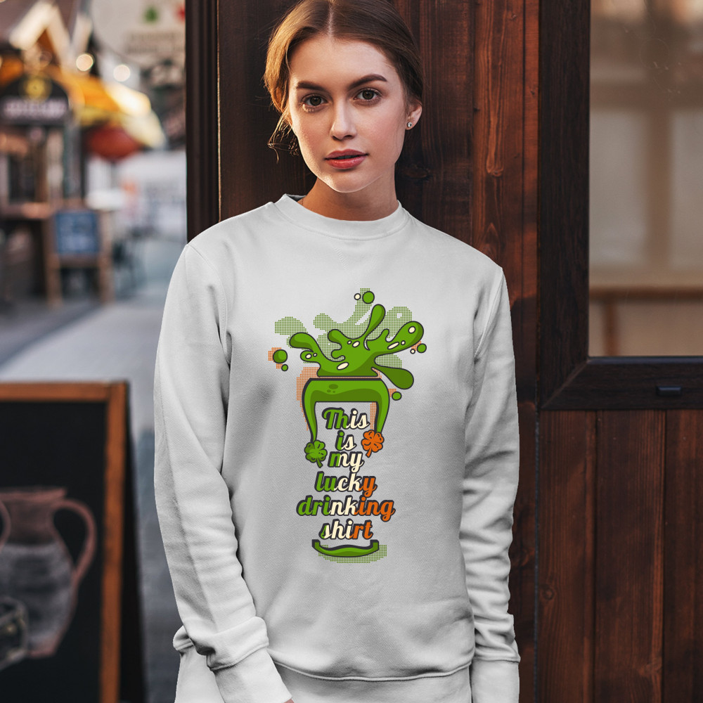 A print featuring a silhouette of a glass with beer spilling out of it. Inside the glass there is a text: "This is my lucky drinking shirt" in the colors of the flag of Ireland. A great choice to wear on March 17 to celebrate the St. Patrick's Day and sho