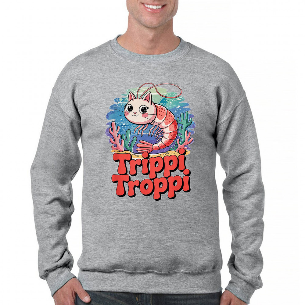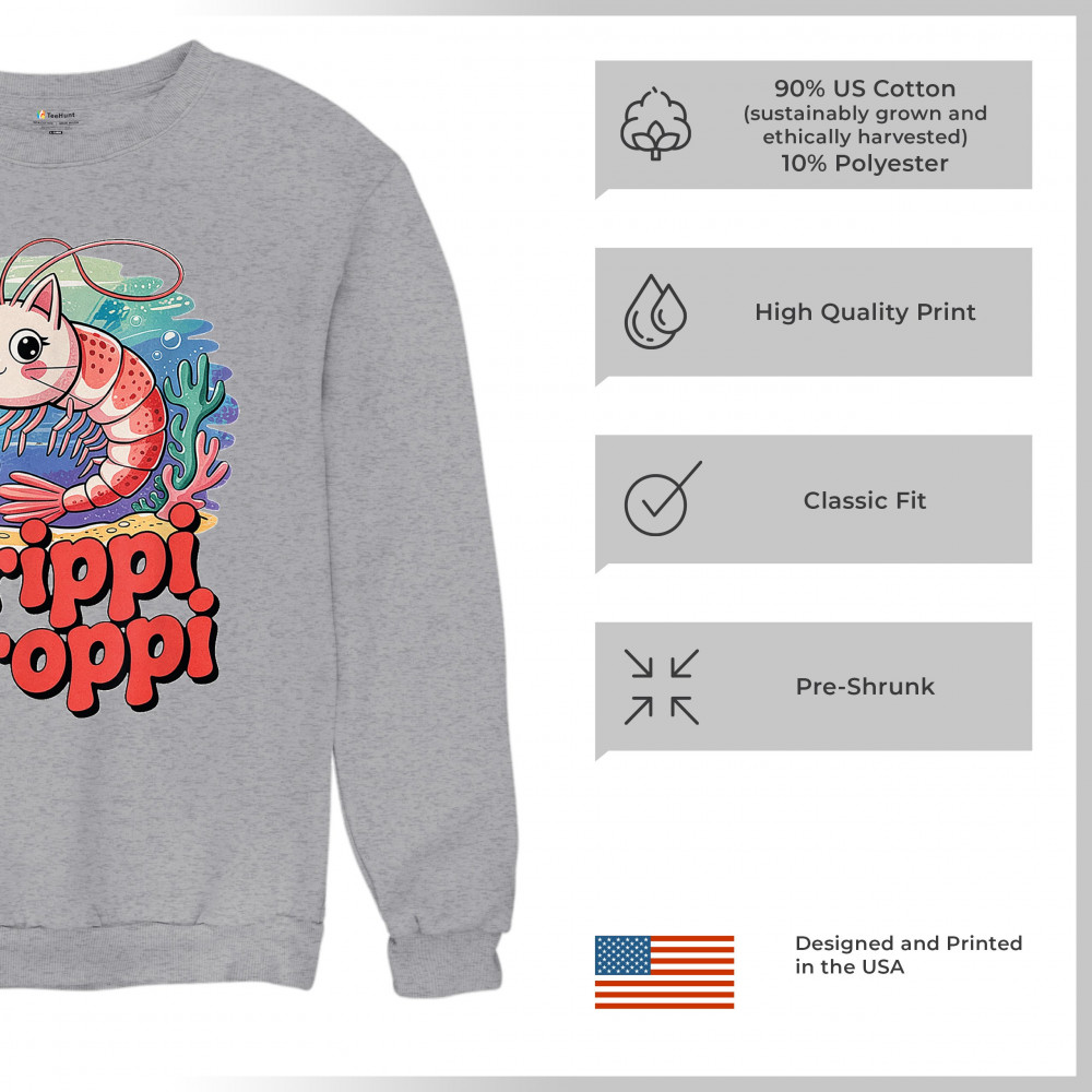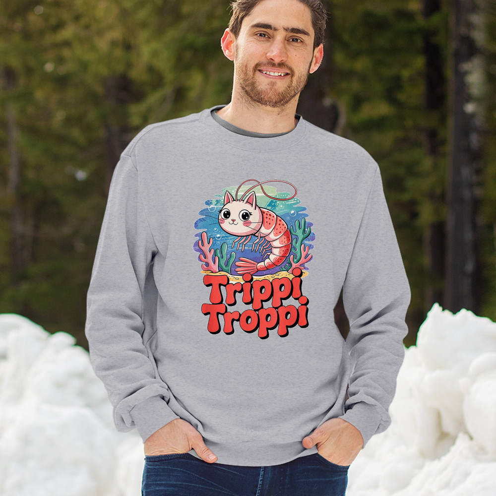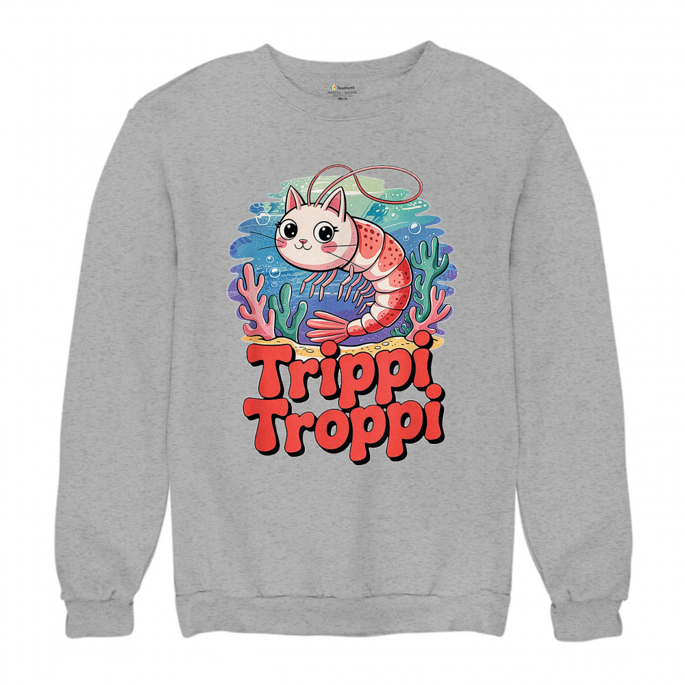 Dive deep into absurdity with Trippi Troppi—a surreal shrimp-cat fusion straight out of Italian Brainrot territory. This design captures cursed animal chaos, weirdcore visuals, TikTok meme culture, and underwater fever dream aesthetics. Made for Gen Z humor addicts, ocean meme fans, and ironic fashion lovers alike.