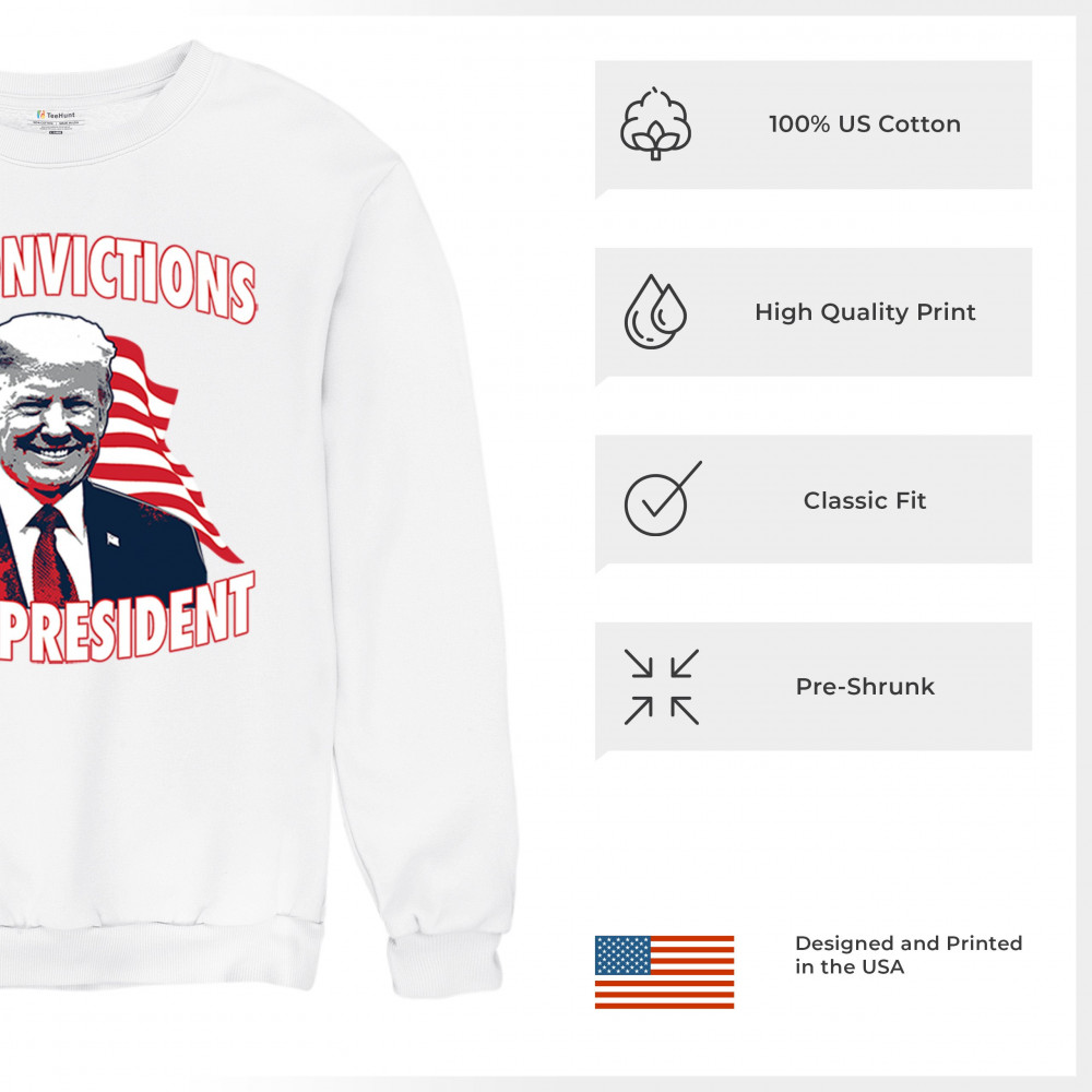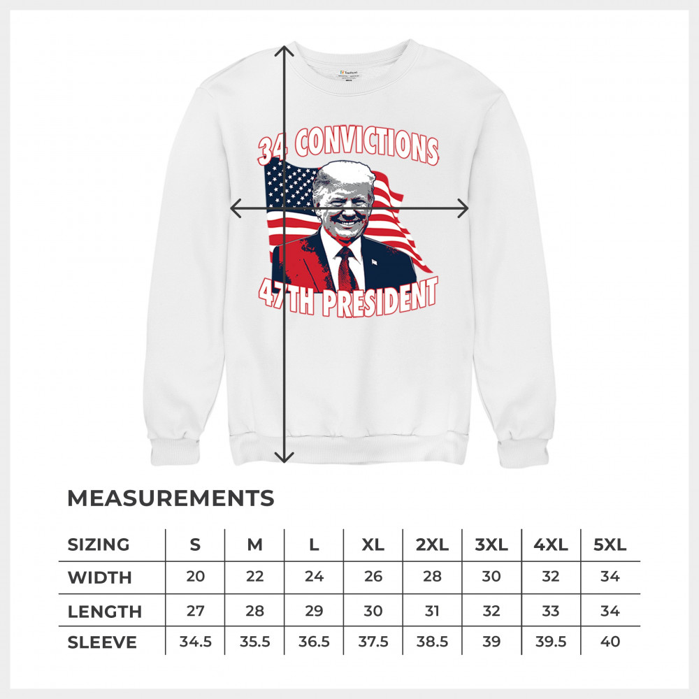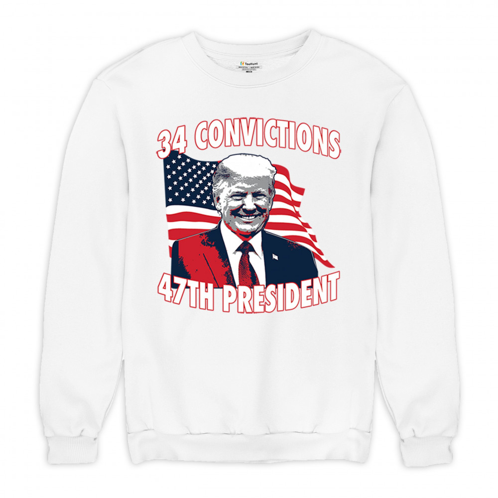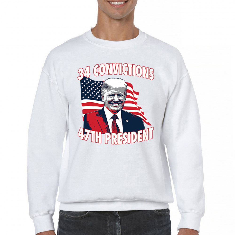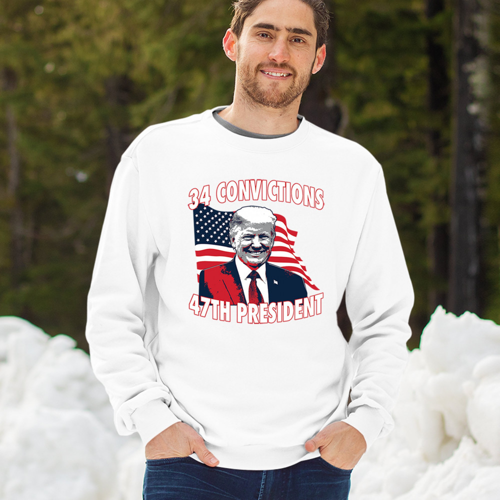 Show your support for Trump's 2024 campaign with the "34 Convictions, 47th President" design. Perfect for rallies, patriotic events, and conservative gatherings.