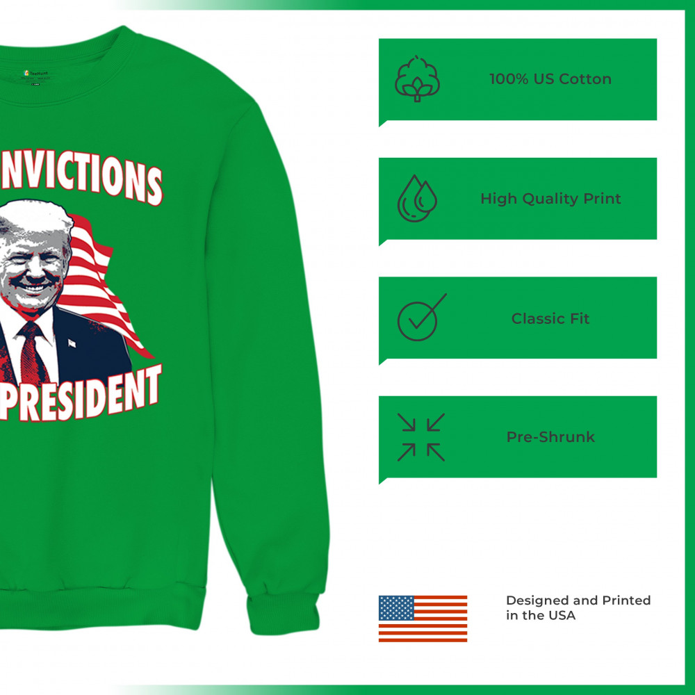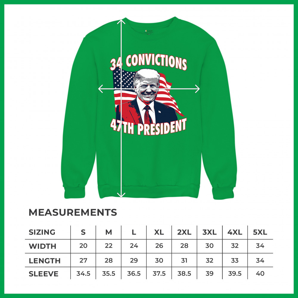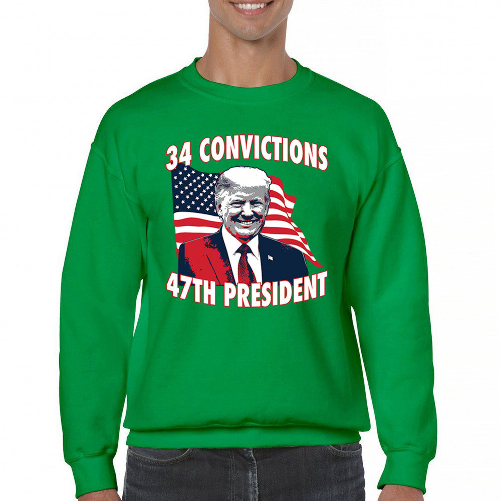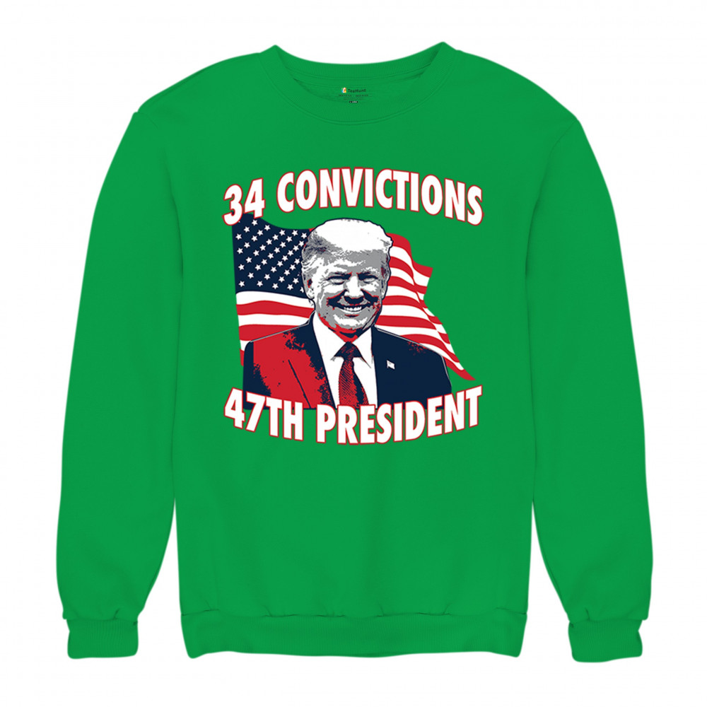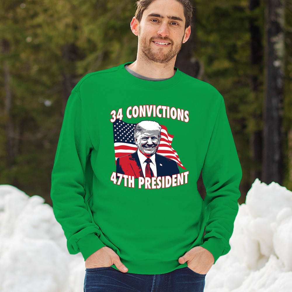 Show your support for Trump's 2024 campaign with the "34 Convictions, 47th President" design. Perfect for rallies, patriotic events, and conservative gatherings.