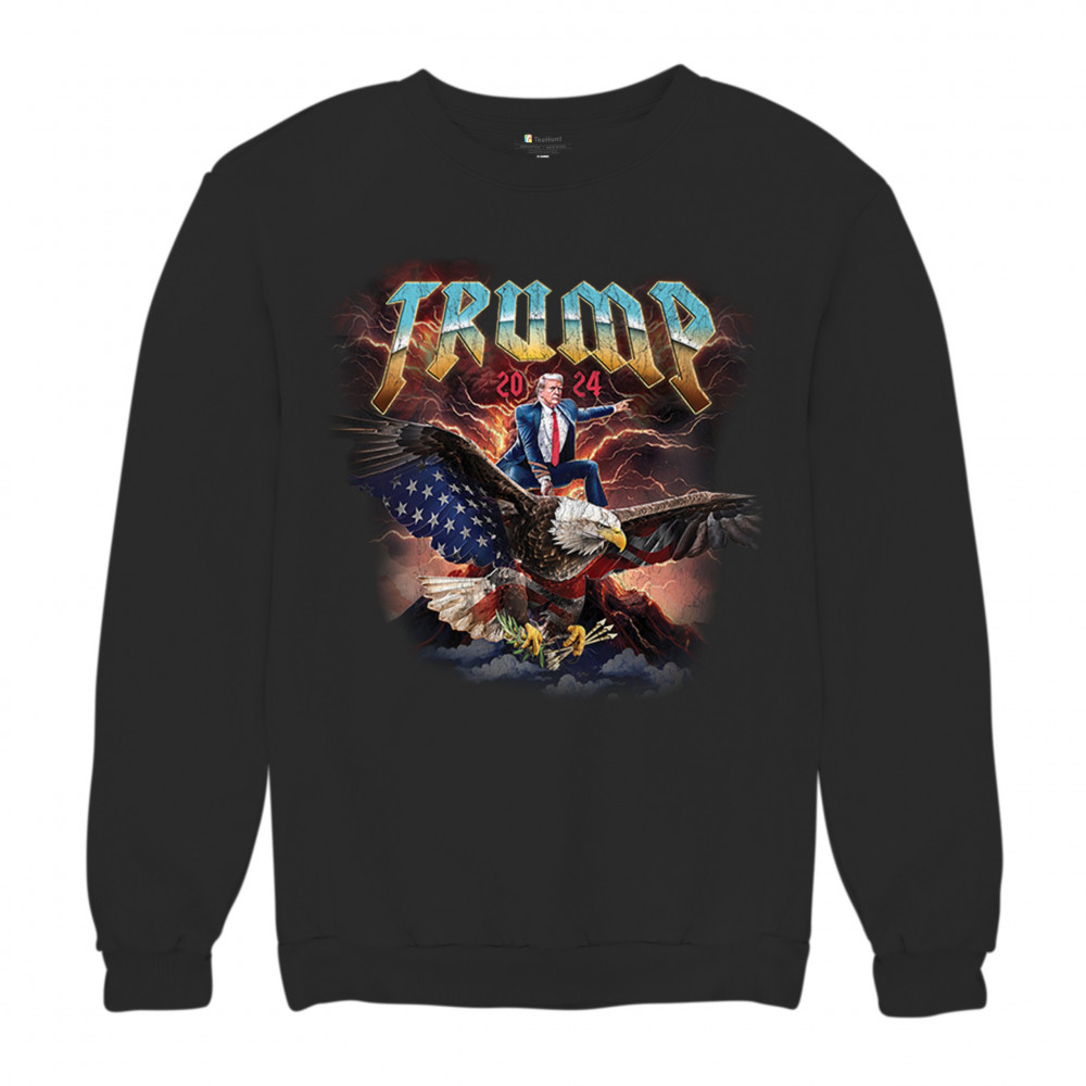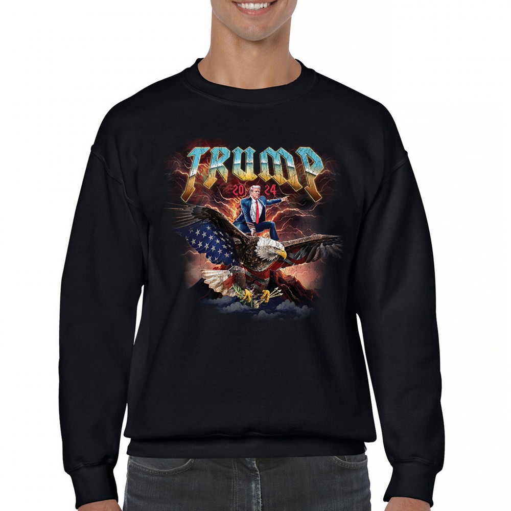 Stand out with our "Trump 2024" design featuring Trump riding an eagle. Perfect for rallies and patriotic events. Show your support with pride and confidence.
