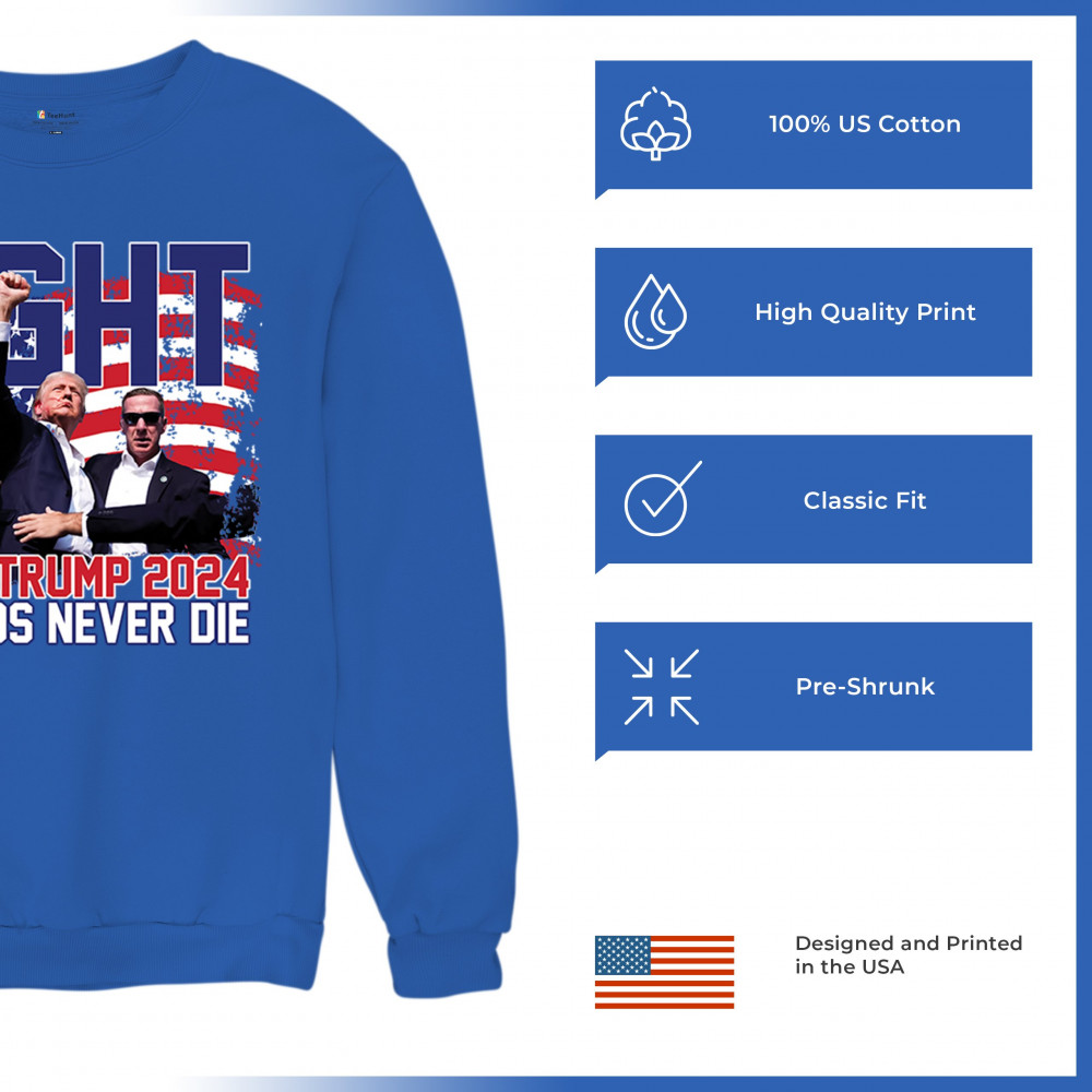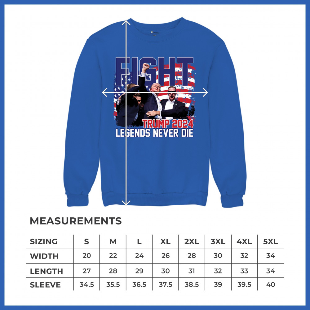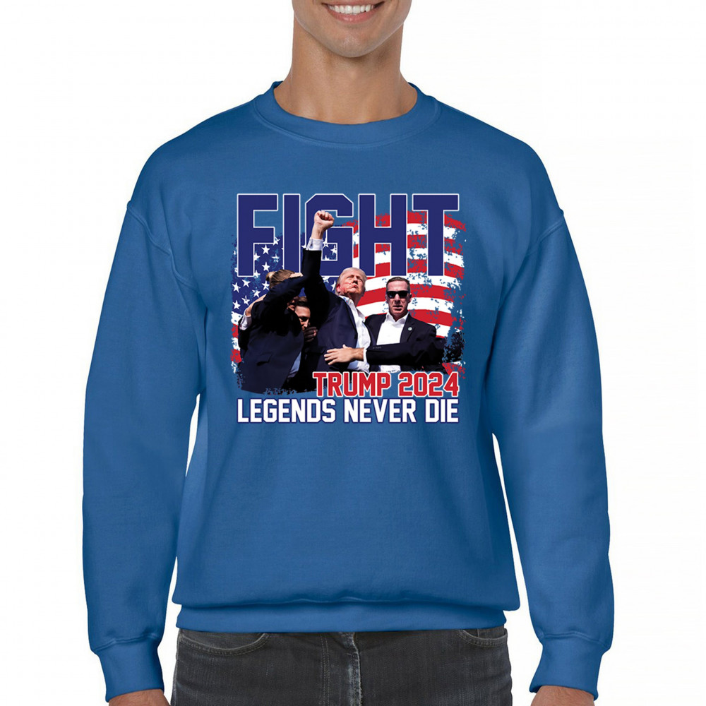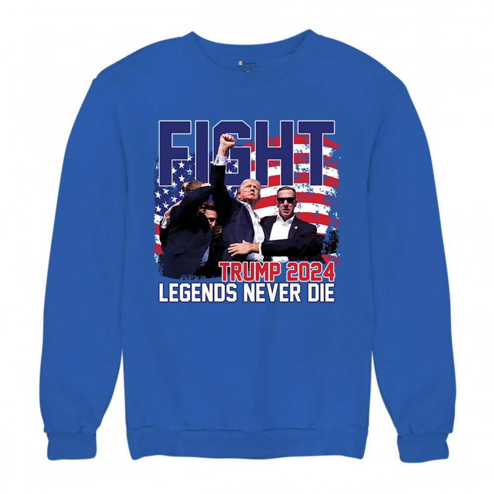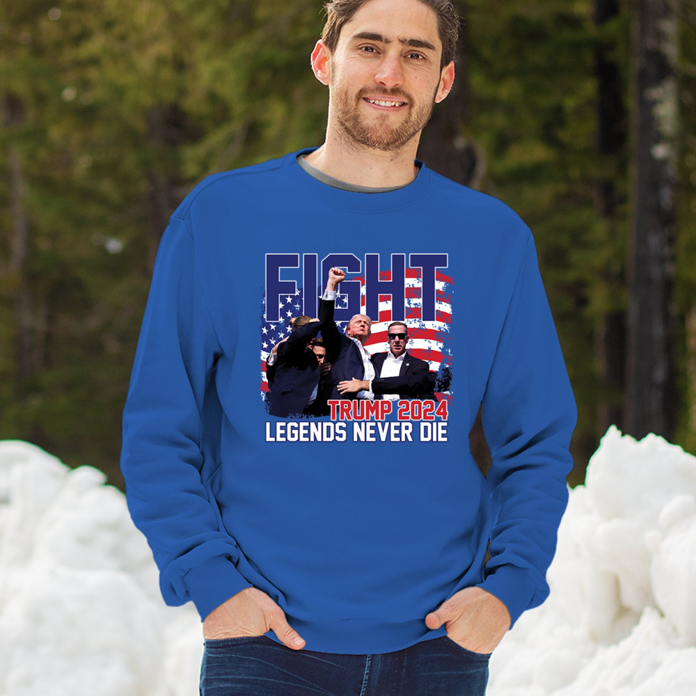 Show your Trump 2024 support with our bold "Fight" design, featuring "Legends Never Die" and a patriotic American flag. Perfect for rallies and everyday wear.