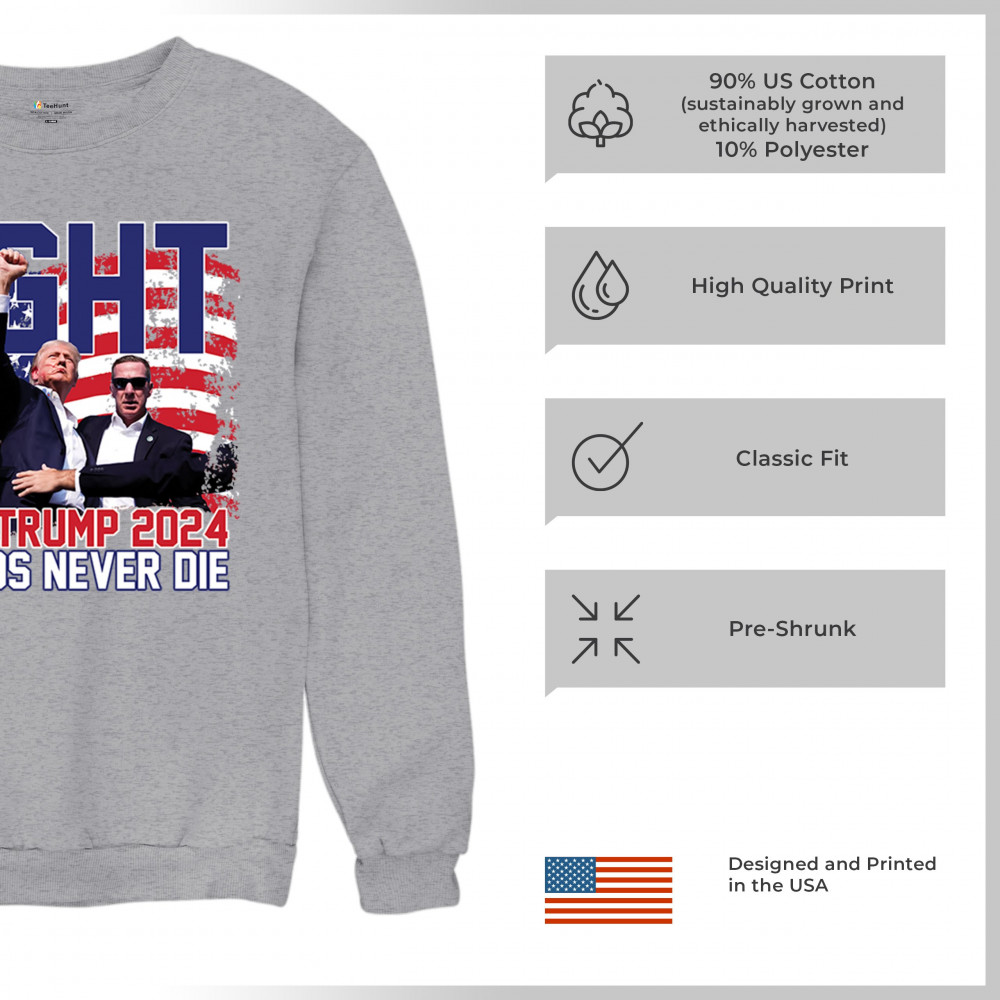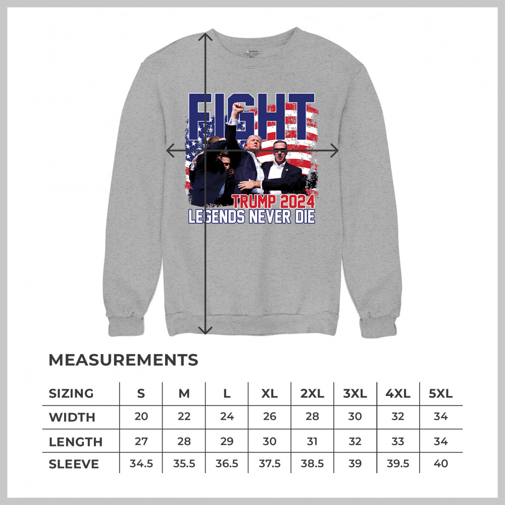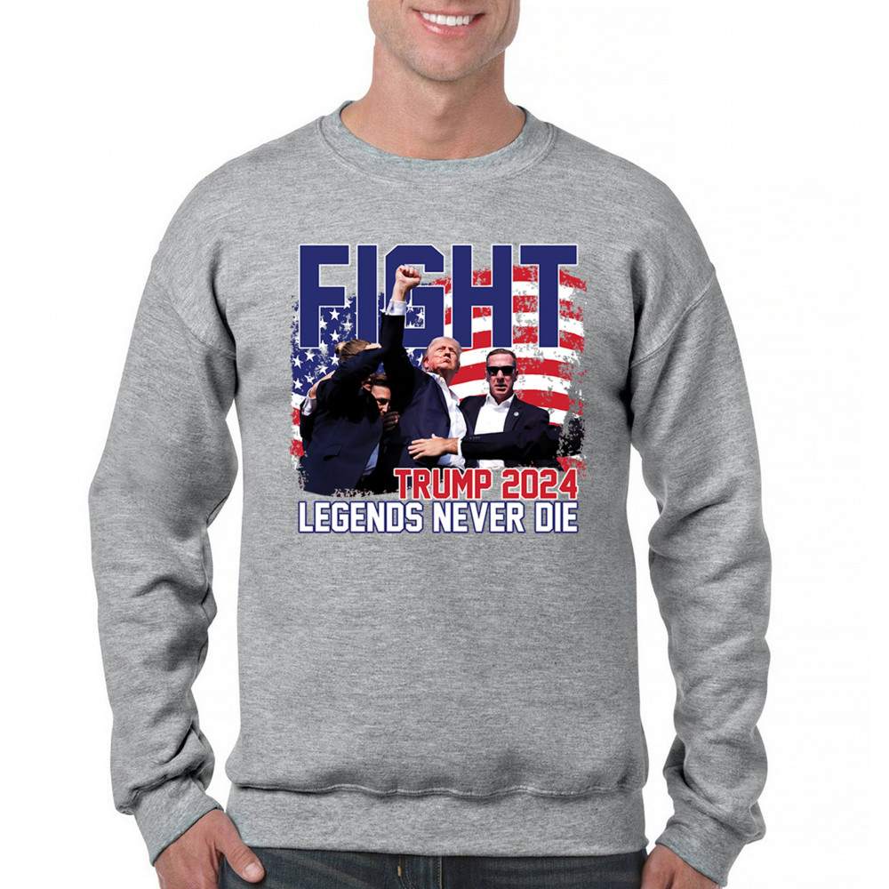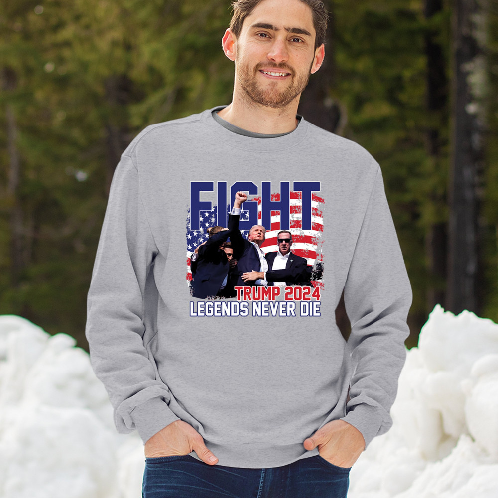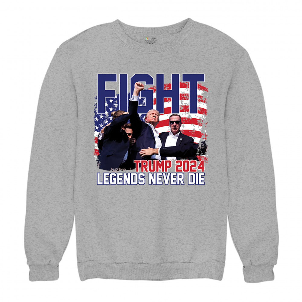 Show your Trump 2024 support with our bold "Fight" design, featuring "Legends Never Die" and a patriotic American flag. Perfect for rallies and everyday wear.