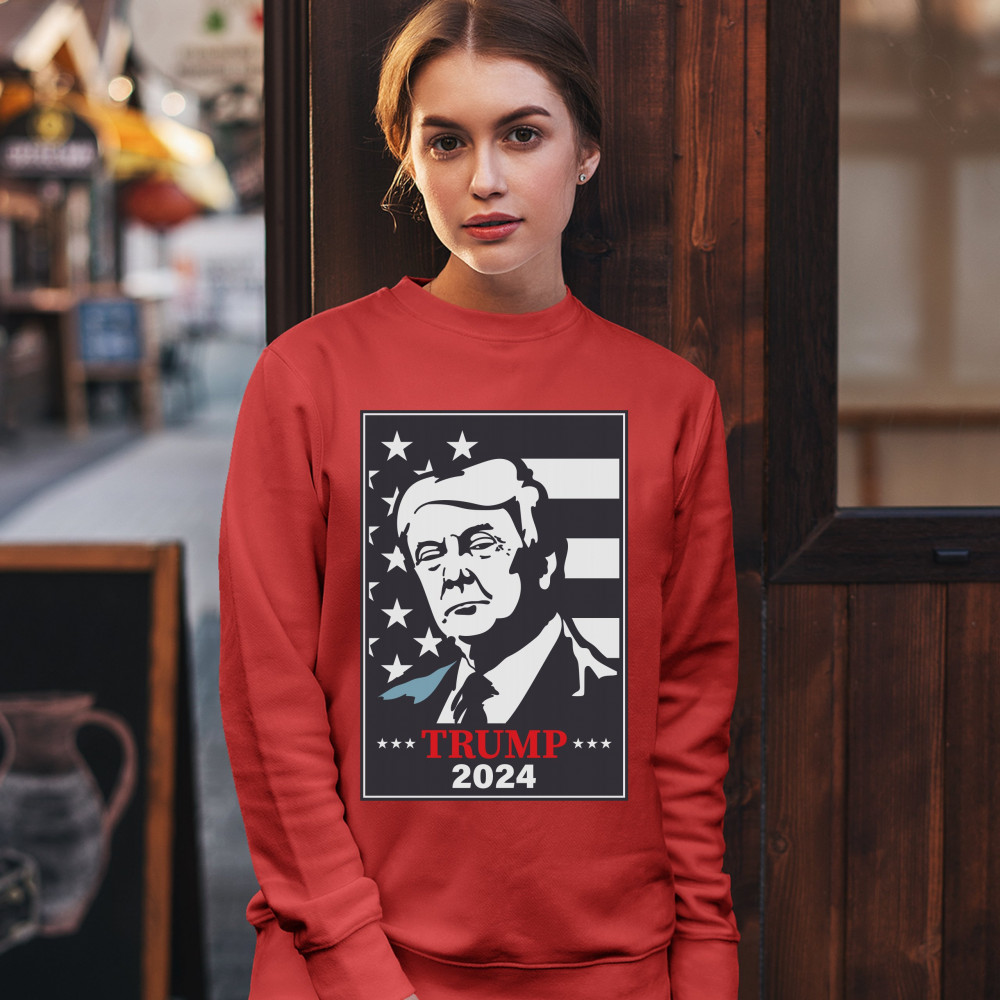 A political print featuring Donald Trump with the American flag in the background. The print says: "Trump 2024". A great choice to show your support for Donald J. Trump - the 45th president of the USA!
