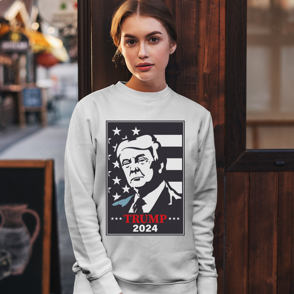 A political print featuring Donald Trump with the American flag in the background. The print says: "Trump 2024". A great choice to show your support for Donald J. Trump - the 45th president of the USA!
