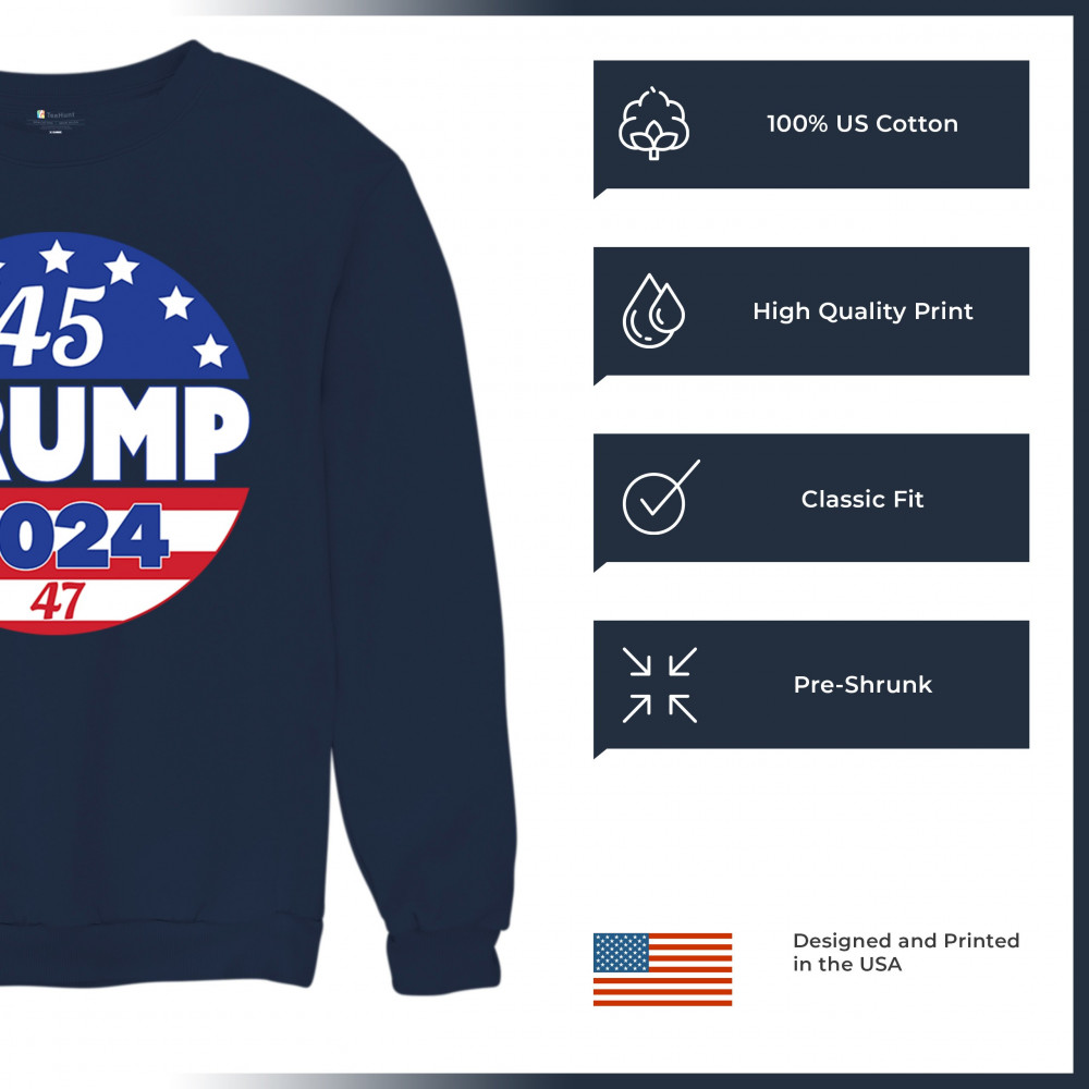 Embrace your conservative pride with this bold "45 TRUMP 2024" design. Representing America First, Republican victory, and the people’s mandate, it’s the perfect way to showcase your support for Donald J. Trump’s historic journey to the 47th presidency. Whether at rallies, political events, or casual outings, this emblem unites Trump supporters in a fight for freedom and patriotism.