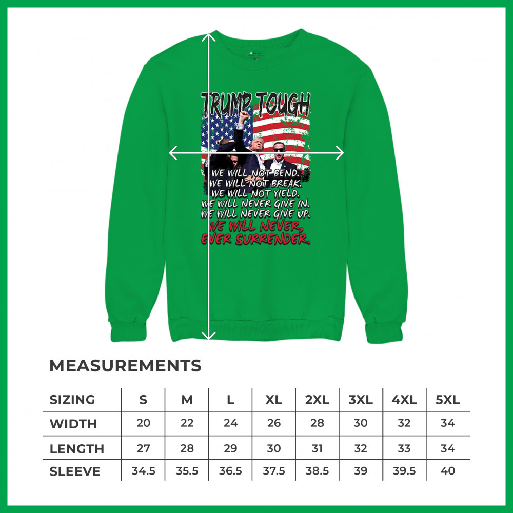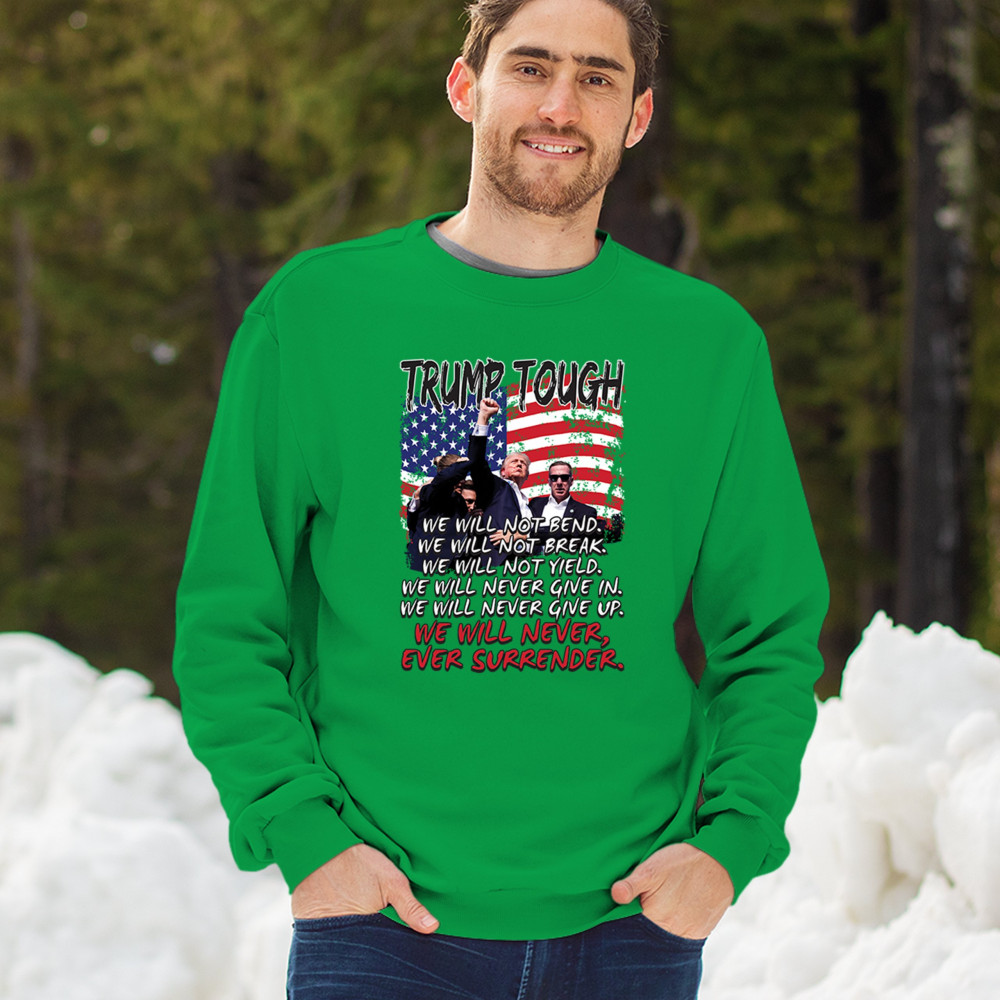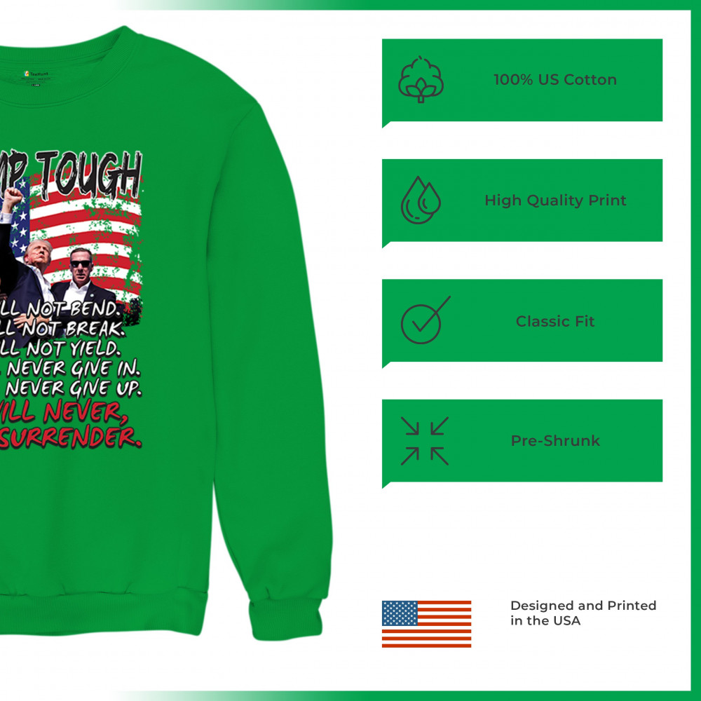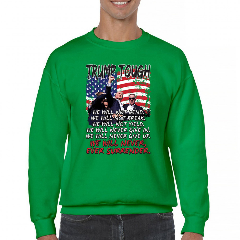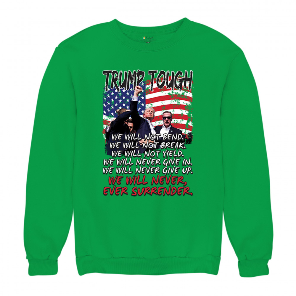 Express your support for Trump 2024 with this bold, patriotic design featuring the American flag and a powerful message. Never surrender your values.