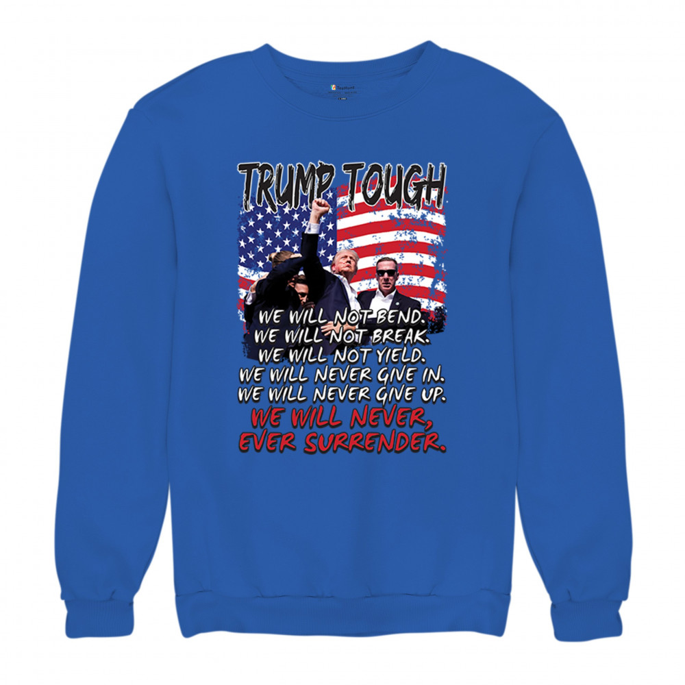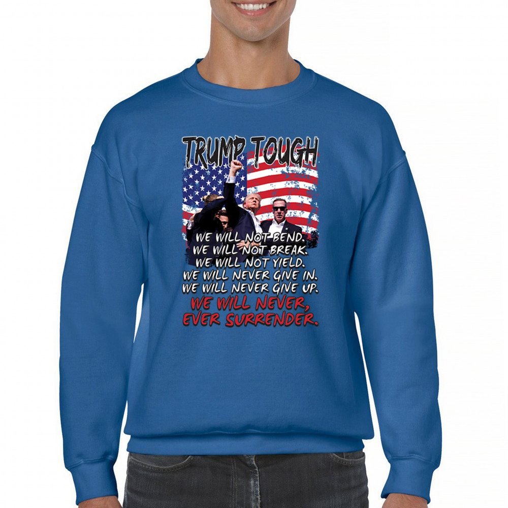 Express your support for Trump 2024 with this bold, patriotic design featuring the American flag and a powerful message. Never surrender your values.