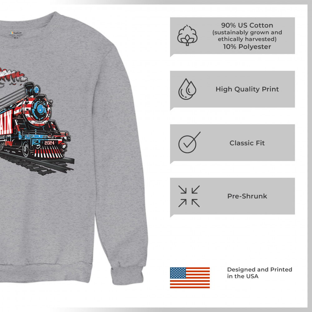 Hop on the Trump Train and support America First! This bold, patriotic tee is perfect for Republicans, conservatives, and the Red Wave movement.