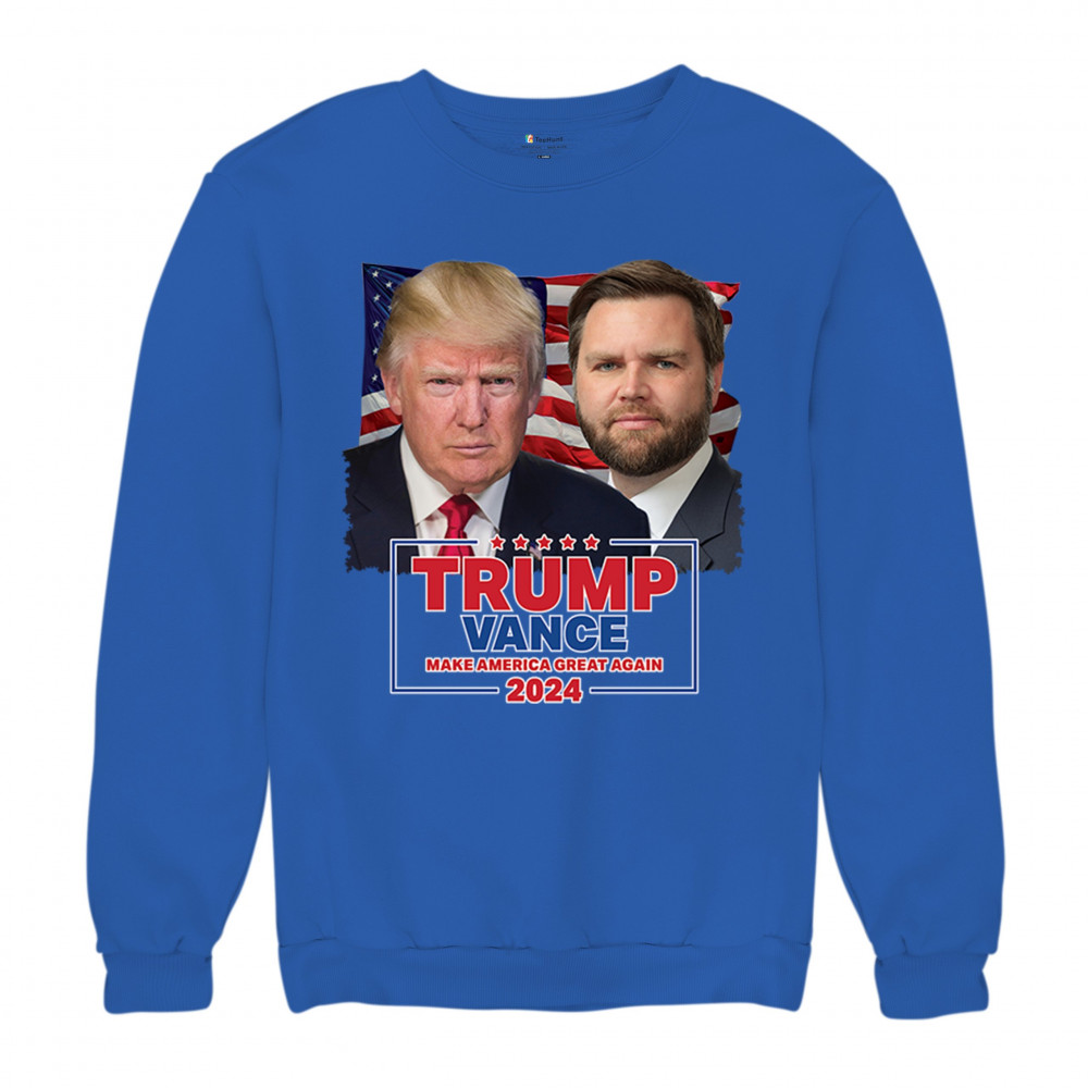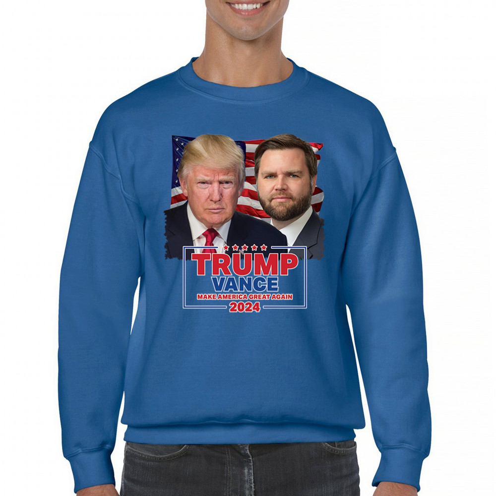 Show your support for Trump-Vance 2024 with this bold design featuring Trump and Vance against the American flag. Perfect for rallies and political events.