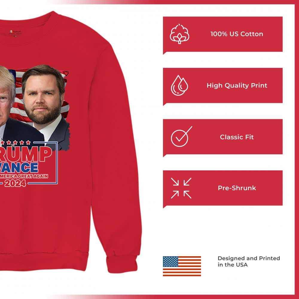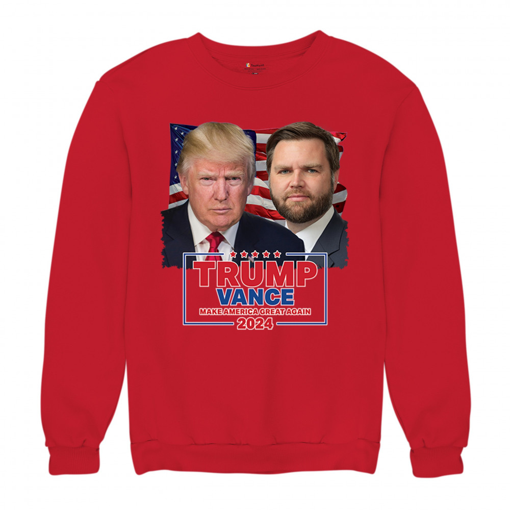 Show your support for Trump-Vance 2024 with this bold design featuring Trump and Vance against the American flag. Perfect for rallies and political events.