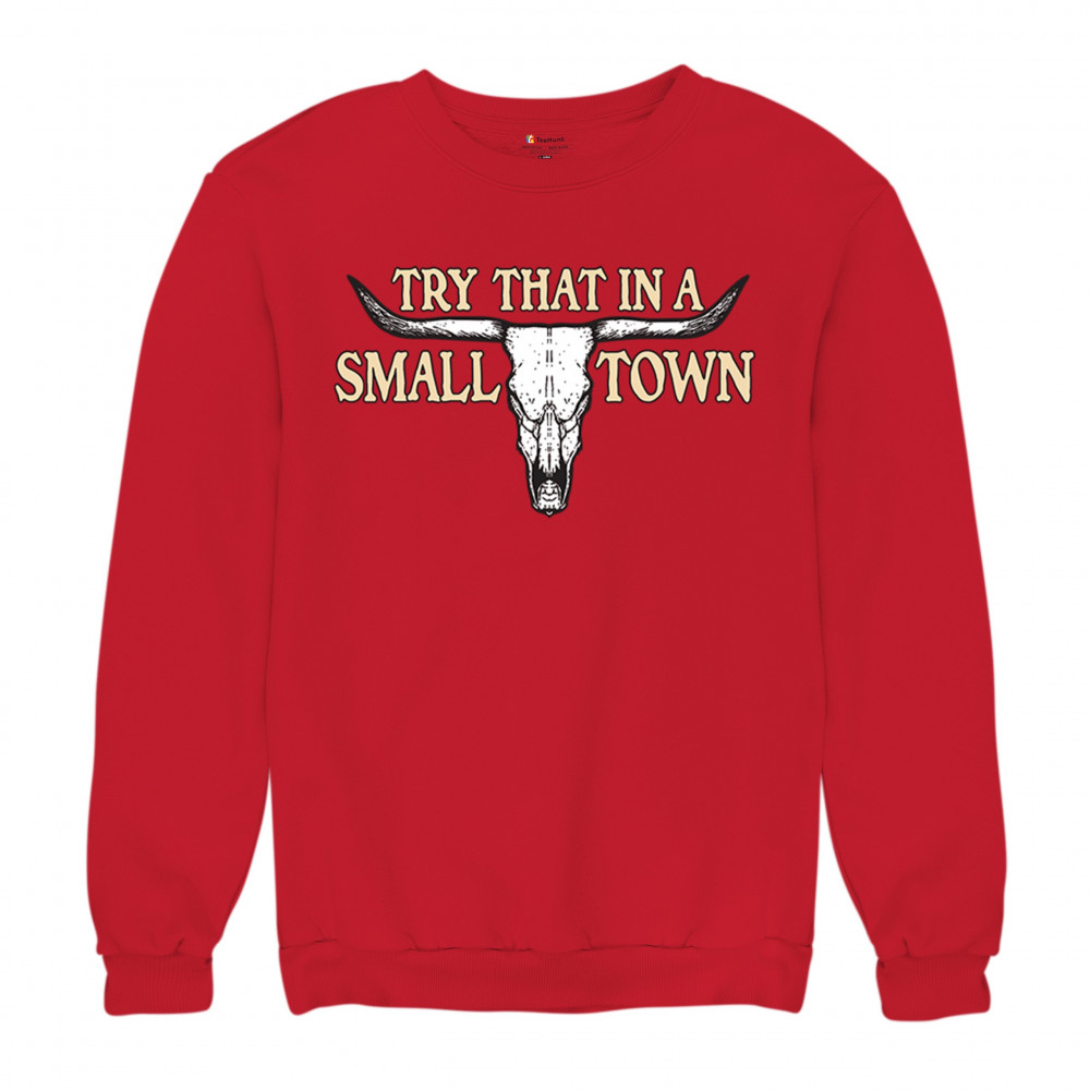 This design boldly proclaims "Try That in a SMALL TOWN," set against the backdrop of a stark cattle skull—a symbol deeply rooted in southern heritage and the undying American spirit. It's a tribute to the small-town sheriffs, the unwritten laws of backbone and duty, and the patriotic fervor that runs through the country's veins. Whether you're a motorcycle enthusiast, a Republican, or simply a connoisseur of all things vintage, this piece is a testament to enduring strength and local pride.