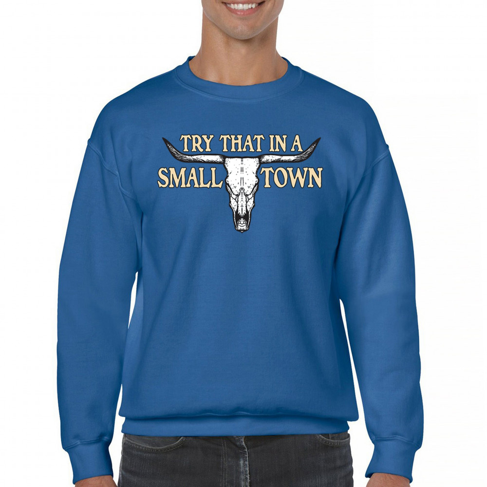 This design boldly proclaims "Try That in a SMALL TOWN," set against the backdrop of a stark cattle skull—a symbol deeply rooted in southern heritage and the undying American spirit. It's a tribute to the small-town sheriffs, the unwritten laws of backbone and duty, and the patriotic fervor that runs through the country's veins. Whether you're a motorcycle enthusiast, a Republican, or simply a connoisseur of all things vintage, this piece is a testament to enduring strength and local pride.