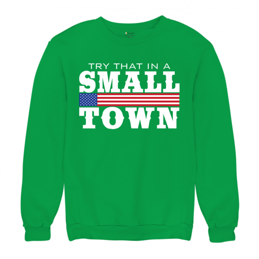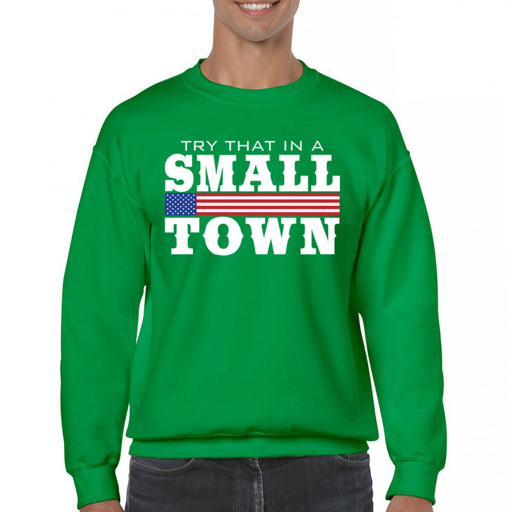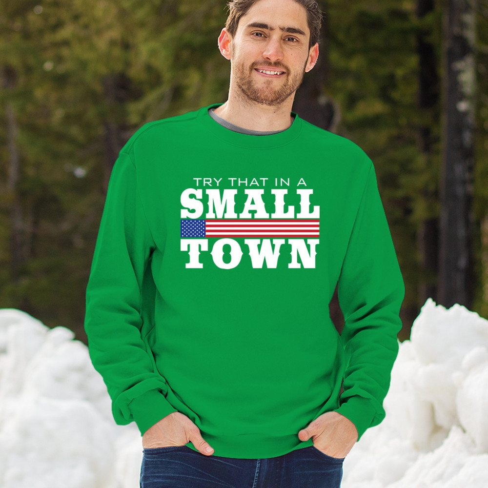 Celebrate small-town pride with our "Try That In A Small Town" design. Perfect for patriotic events, it features a bold American flag graphic.