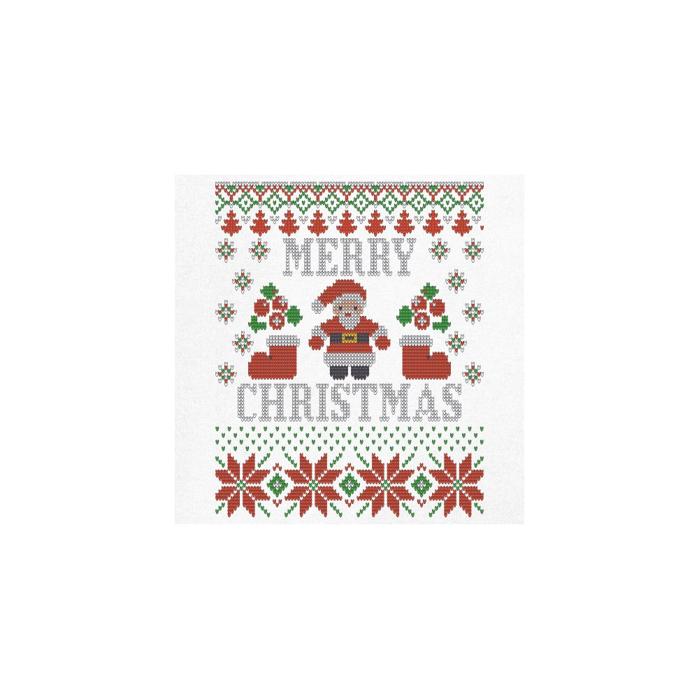 A print saying: "Merry Christmas" and depicting Santa Claus, two Christmas socks, multiple snowflakes and Christmas trees. The print is decorated as an ugly sweater. A great choice for a Christmas eve celebration.
