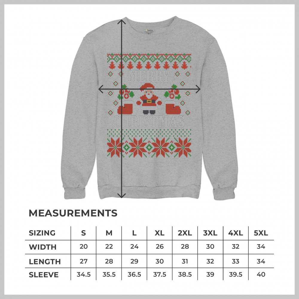 A print saying: "Merry Christmas" and depicting Santa Claus, two Christmas socks, multiple snowflakes and Christmas trees. The print is decorated as an ugly sweater. A great choice for a Christmas eve celebration.