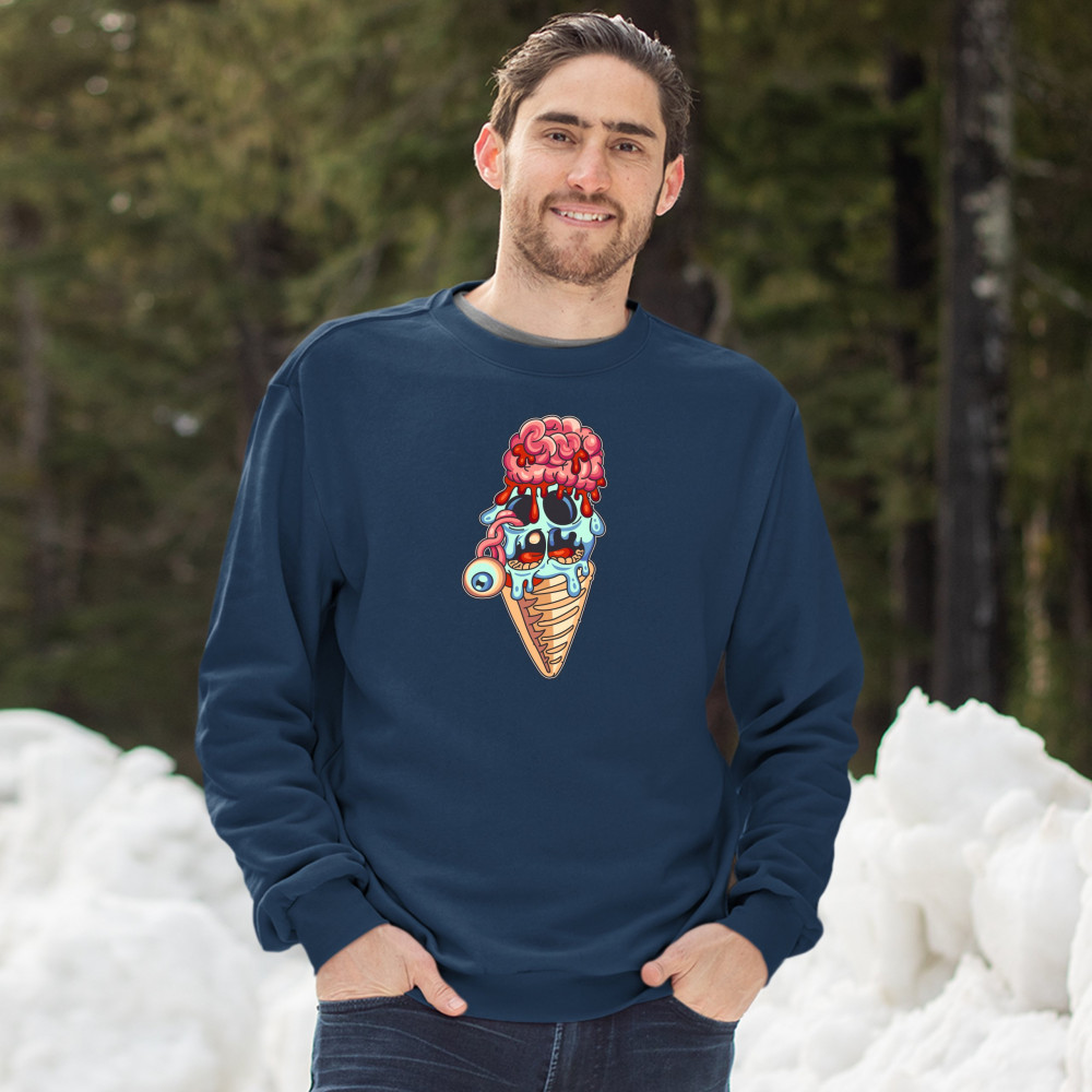 A print featuring an undead ice cream. The ice cream ball looks like a head of a zombie with an eye popping out and hanging and bloodied brains attached on top. A great choice for a person who is into horror movies, haunted houses and freaking people out!