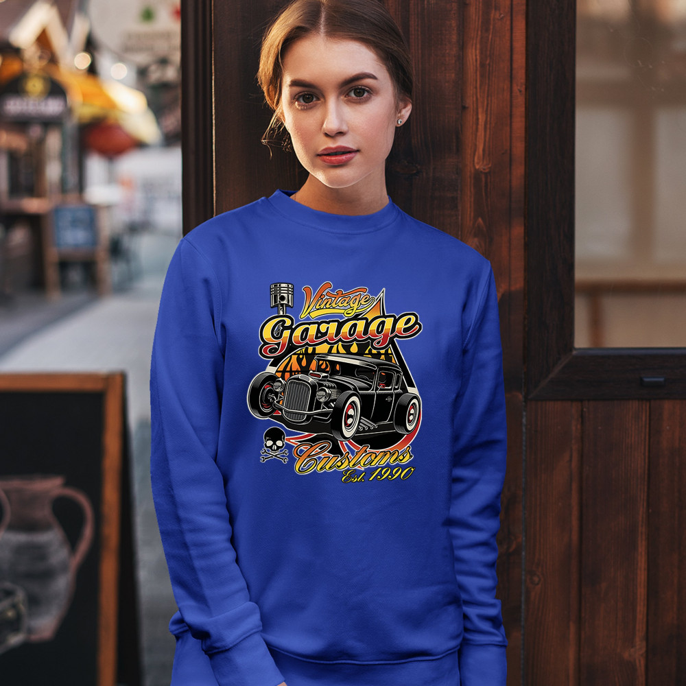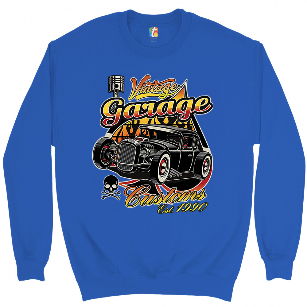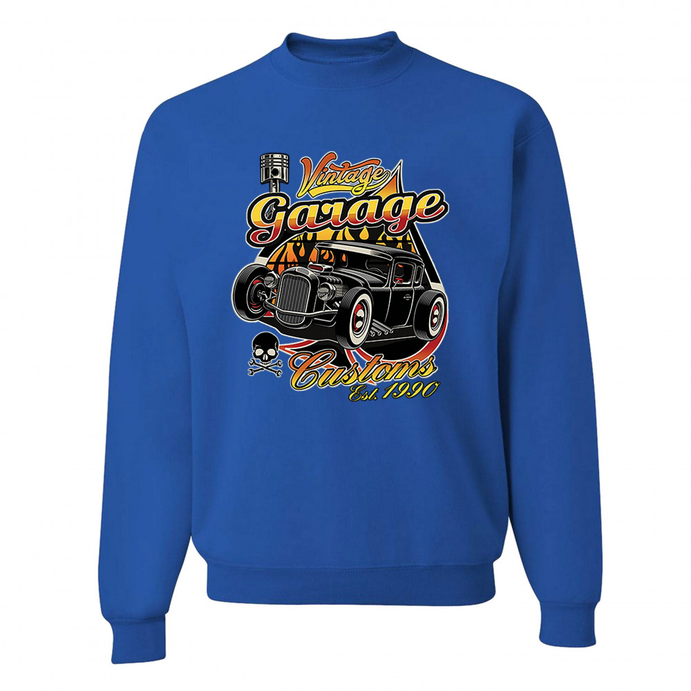 VINTAGE GARAGE CUSTOMS EST. 1990 sweatshirt old school retro hot rod crewneck royal blue